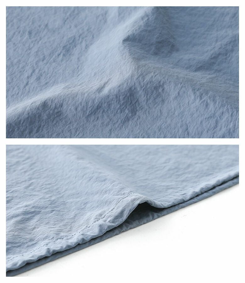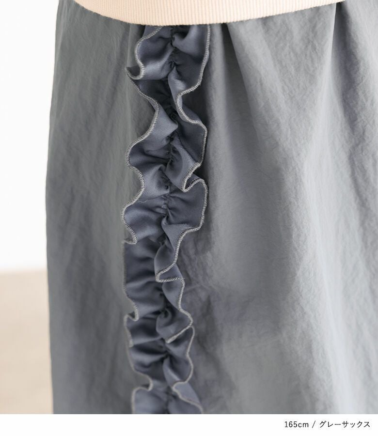 本体はシャカシャカとしたナイロン生地を使用。フリル部分は少し透け感のある上品な生地感で大人っぽさをプラスします。