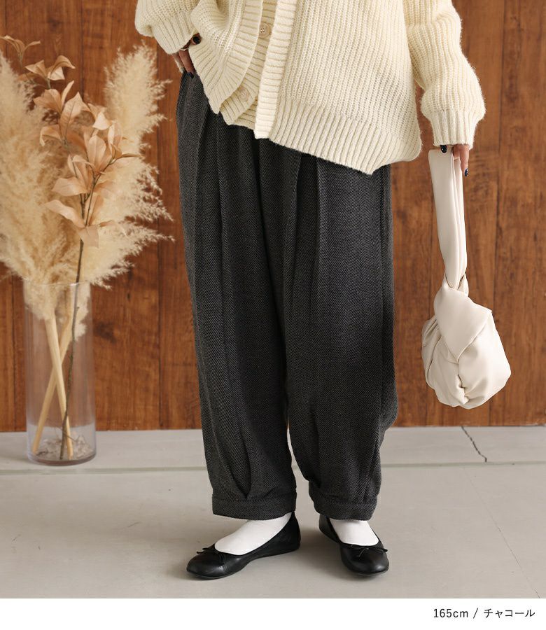 ヘリンボーン柄がシーズンムード高まるコクーンパンツ。腰回りやヒップはゆるっと、裾にかけて緩やかにすぼまるシルエットですっきり見えする効果も。