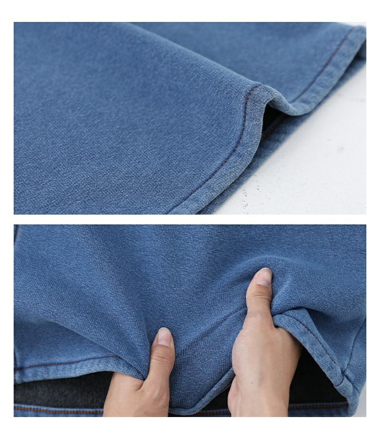 裏シャギーニットデニム生地を使用。表地と裏地を貼り合わせた生地ではないため、ハリ感がなく着ぶくれしにくい厚みで、落ち感のあるきれいなシルエットを実現します。