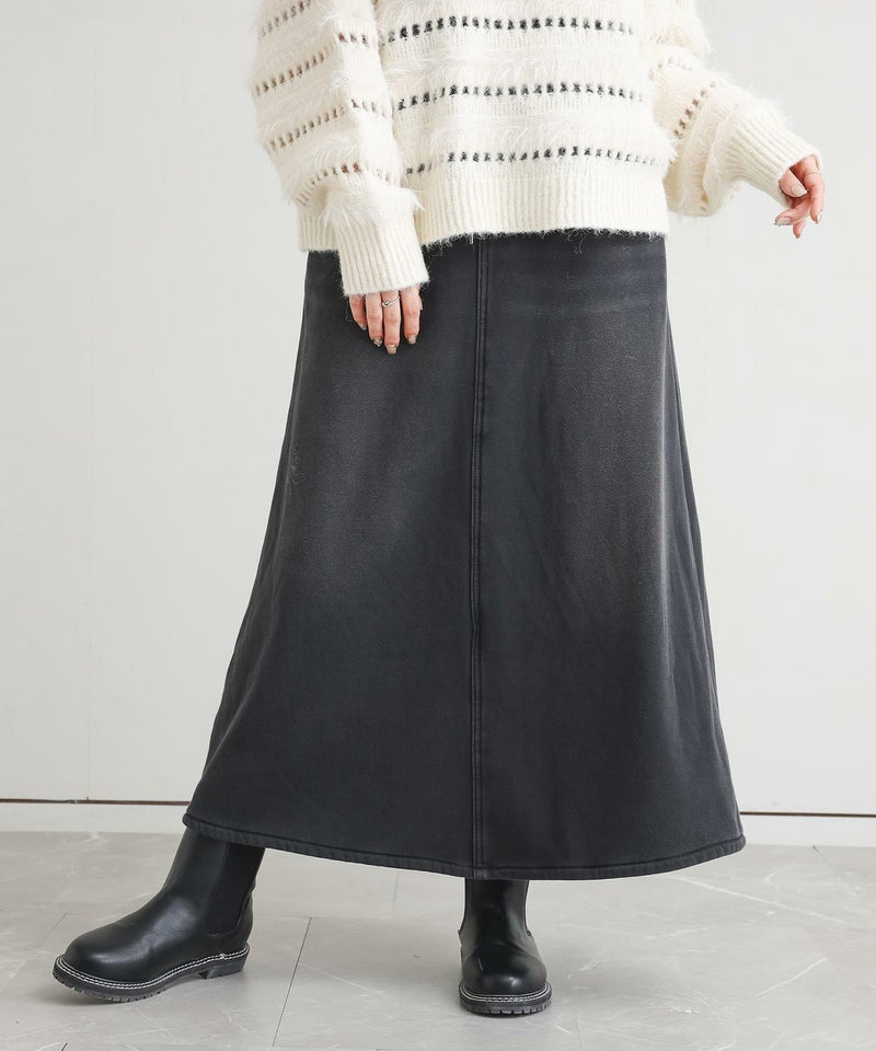 ヴィンテージ感のある加工を施した、見た目はデニムながら裏側がシャギーであたたかいデニムスカート。後ろにスリットが入っており、動きやすいデザインです。
