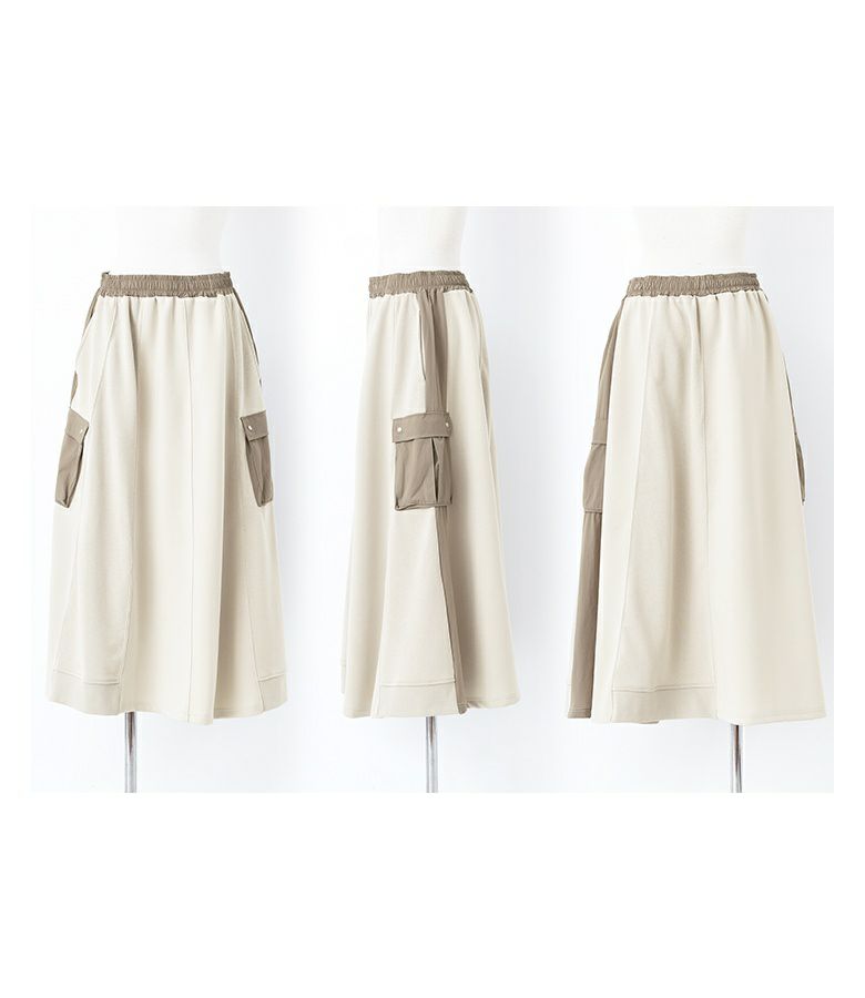 異素材切り替えデザインのロングスカート。異素材の組み合わせと大き目のポケットがポイントになるデザインです。カジュアルな雰囲気を持ちながらも、スポーティーな印象の中に女性らしい柔らかな雰囲気と、洗練されたこなれ感をプラスしています。