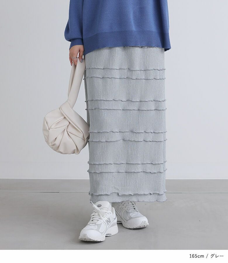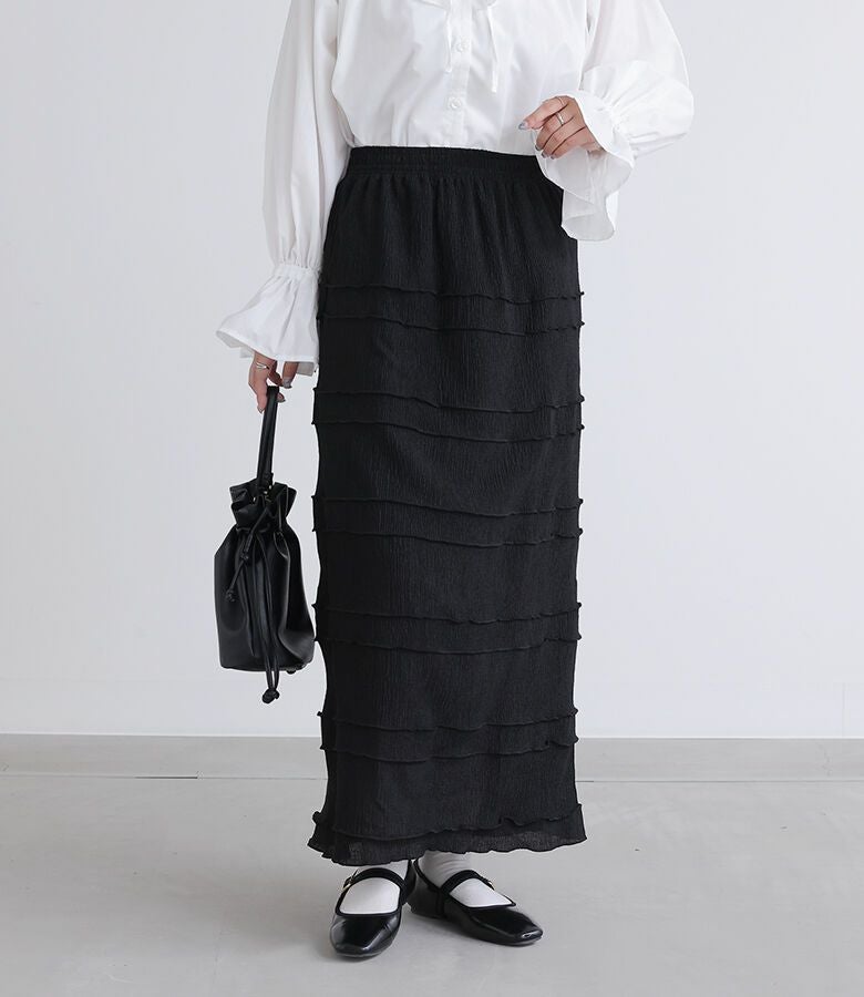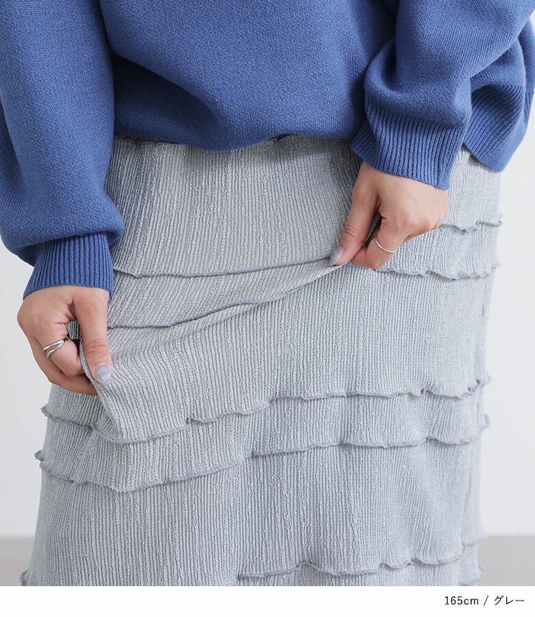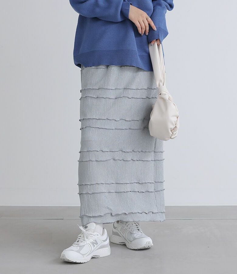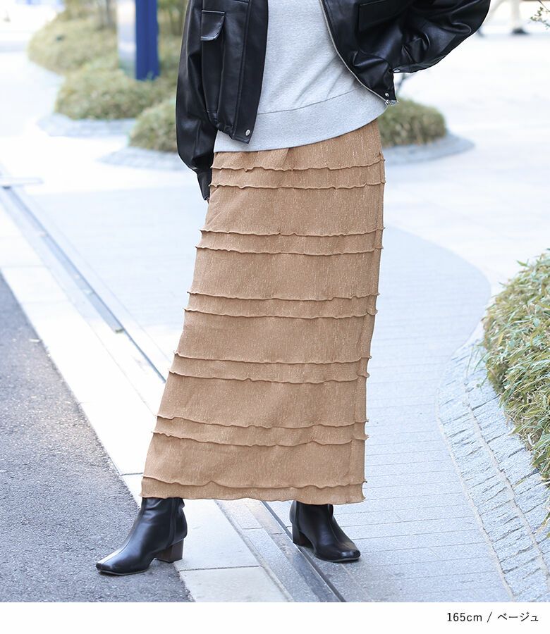 横に入れたメローデザインが特徴のナロースカート。すっきりとしたシルエットで女性らしく、カジュアルにもキレイめにも着ていただけます。