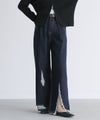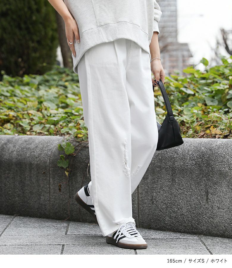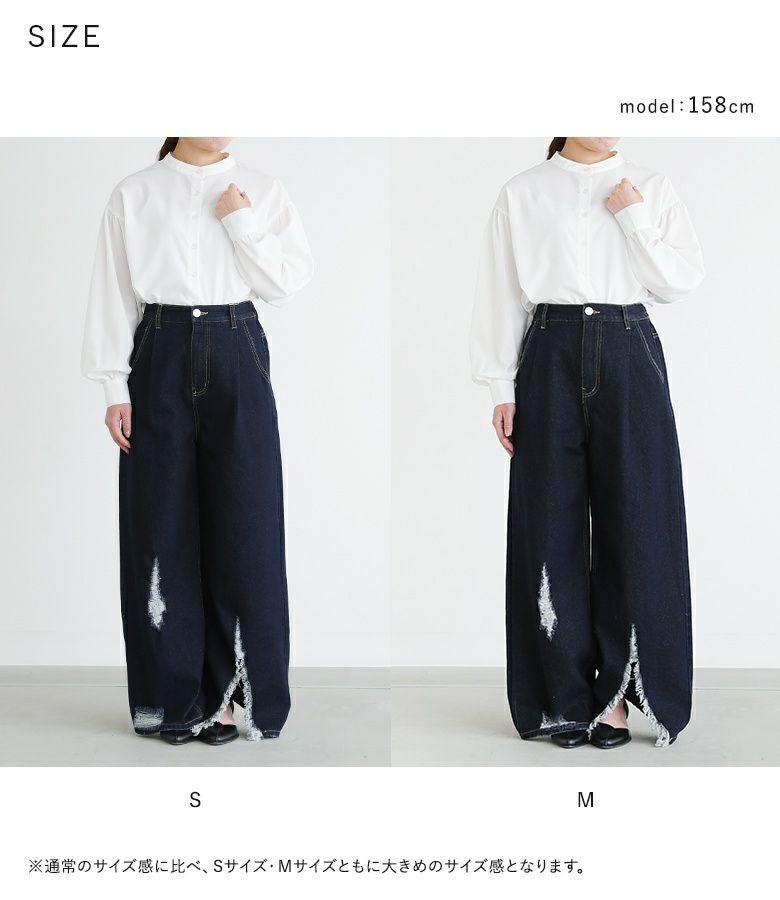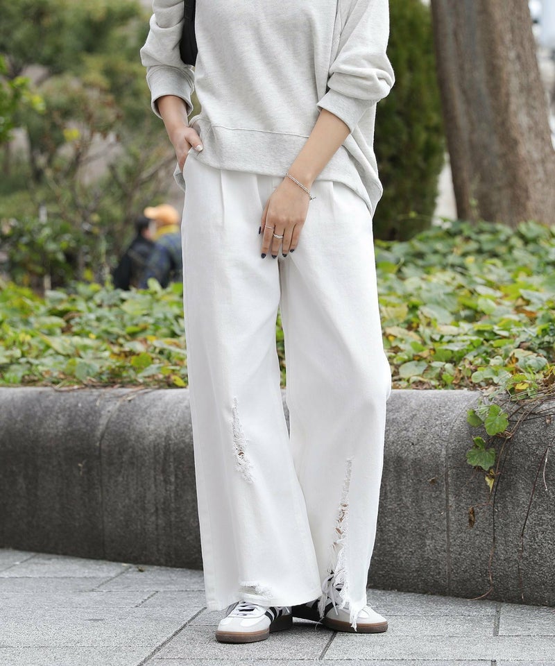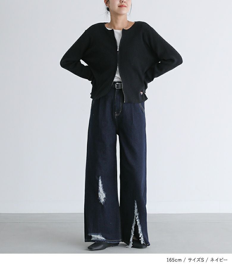 アシンメトリーのリップドデザインが魅力のデニムパンツ。カジュアルでありながらも風合いのある女性らしい肌見せで、大人カジュアルのスタイルに重宝します。ワイド風の裾デザインで脚長効果も期待できる一着です。