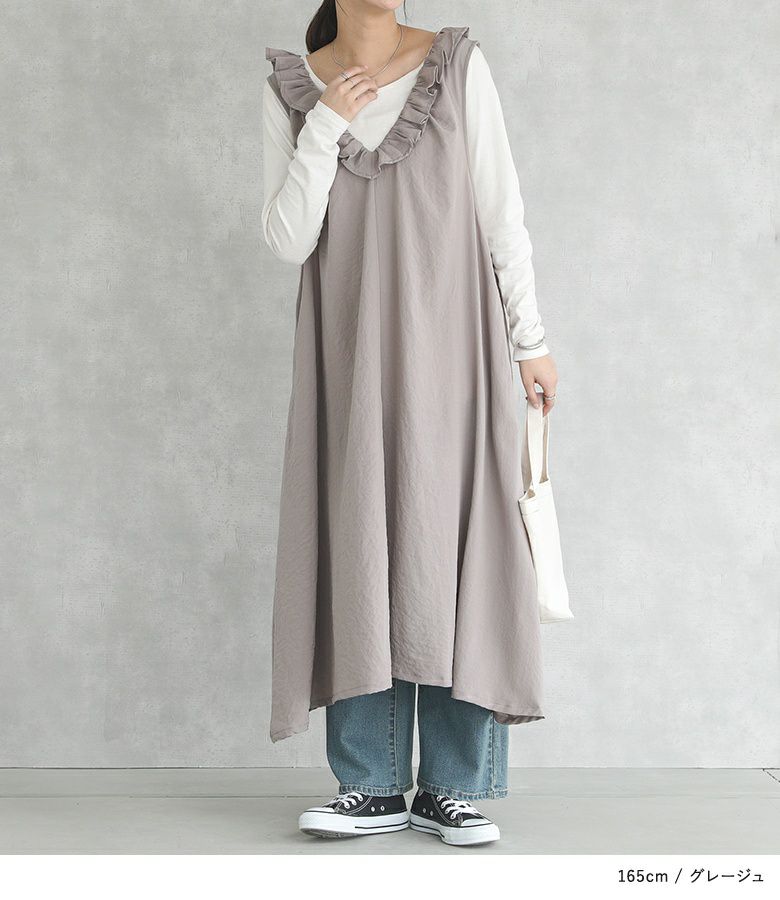 肩のフリルが大人可愛い雰囲気を演出するジャンパースカート。フリルは派手すぎず、デイリーコーデにも取り入れやすいのが特徴です。