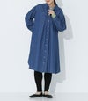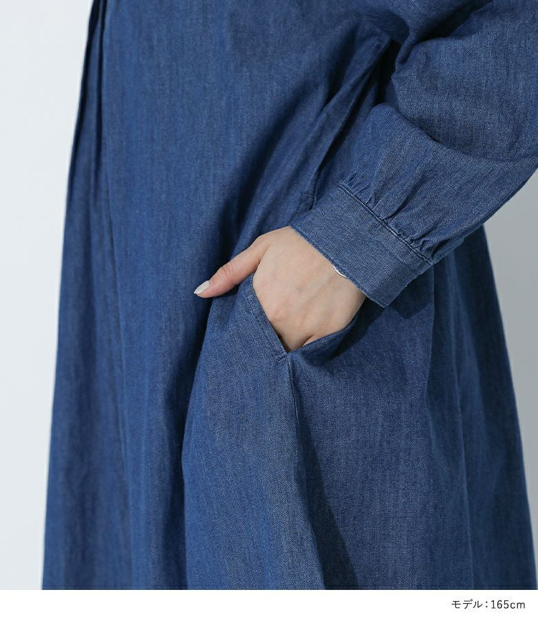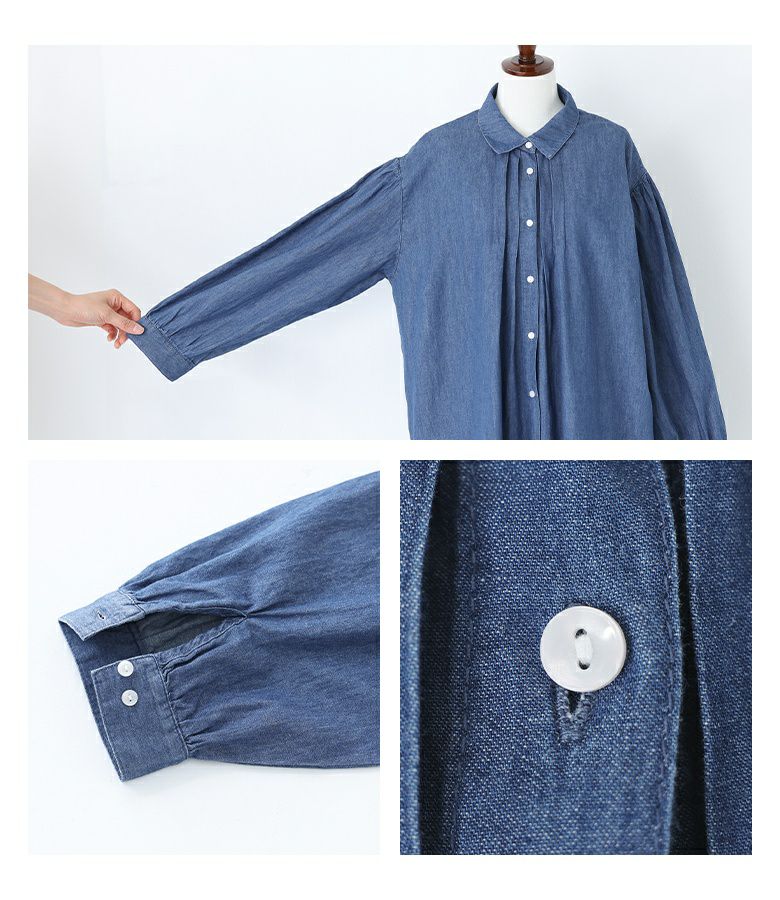 胸元と背中のタックがアクセントになったデニムシャツワンピース。縦ラインのタックは綺麗なドレープ感を生み出し、表情豊かな印象に。袖にもタックが入っており、丸みのあるシルエットが女性らしさを演出します。裾はカーブデザインで抜け感をプラスします。