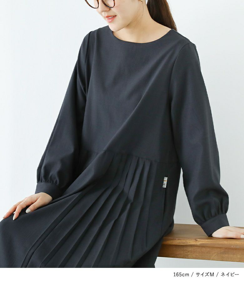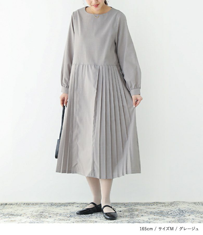 シンプルで上品な雰囲気があるプリーツワンピース。首周りをスッキリ見せてくれるクルーネックデザインです。