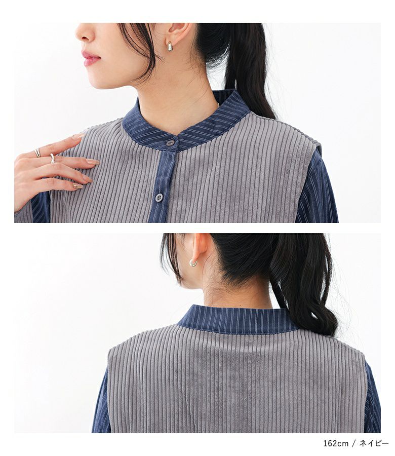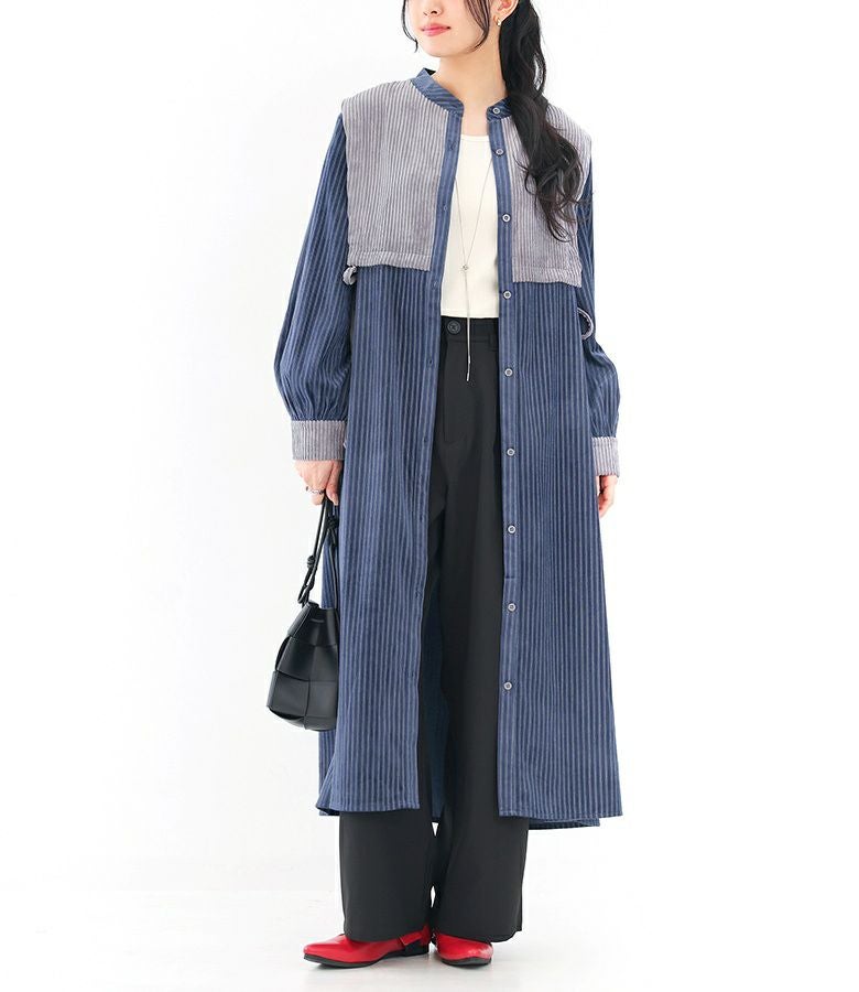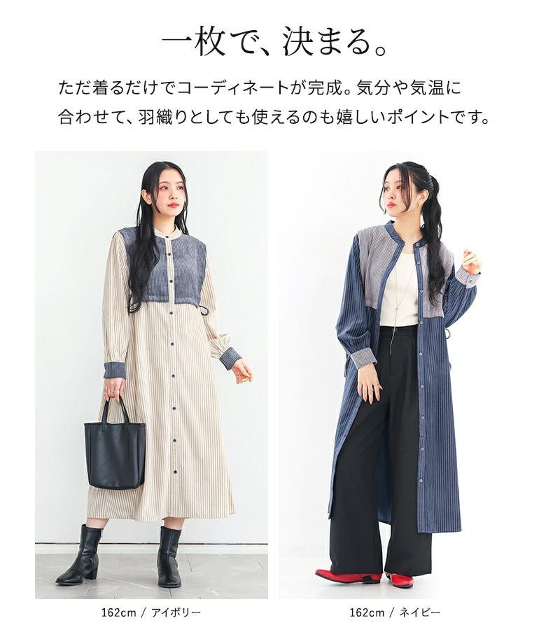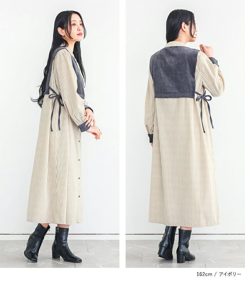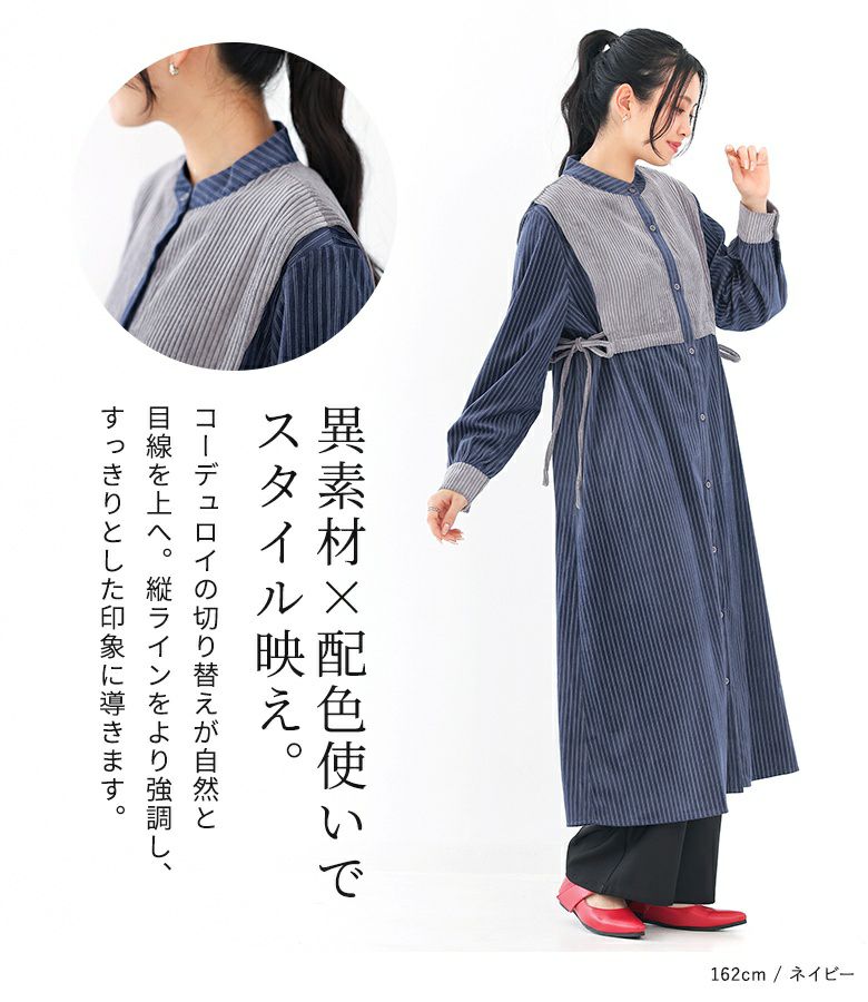 縦ラインですっきりとした印象のサイドリボン異素材ストライプワンピース。