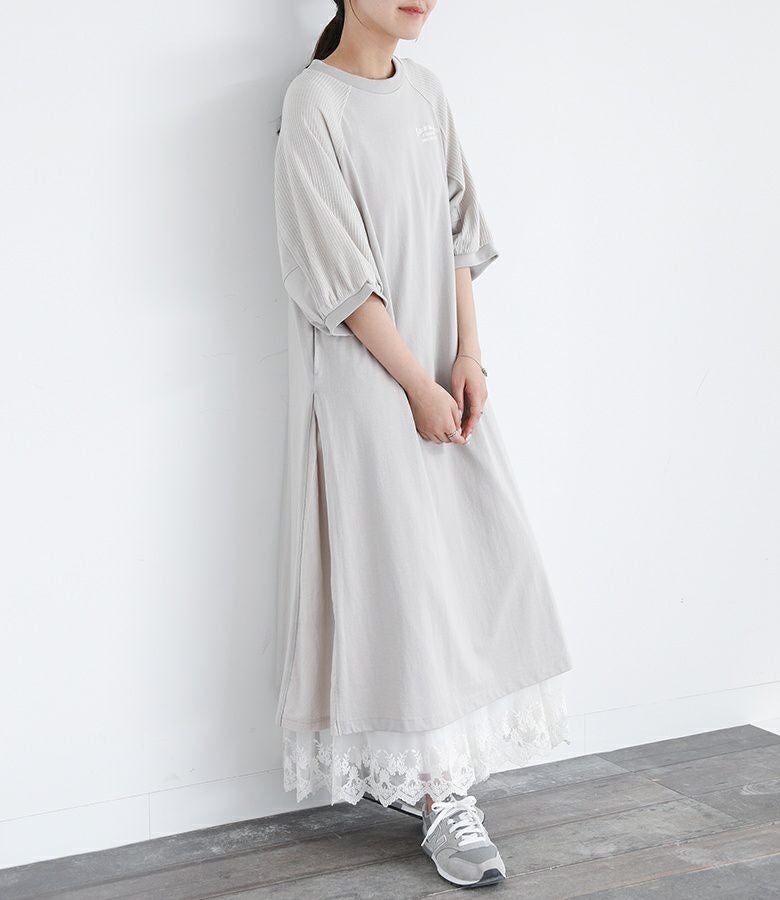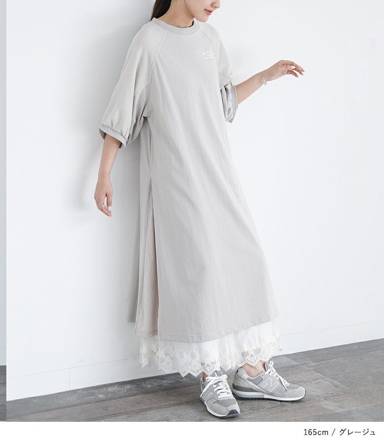 カジュアルな雰囲気にぽわん袖が女性らしさを惹きたてる異素材切替ワンピース。