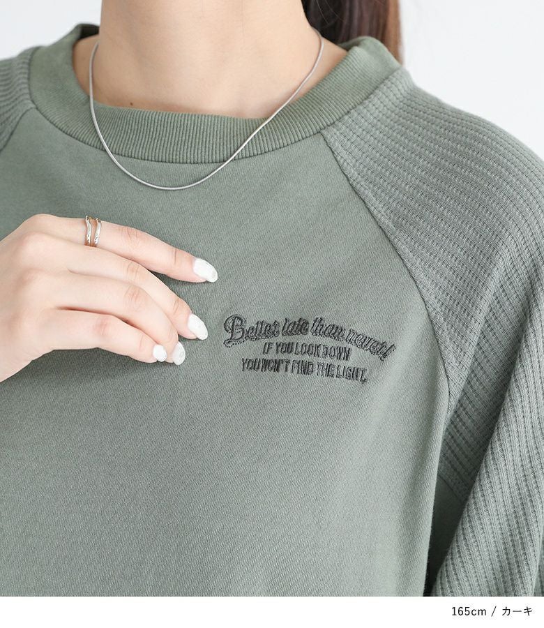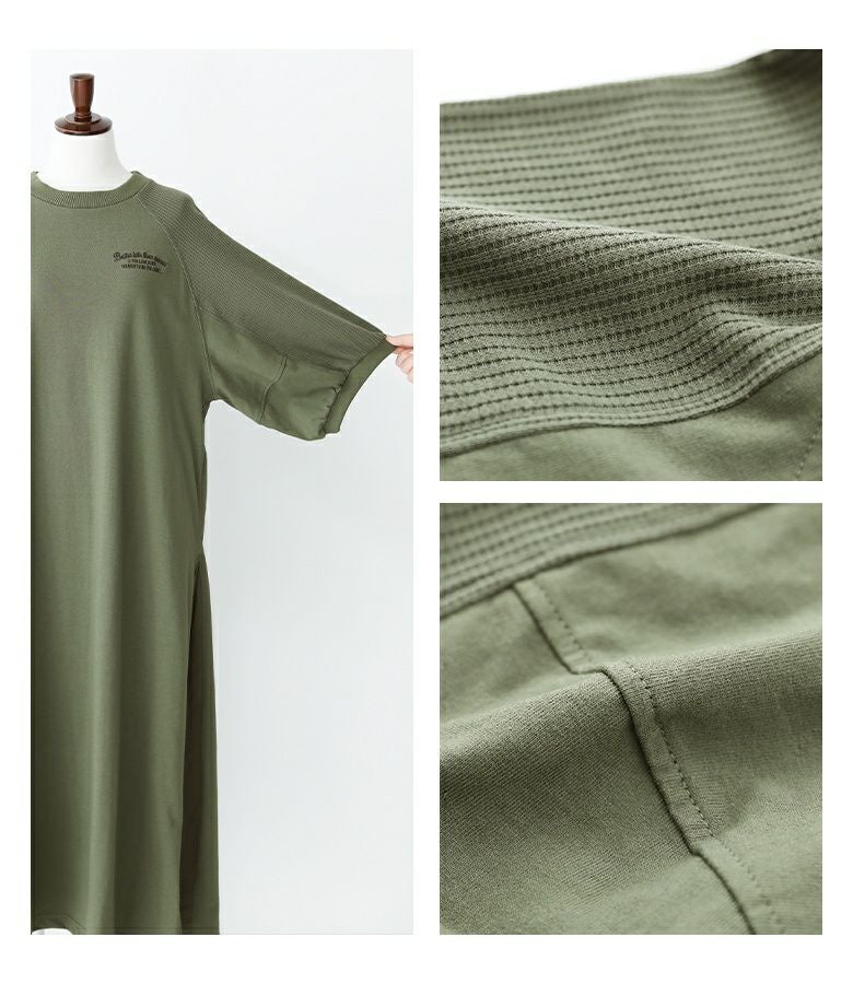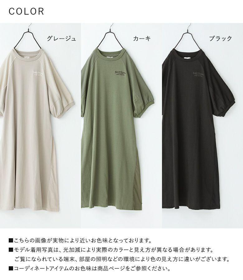 異素材切替ワンピース。カジュアルな雰囲気にぽわん袖が女性らしさを惹きたてるデザインです。ワッフル素材や別布をあしらった切替で周りと差のつく一着です。