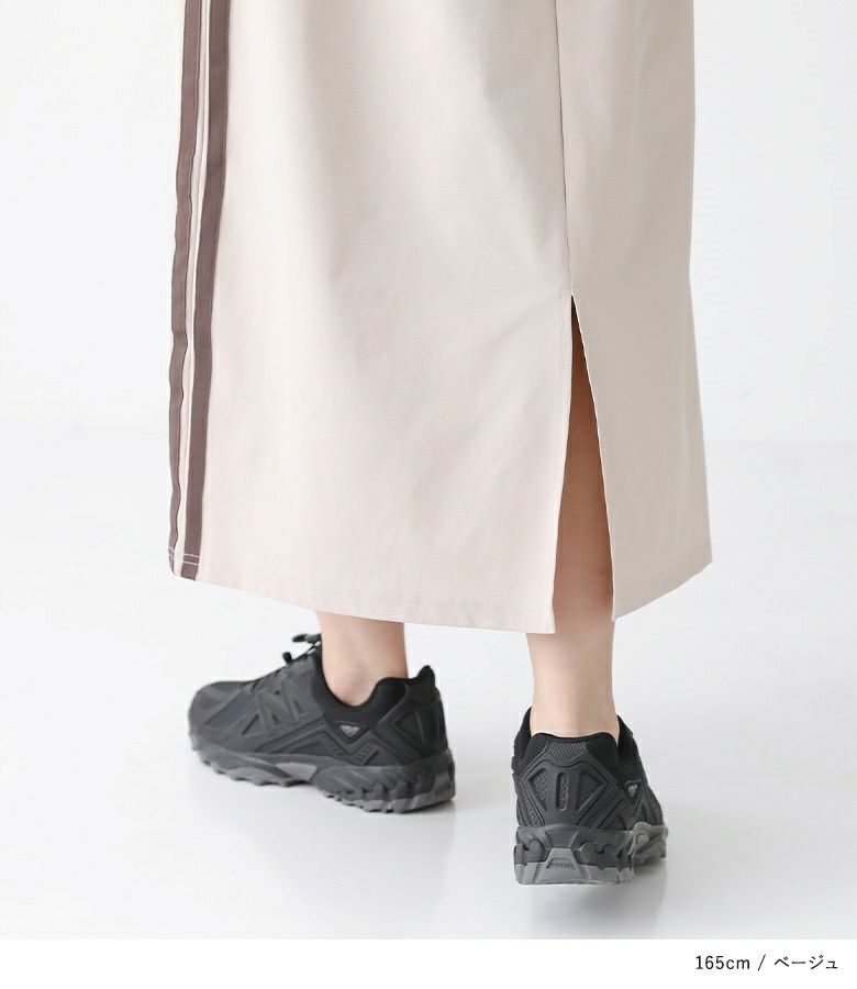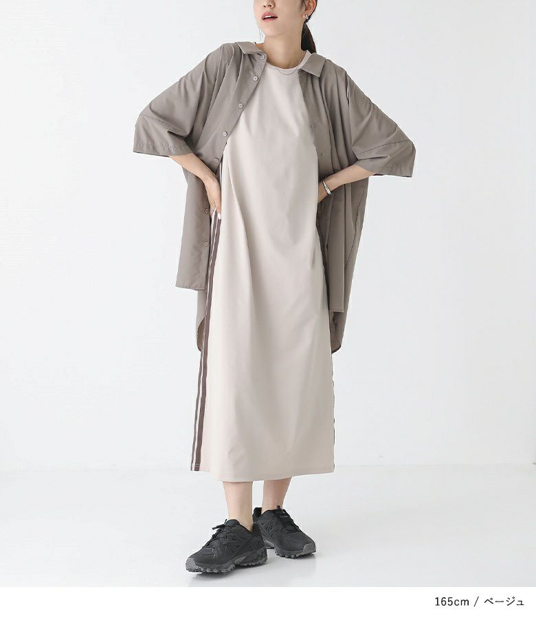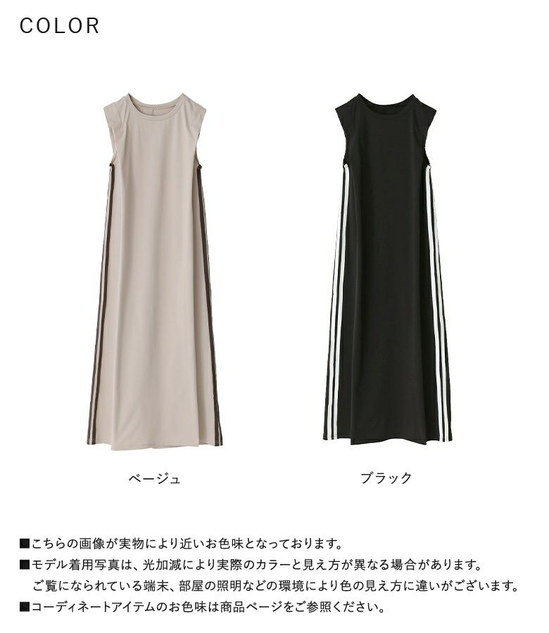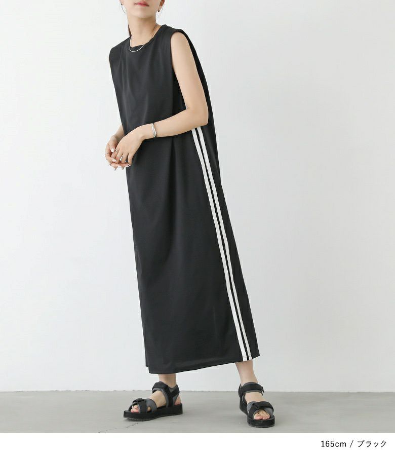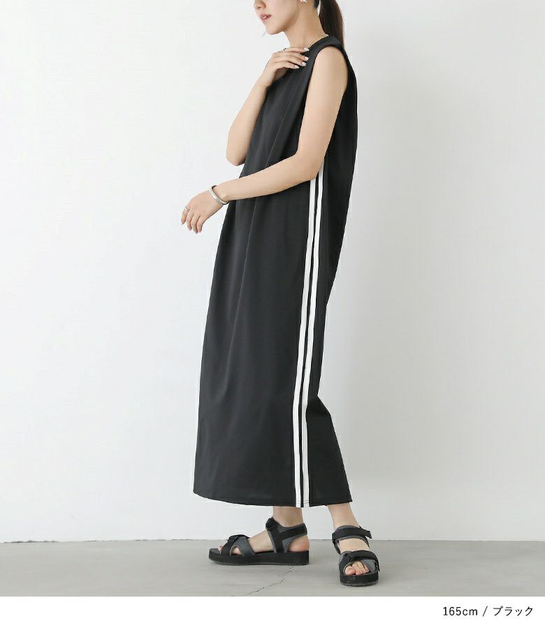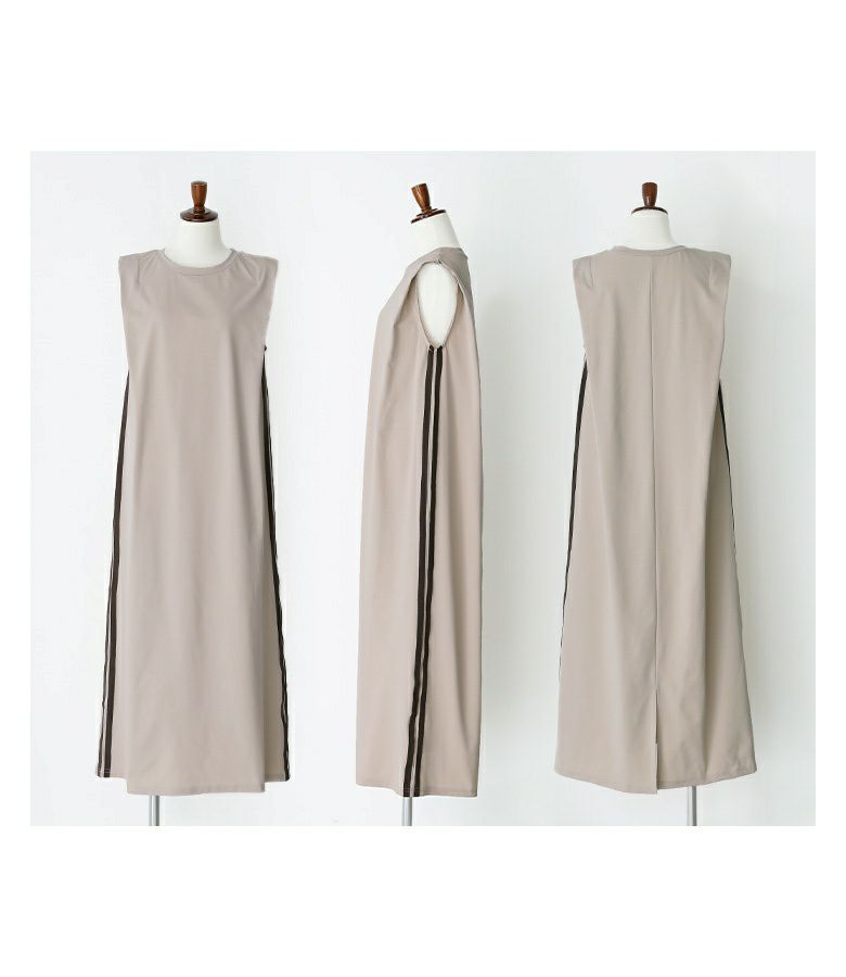 サイドに入ったラインがアクセントになったワンピース。肩部分にタックを入れることで肩から腕周りをさりげなくカバーしてくれスリーブレスですが華奢見えするのが嬉しいポイント。バッグにはスリット入りで、抜け感を出し足捌きが快適なデザインです。