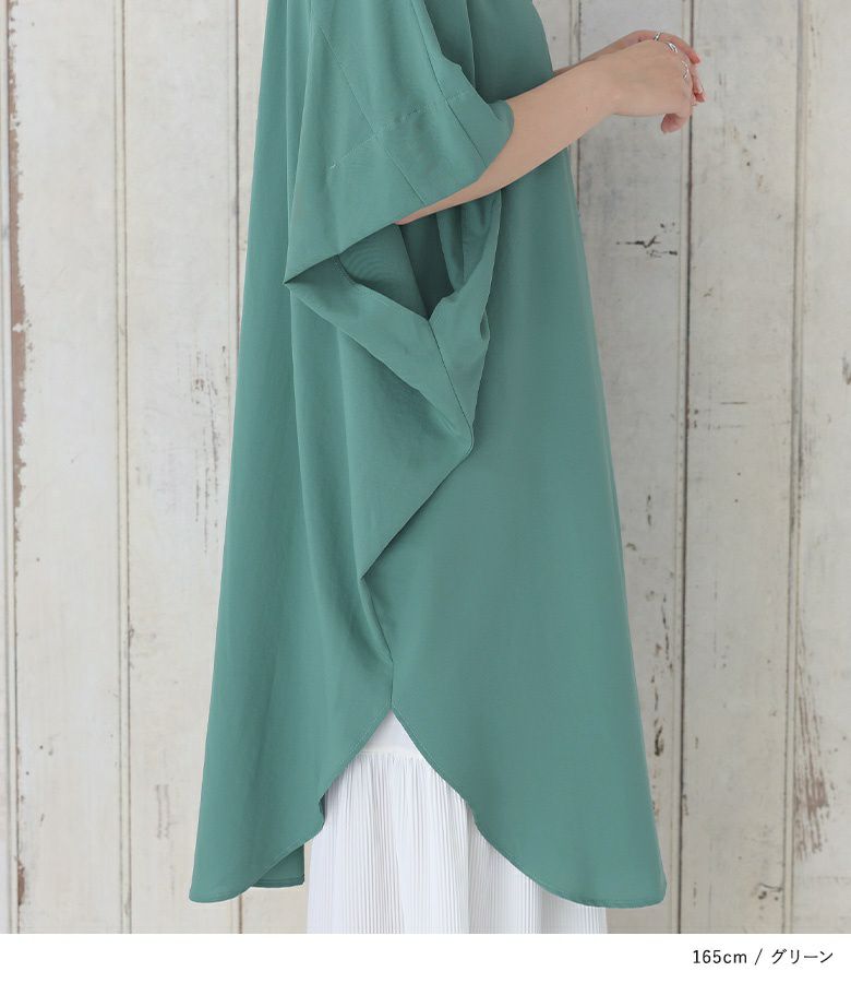 身体のラインを拾わないゆったりとしたポンチョ型シャツ。