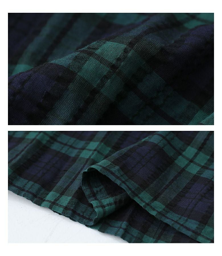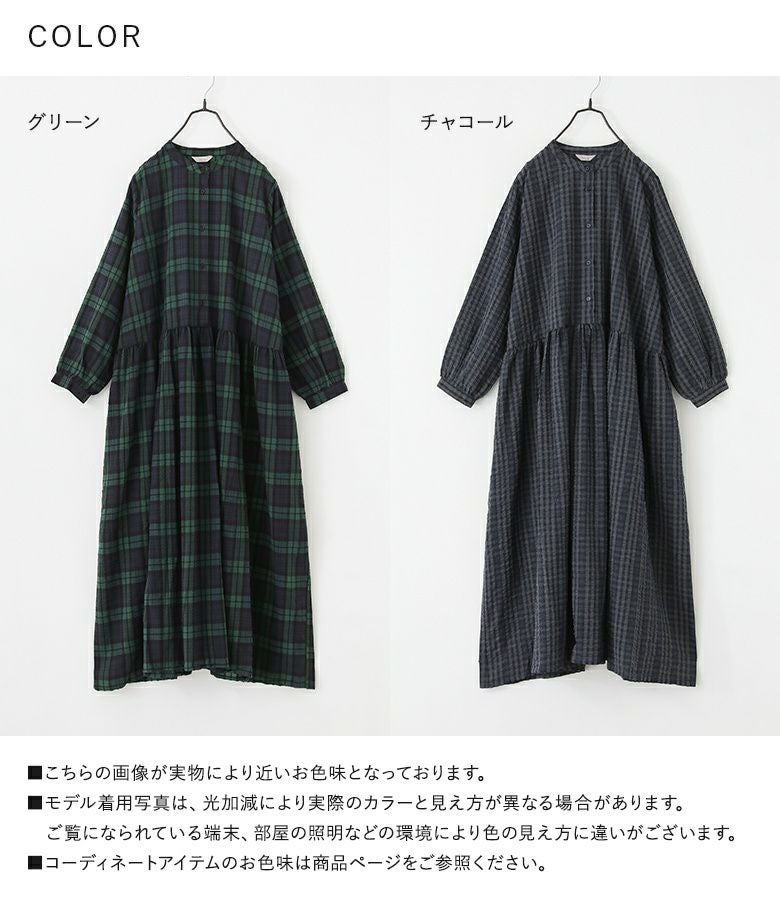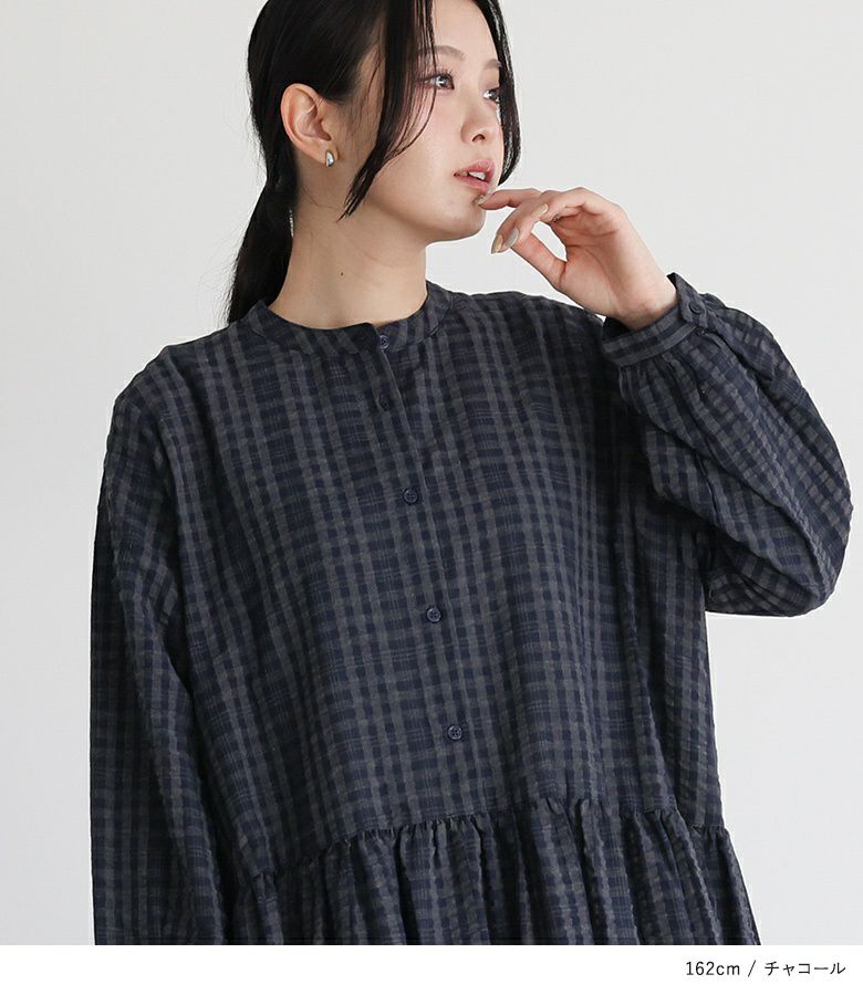 凹凸のあるサッカー生地がさらり心地よい、ゆったりシルエットのチェック柄ワンピース。8分丈袖なので、手元にニュアンスをプラスできます。1枚でサマになるのはもちろん、レイヤード次第で様々な表情を楽しめる万能アイテムです。
