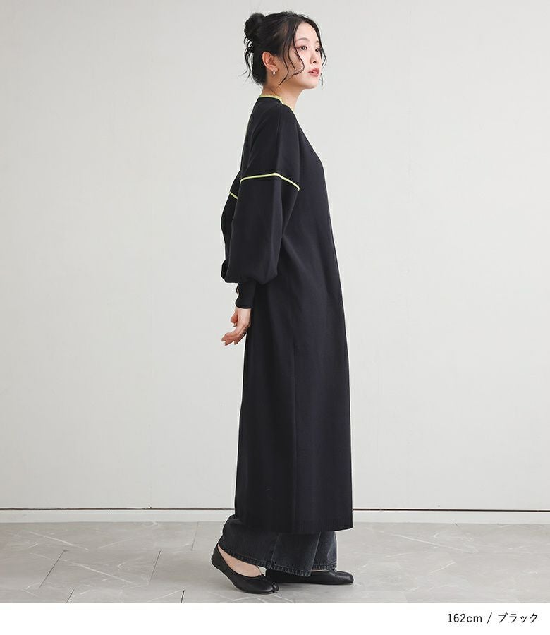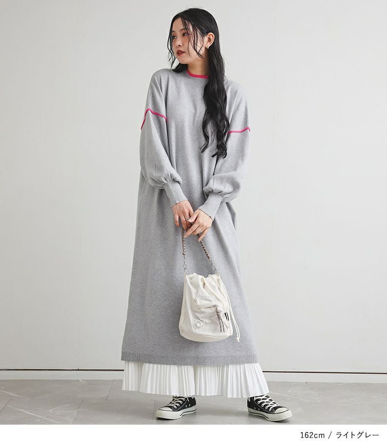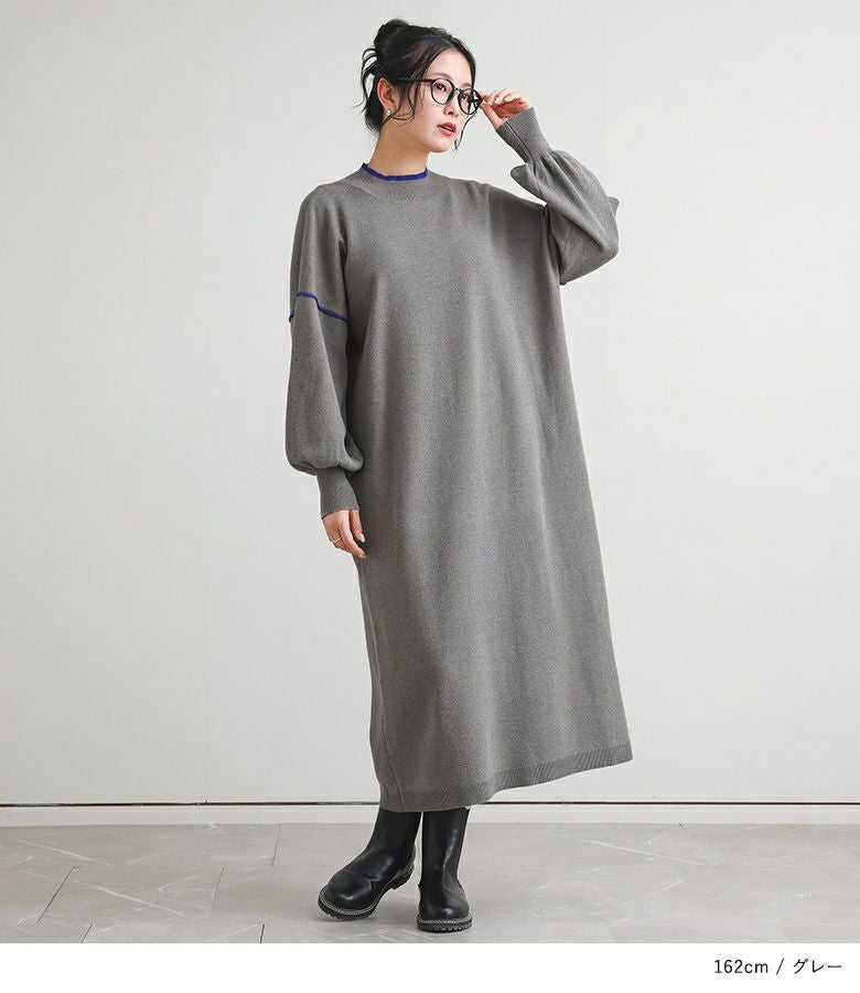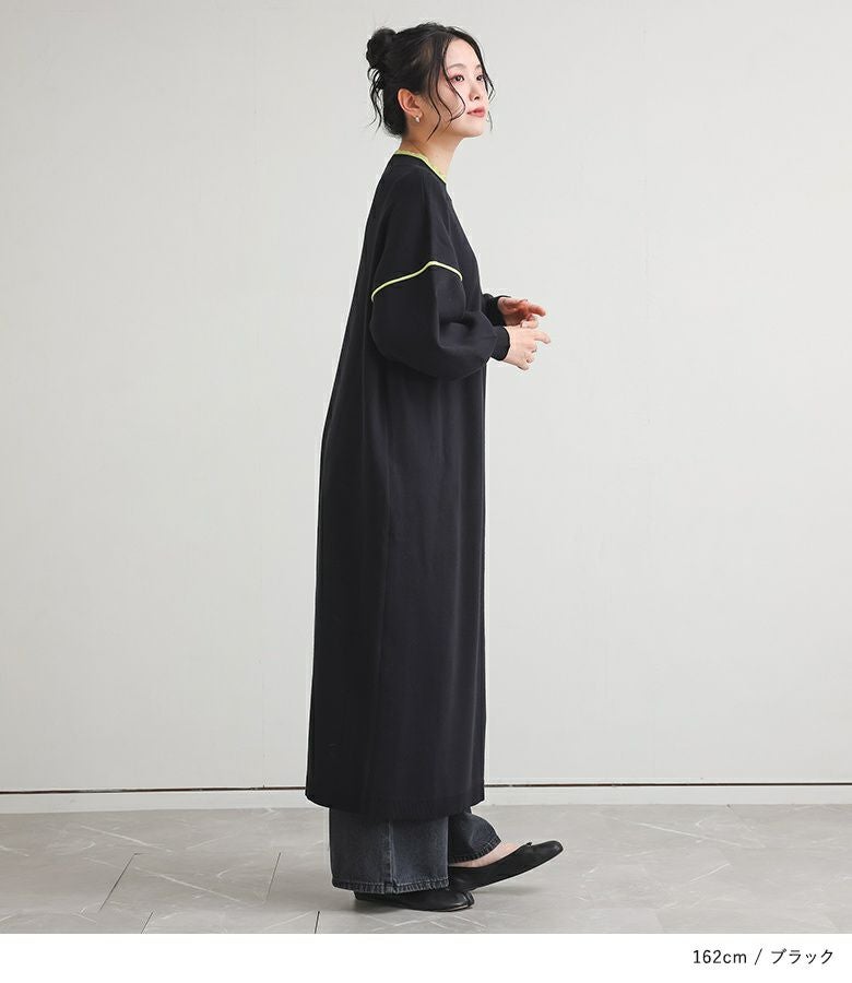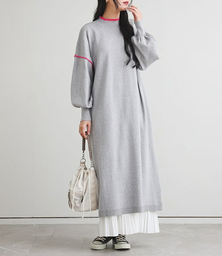 鮮やかなカラーの配色デザインニットワンピース。襟元と袖の配色デザインとバックスタイルにも縦に配色ラインが入ってすっきり見えが叶う優秀アイテムです。