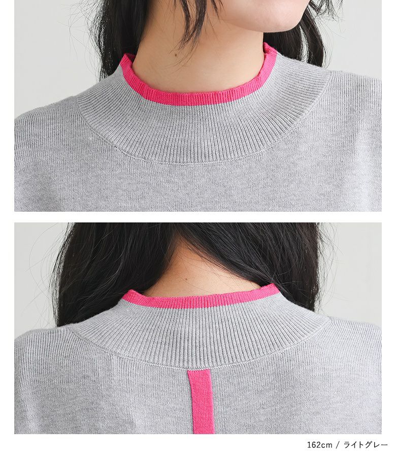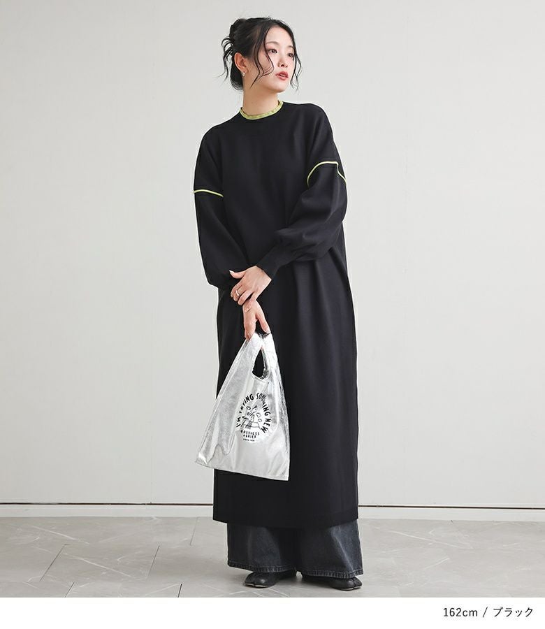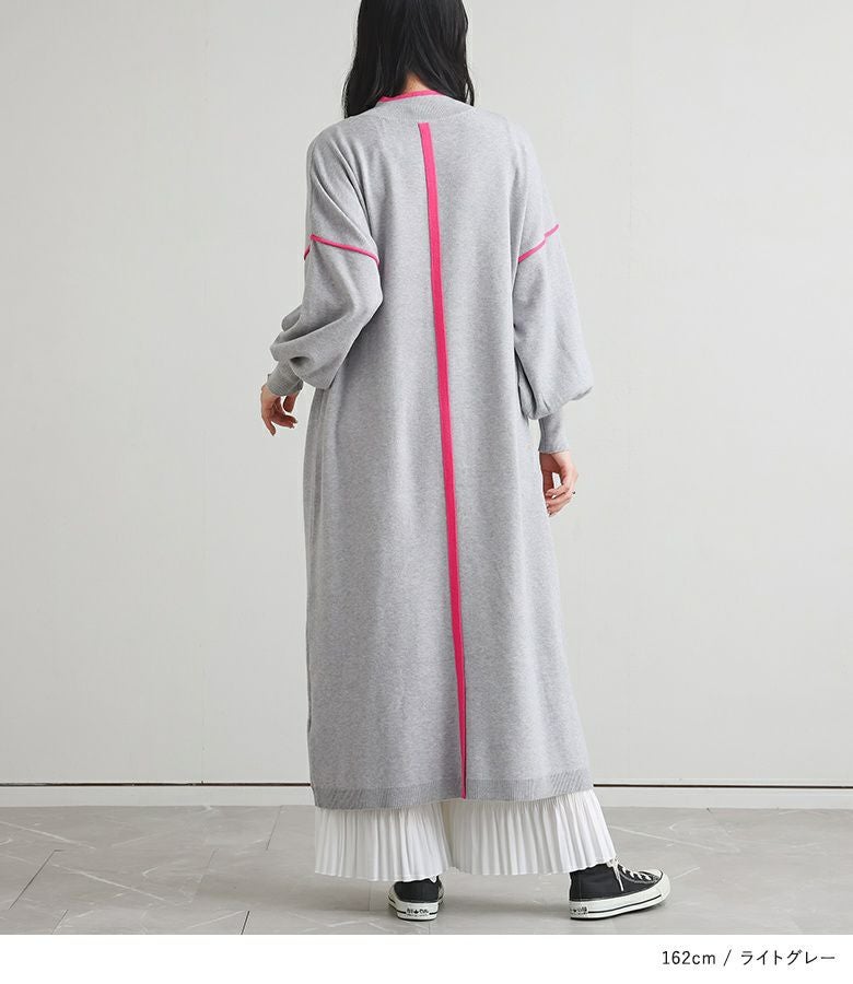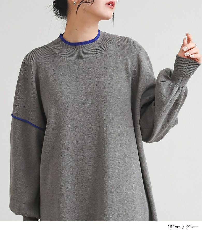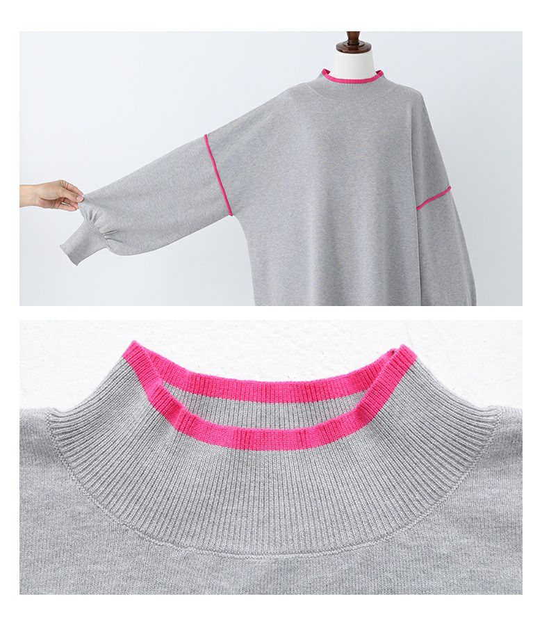 鮮やかなカラーの配色デザインニットワンピース。襟元と袖の配色デザインとバックスタイルにも縦に配色ラインが入ってすっきり見えが叶う優秀アイテムです。