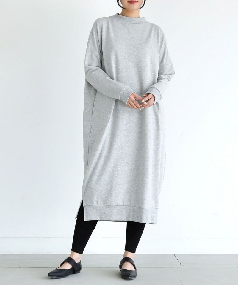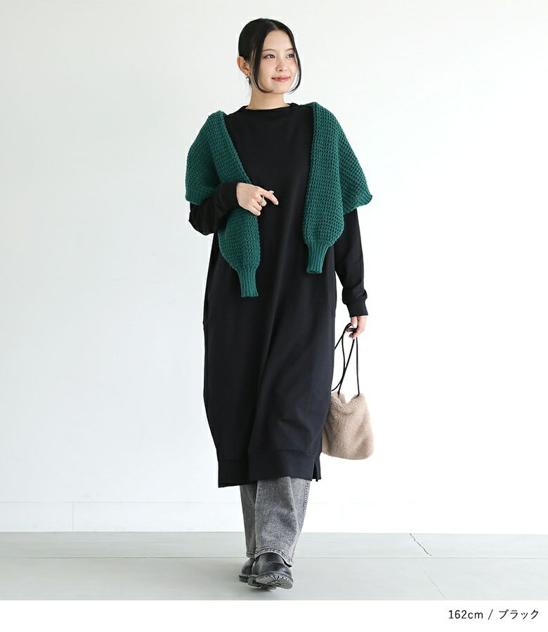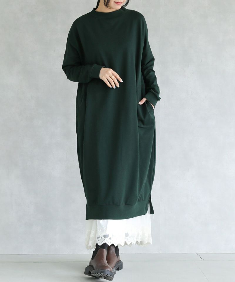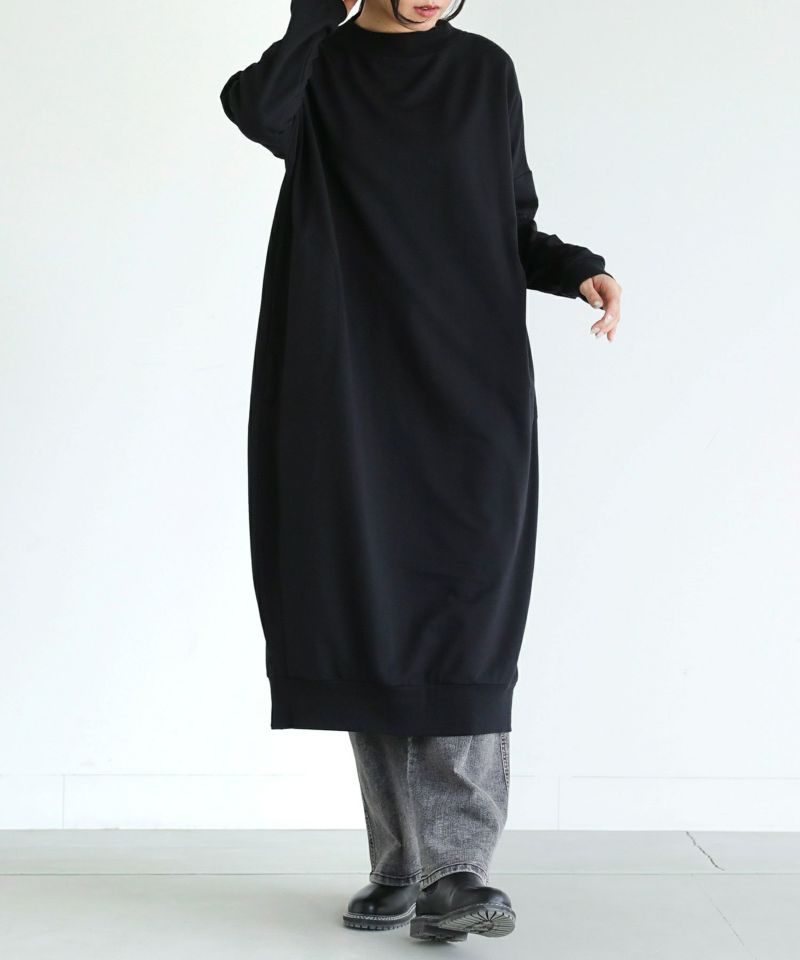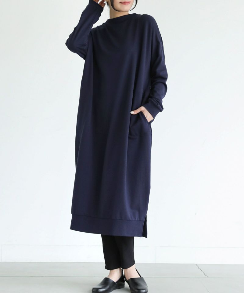 ラフでソフトな着心地の長袖ワンピースです。背中の大きなタックがポイントで、体型をカバーしつつすっきり見せます。襟元は少し幅広のリブで、広すぎないネックラインが顔周りをすっきり見せます。袖・裾・襟はリブ仕様でシンプルながらメリハリをプラスし、裾のスリットが抜け感を生み、両サイドポケット付きで実用性も備えています。
