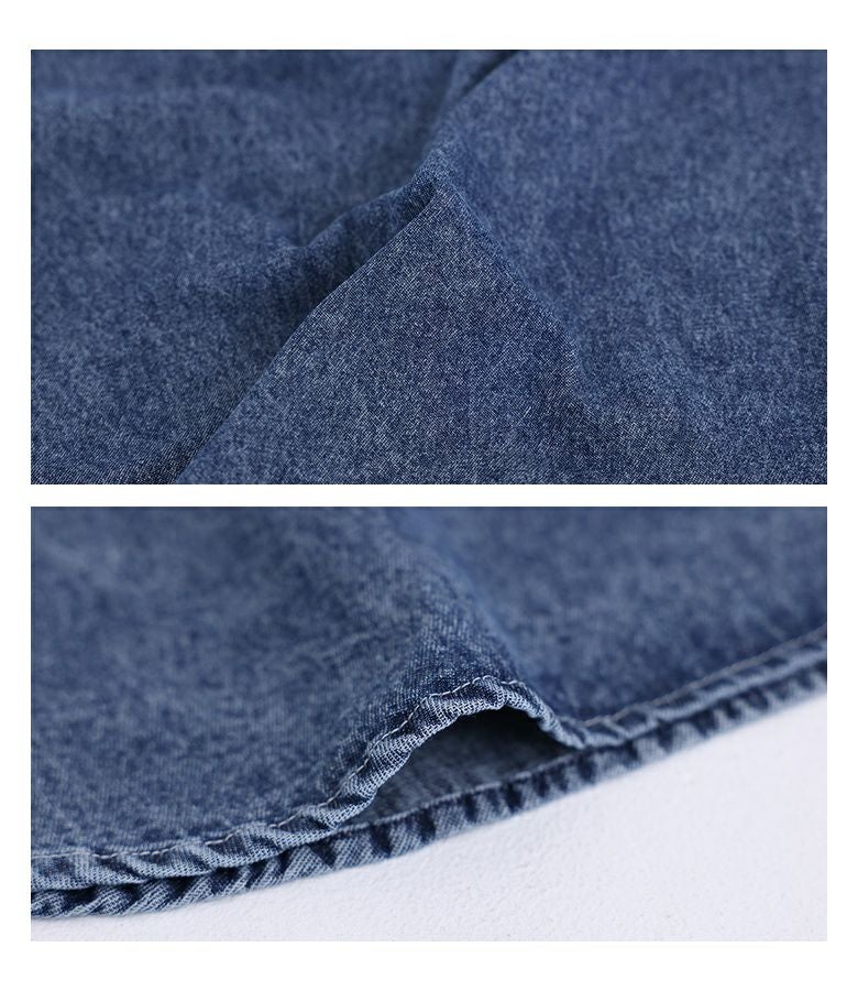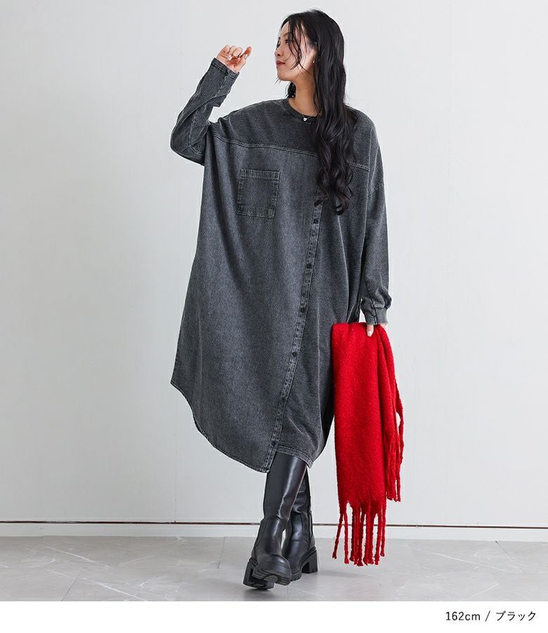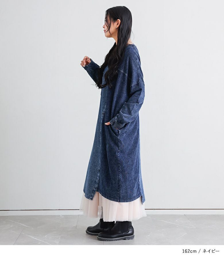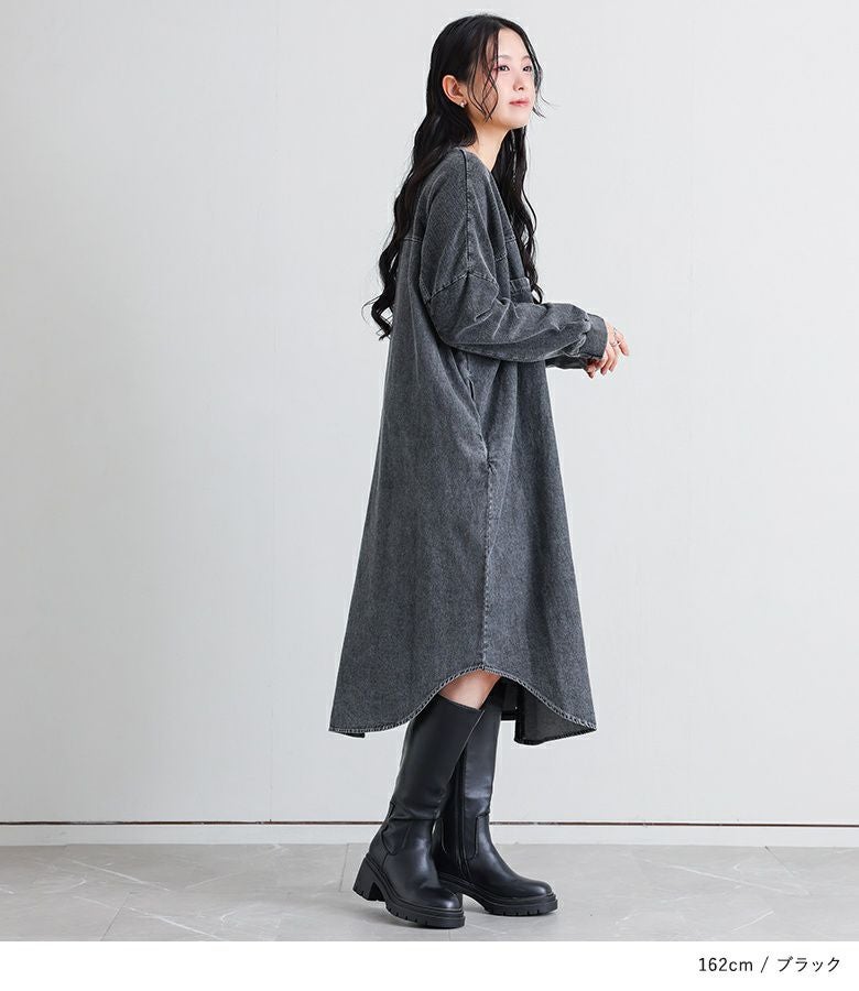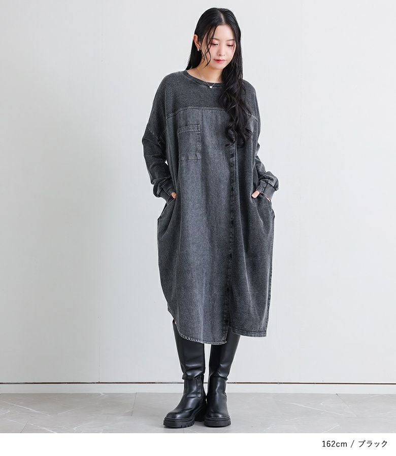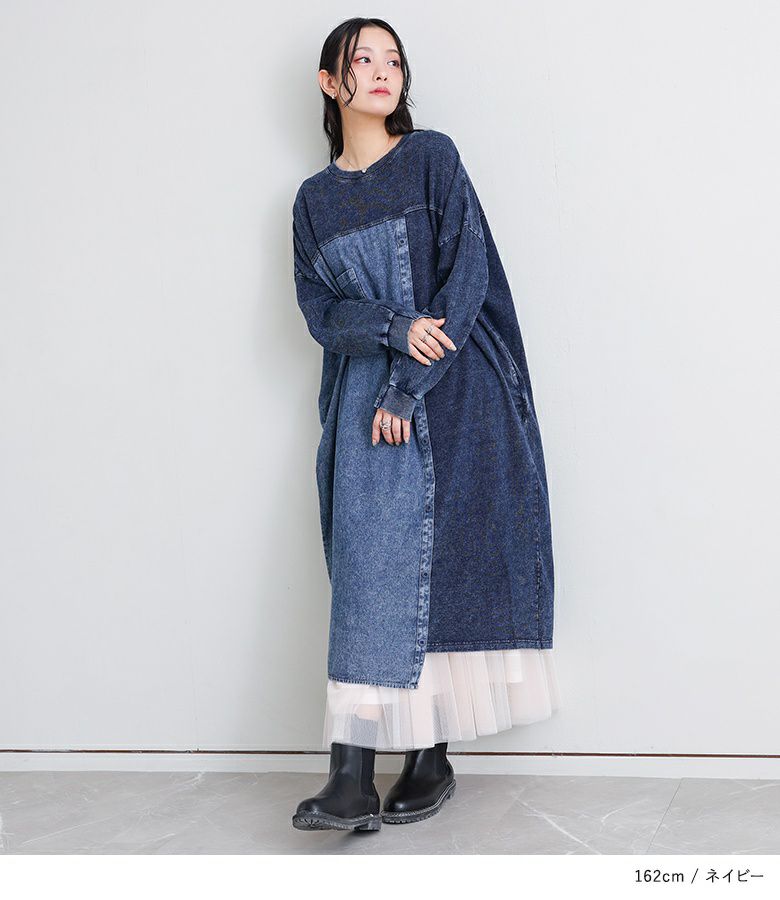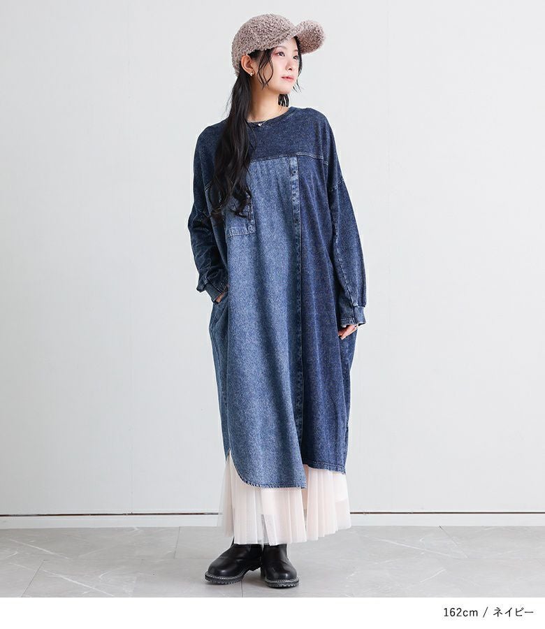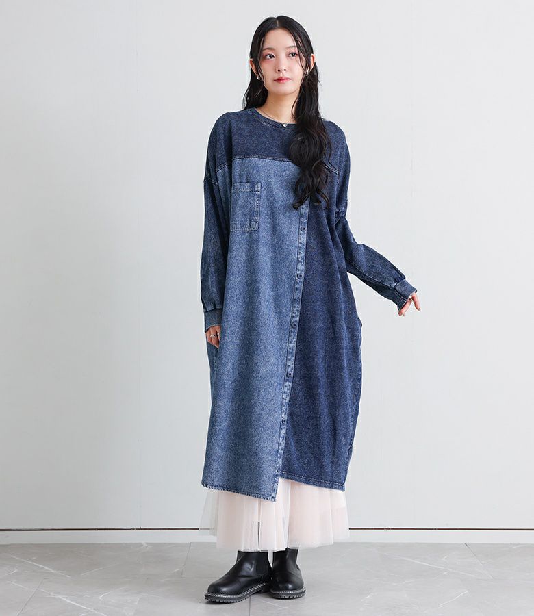 配色切り替えがお洒落なデニムワンピース。