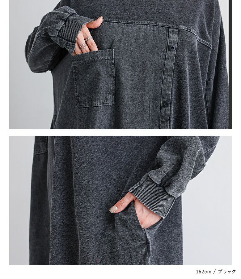 配色切り替えがお洒落なデニムワンピース。伸縮性のある素材で、着心地もよい優秀アイテムです。デニムのカジュアルな雰囲気でお洒落に決まる一着。