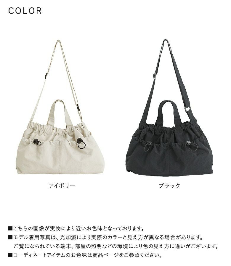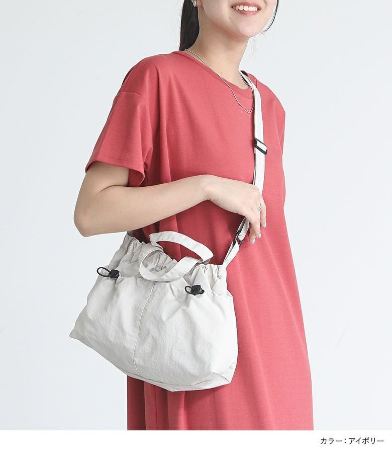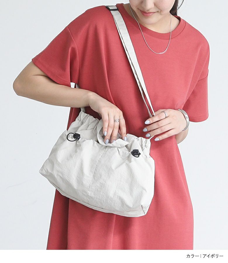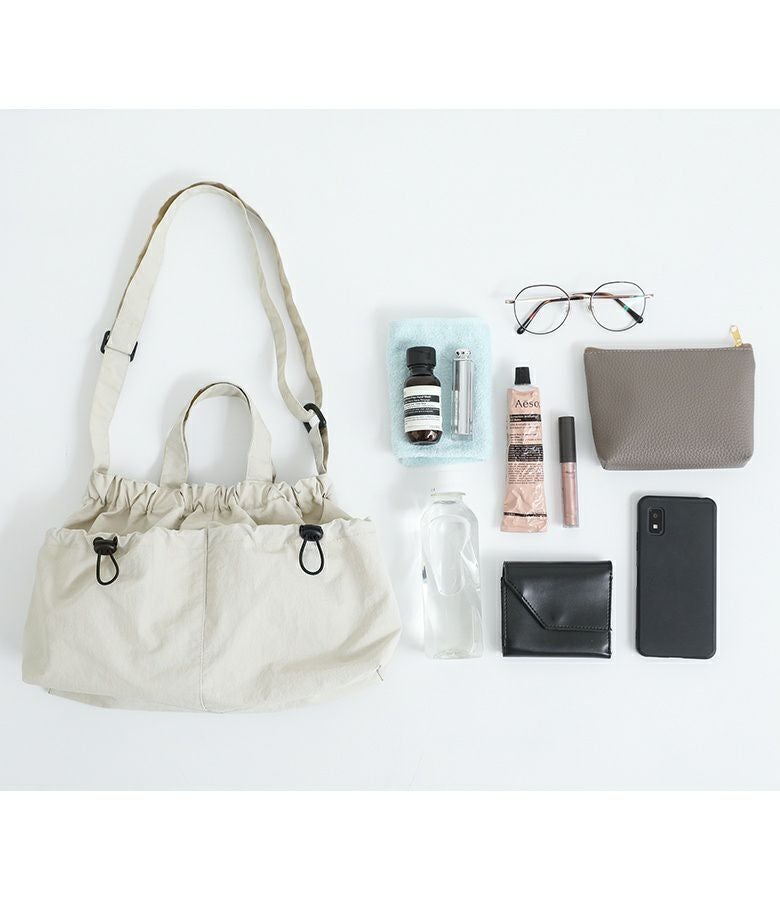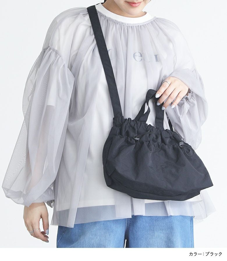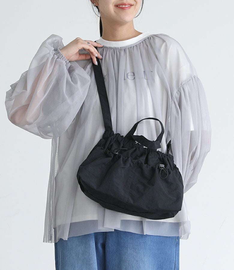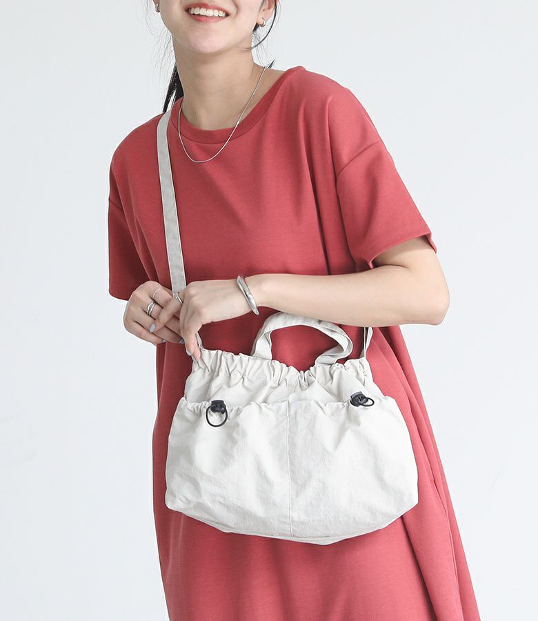 2wayデザインのショルダーバッグ。外側に2つ、内側に1つのポケットがあり、コンパクトなサイズながらドリンクボトルも収納できるサイズです。外側のオープンポケットには自由に調整可能なドローストリングが付いており、コーディネートのアクセントになります。