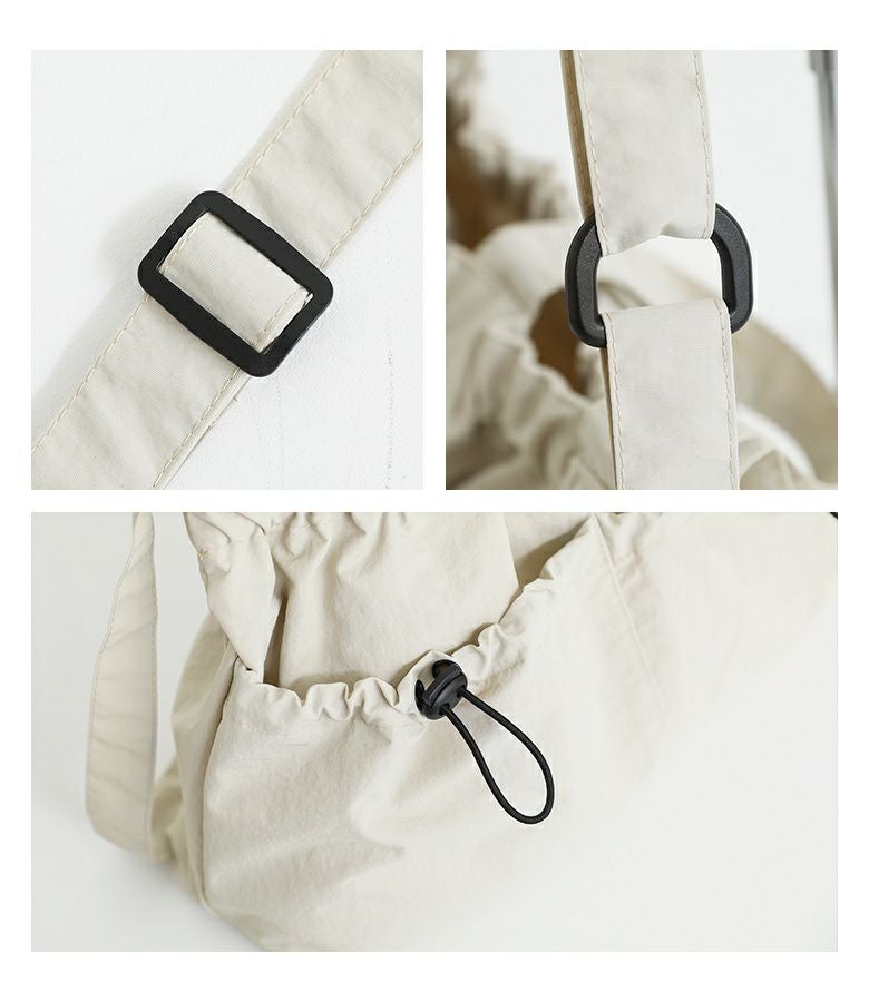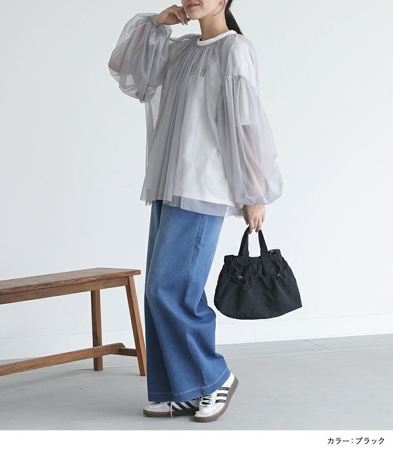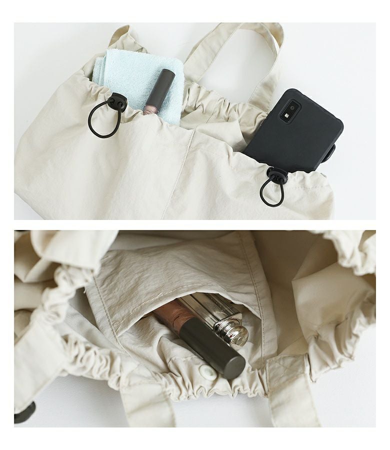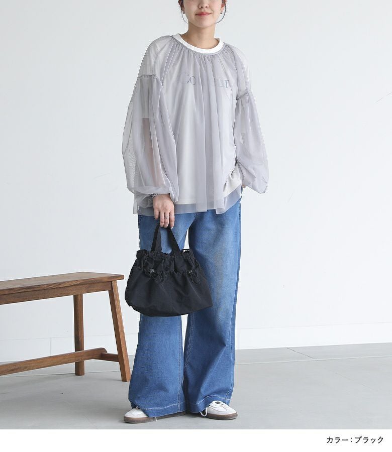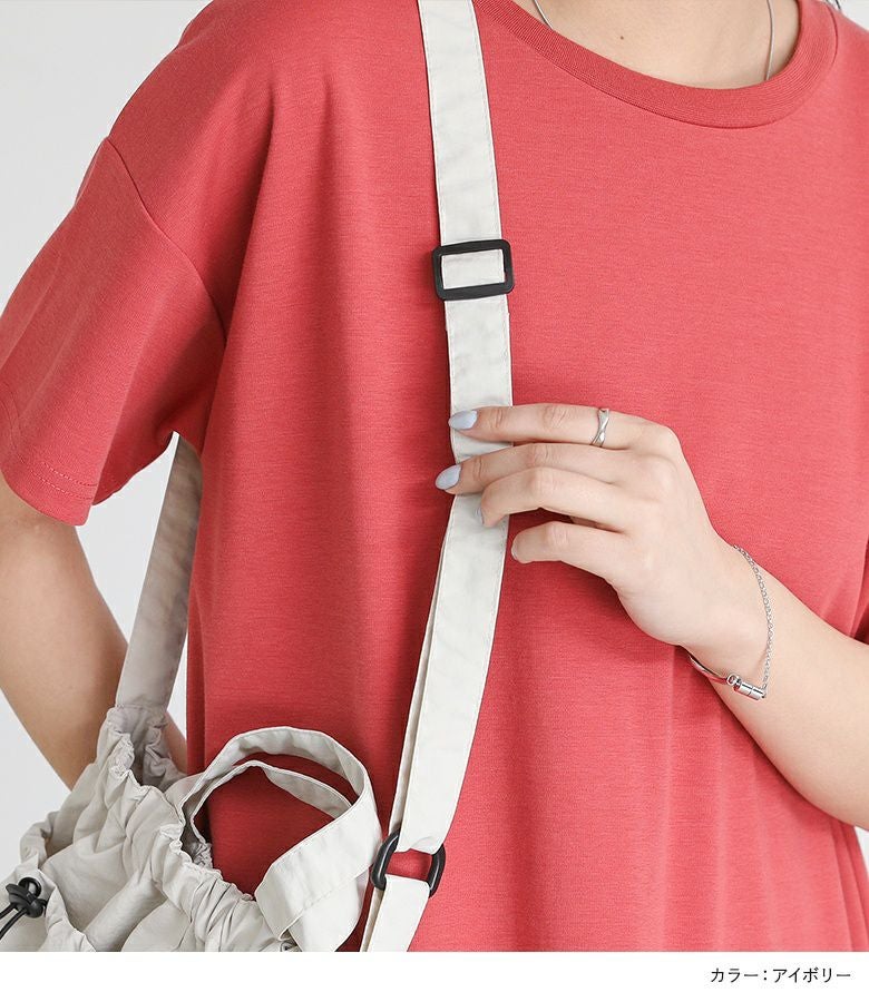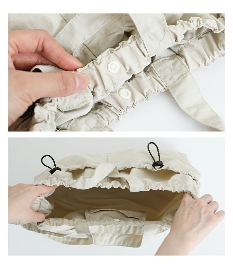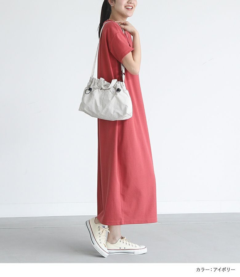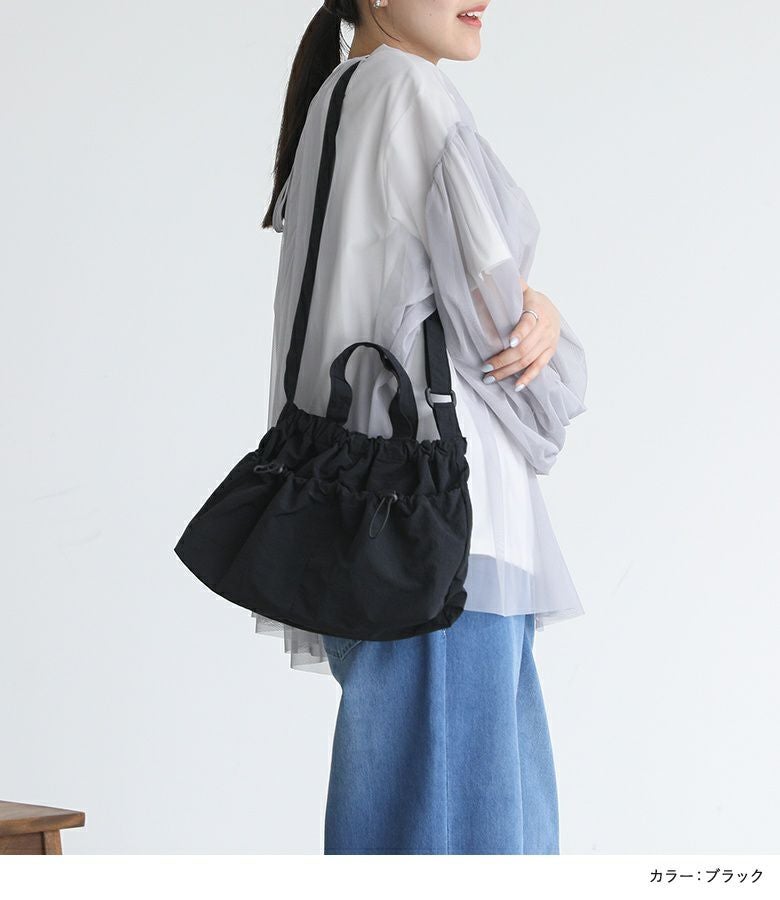 2wayデザインのショルダーバッグ。外側に2つ、内側に1つのポケットがあり、コンパクトなサイズながらドリンクボトルも収納できるサイズです。外側のオープンポケットには自由に調整可能なドローストリングが付いており、コーディネートのアクセントになります。