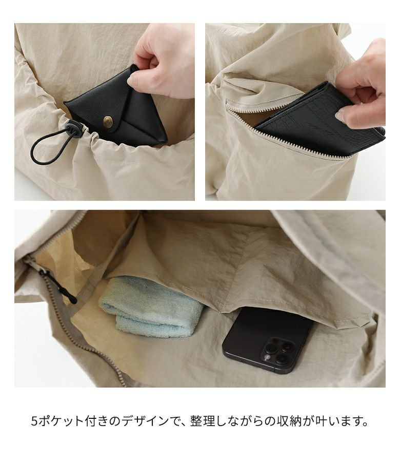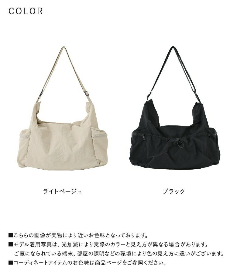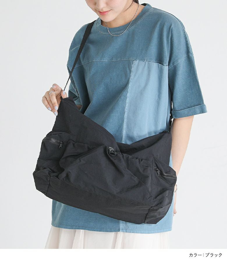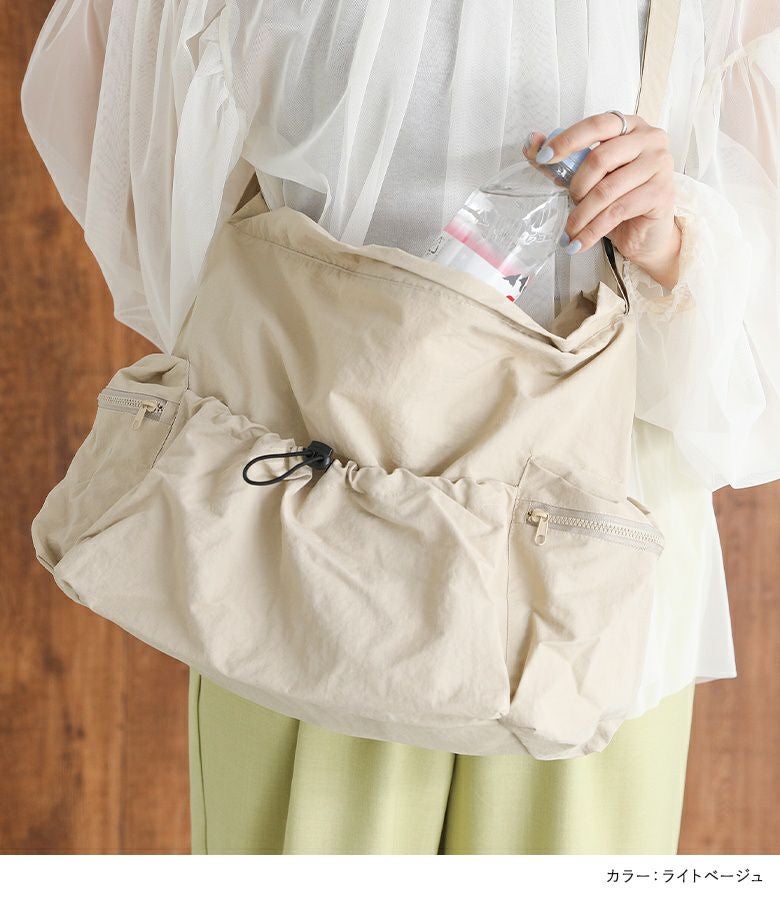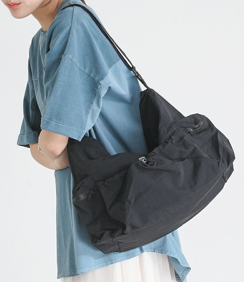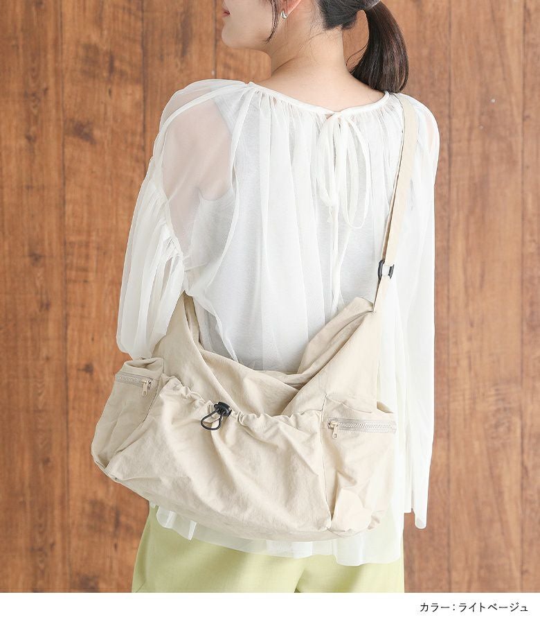 シンプルなデザインで使いやすいショルダーバッグ。外側と内側に計5つのポケットがあり、整理しながら収納できます。外側のオープンポケットには自由に調整可能なドローストリングが付いており、コーディネートのアクセントになります。