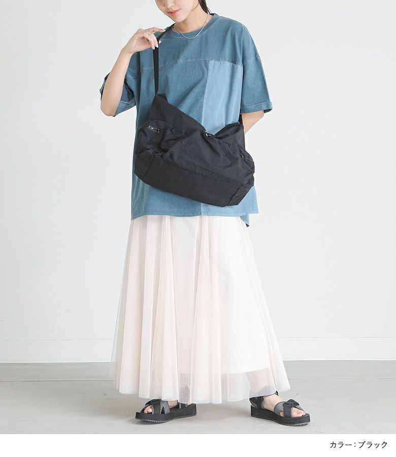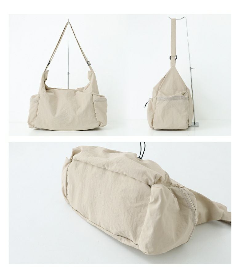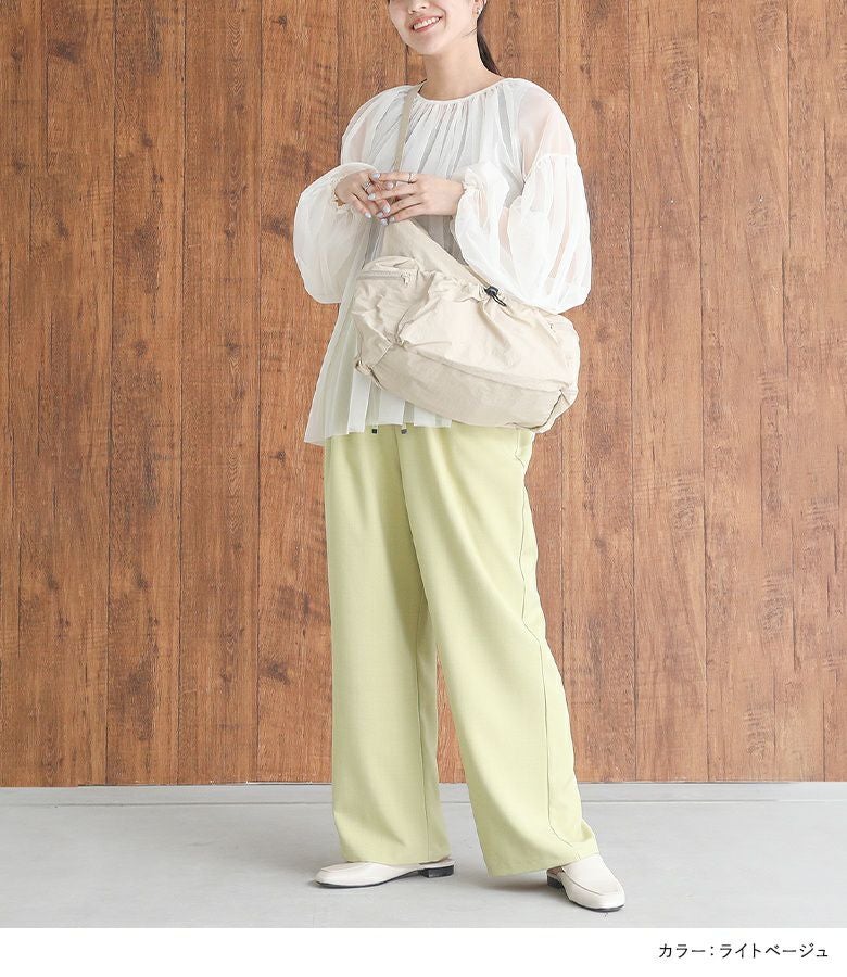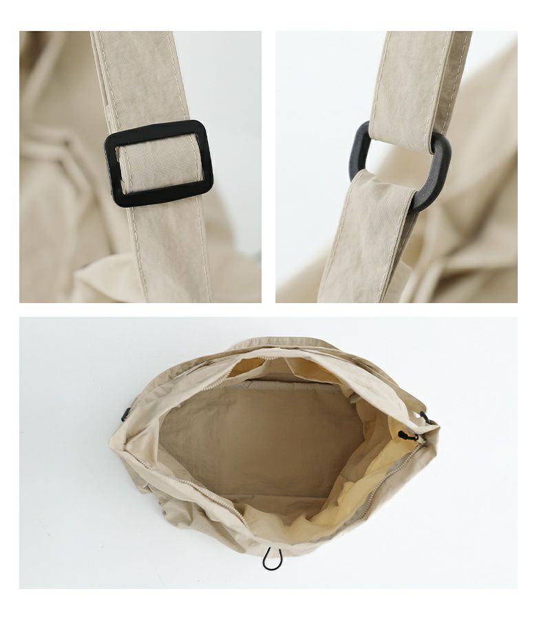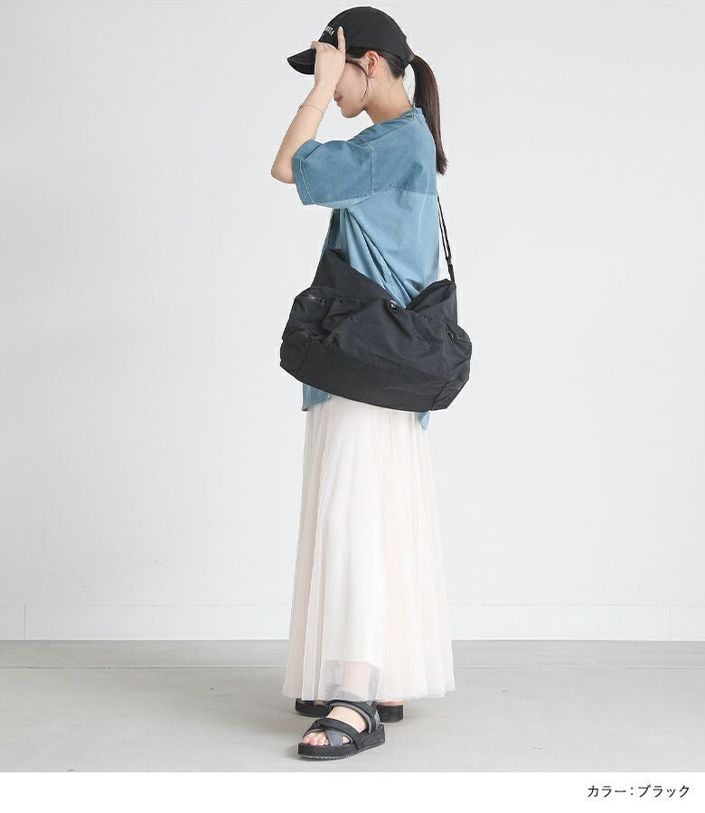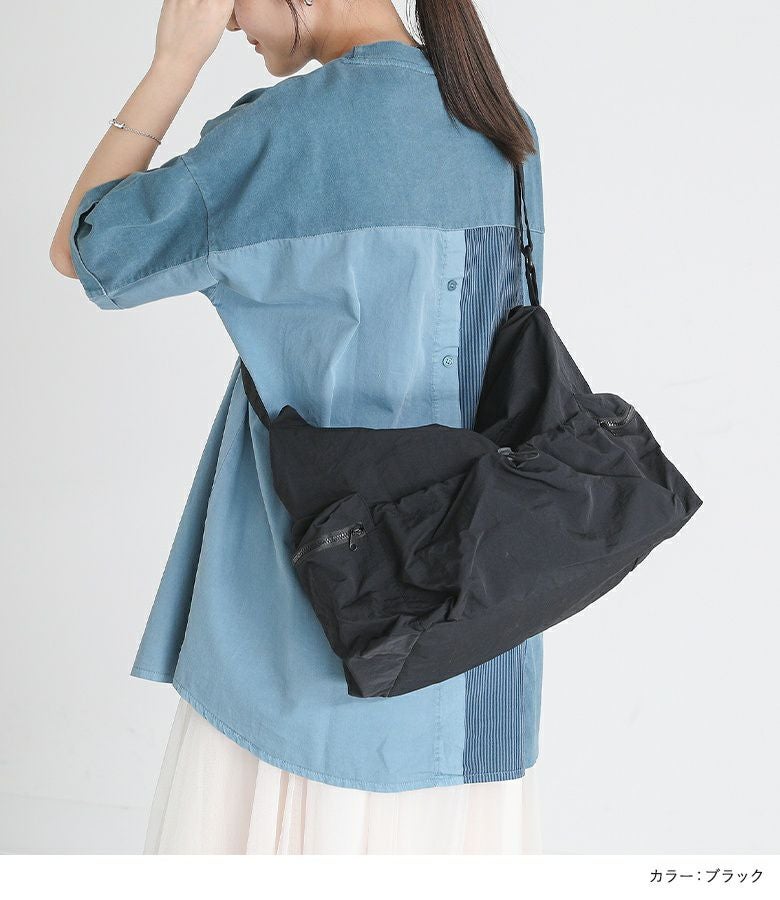 シンプルなデザインで使いやすいショルダーバッグ。外側と内側に計5つのポケットがあり、整理しながら収納できます。外側のオープンポケットには自由に調整可能なドローストリングが付いており、コーディネートのアクセントになります。