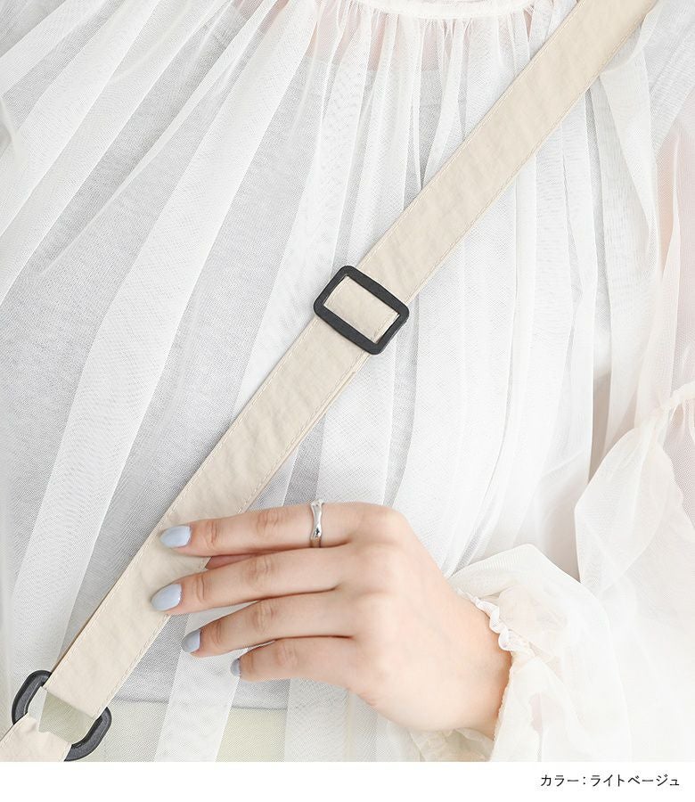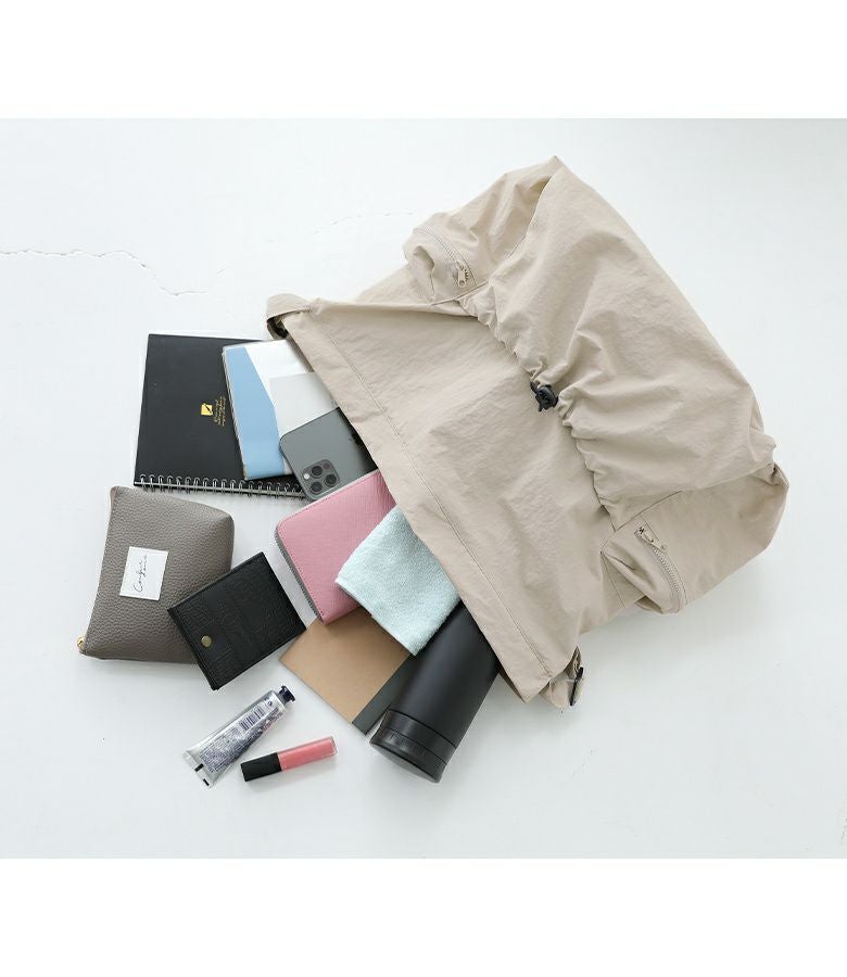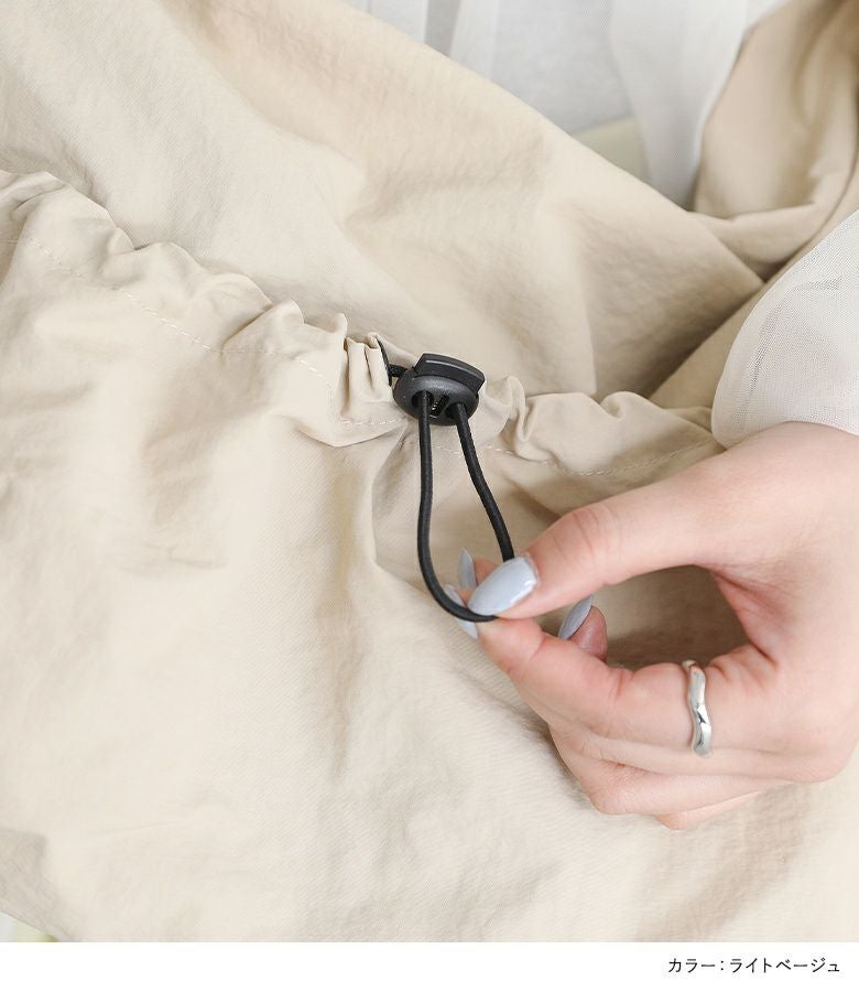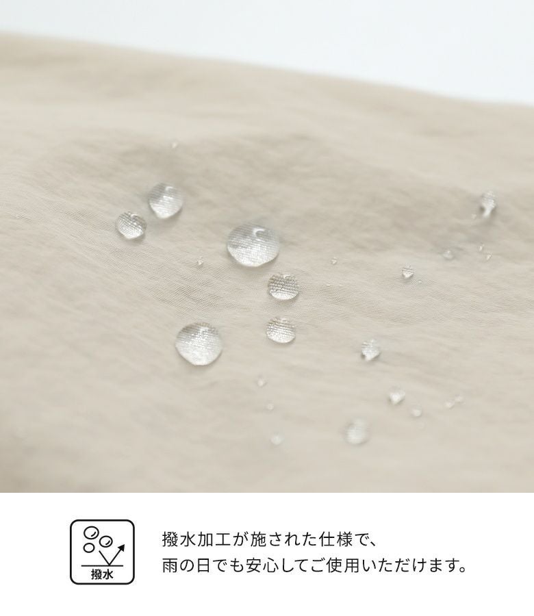 シャカシャカとした触り心地のナイロン100%素材を使用。軽量でラクに持ち運ぶことができ、撥水加工付きで雨の日でも安心して使用できるのが嬉しいポイントです。