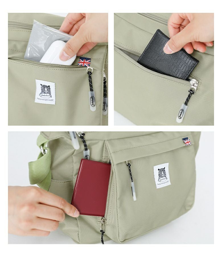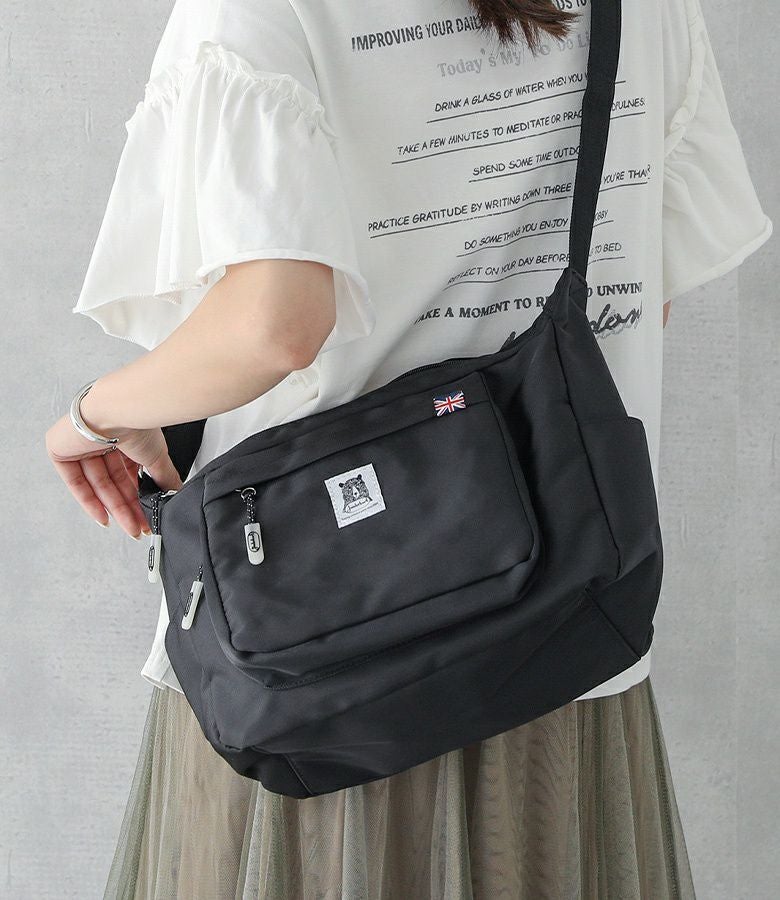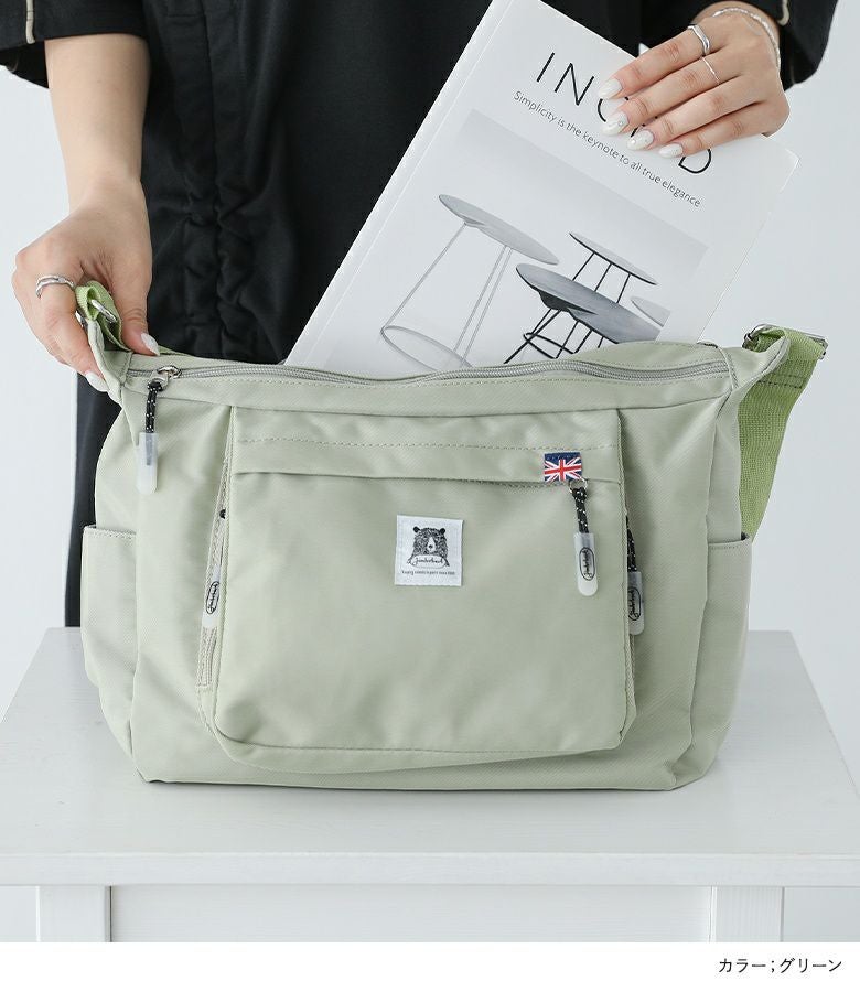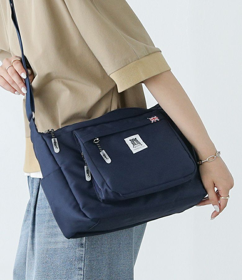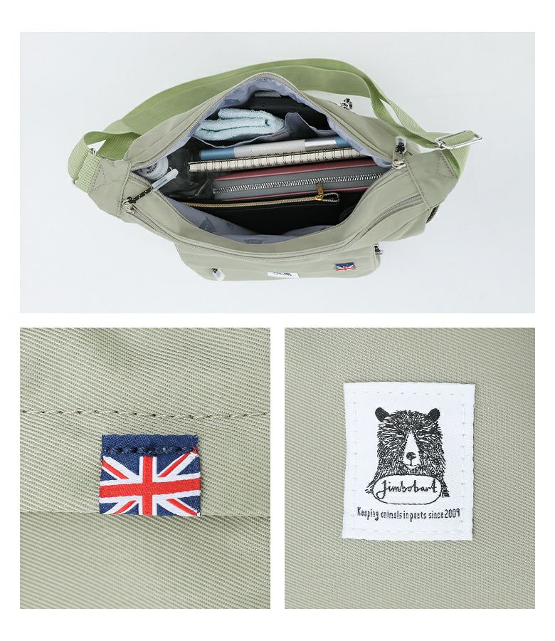 ジムボバートのショルダーバッグ。しっかりと荷物が入る大容量バッグで、通勤や通学、レジャーやマザーズバッグにも使えます。メインスペースの中心には仕切りがあり、外側と内側には様々なサイズのポケットを配置しているため、持ち物の整理がしやすく、用途に合わせた収納が可能です。広めのマチ付きで自立するため、どこでもさっと置くことができます。また、メインスペースの収納口は大きく開き、荷物の出し入れがスムーズにできるのもポイントです。