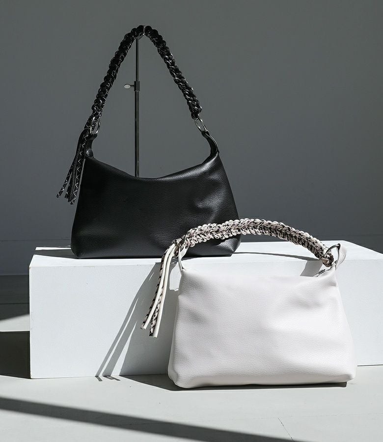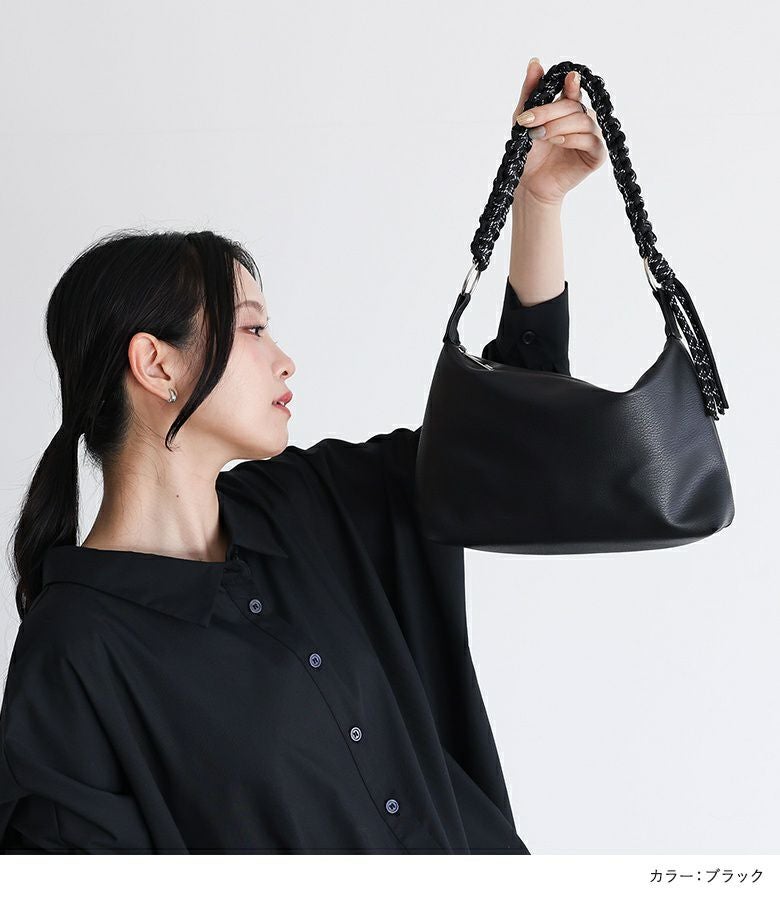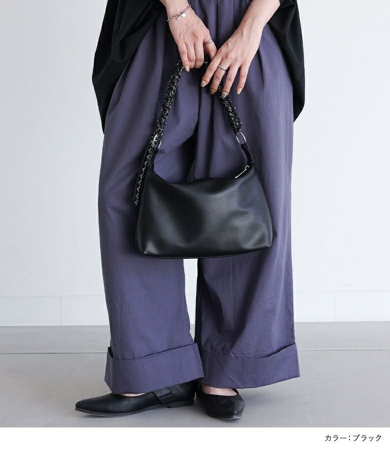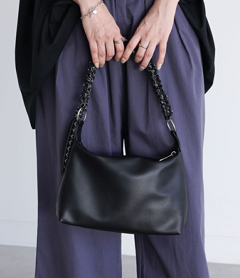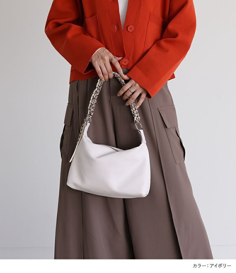 取り外しが可能なショルダーストラップ付きでショルダーバッグとしても、斜め掛けバッグとしても2wayデザインでシーンに合わせて使い分けれるバッグ。コード編みの持ち手部分がポイントです。