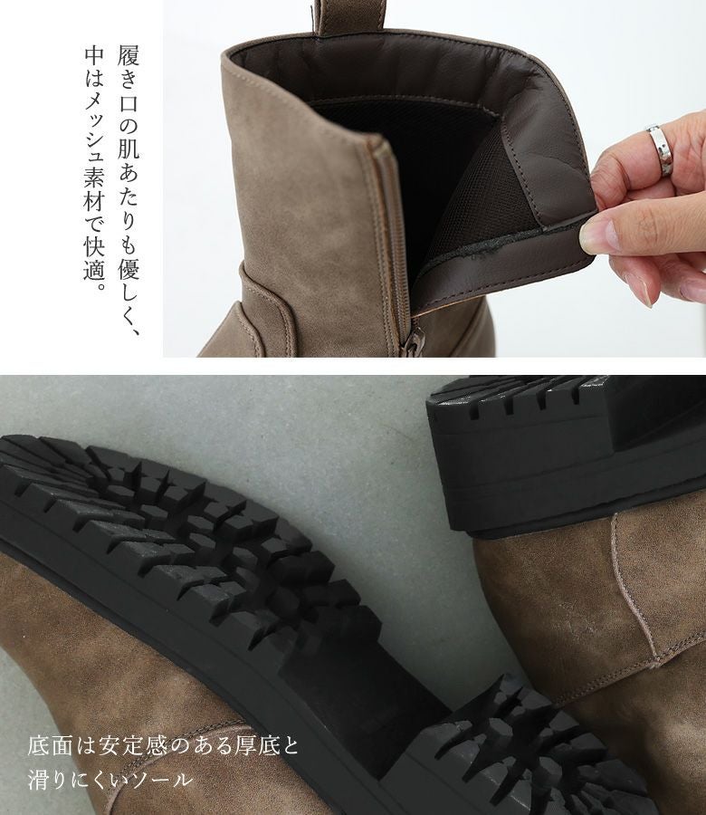 全体的に大きすぎる感じはなく、厚手のソックスと合わせても程よいゆとりがありました。薄手ソックスと合わせてもブーツなので脱げる心配もなく、安定感があります。幅広の方や甲高の方はワンサイズ大きめのLサイズを選ぶと厚手の靴下と合わせた時も気にならず着用できそうです。