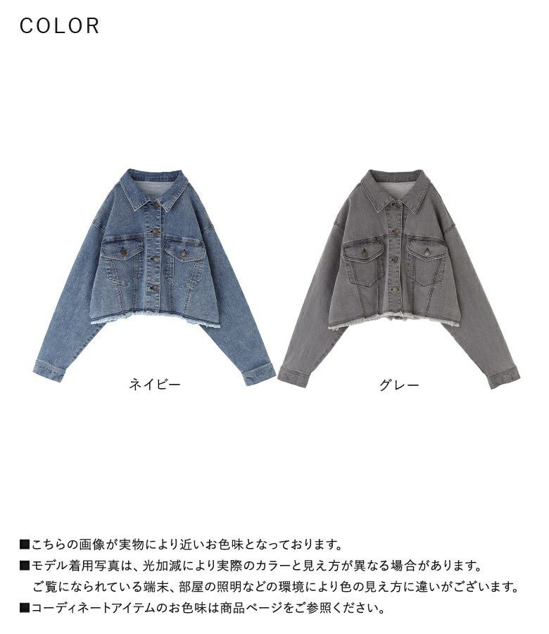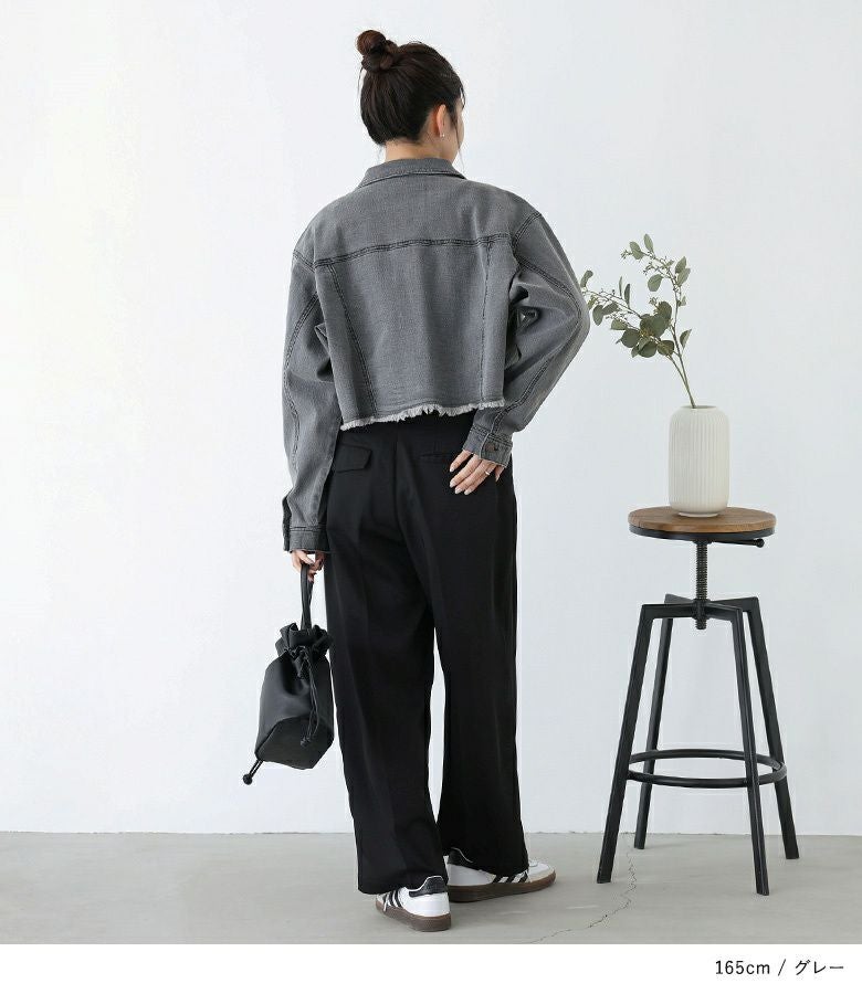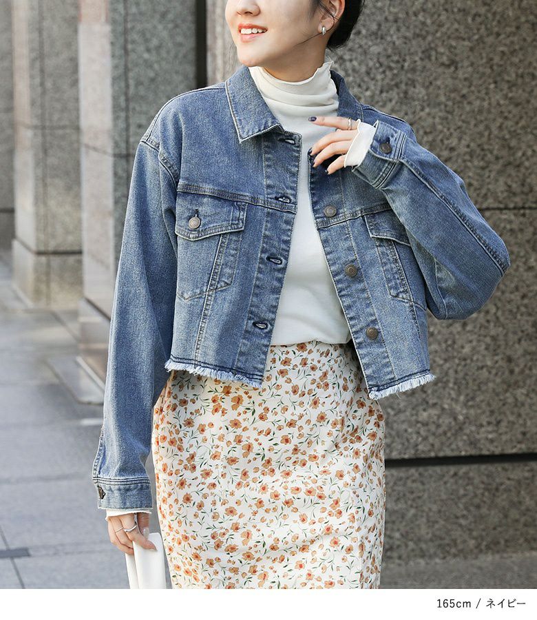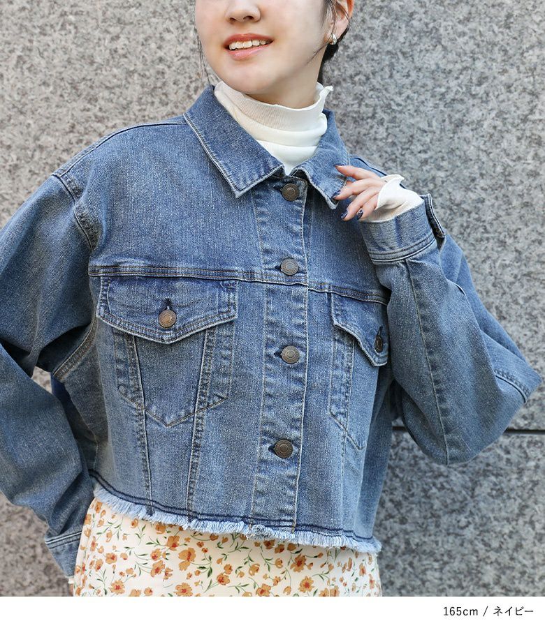 裾のカットオフデザインがポイントのショート丈デニムジャケット。自然と目線の上がるショート丈で、スタイルアップ効果も期待できる一枚です。