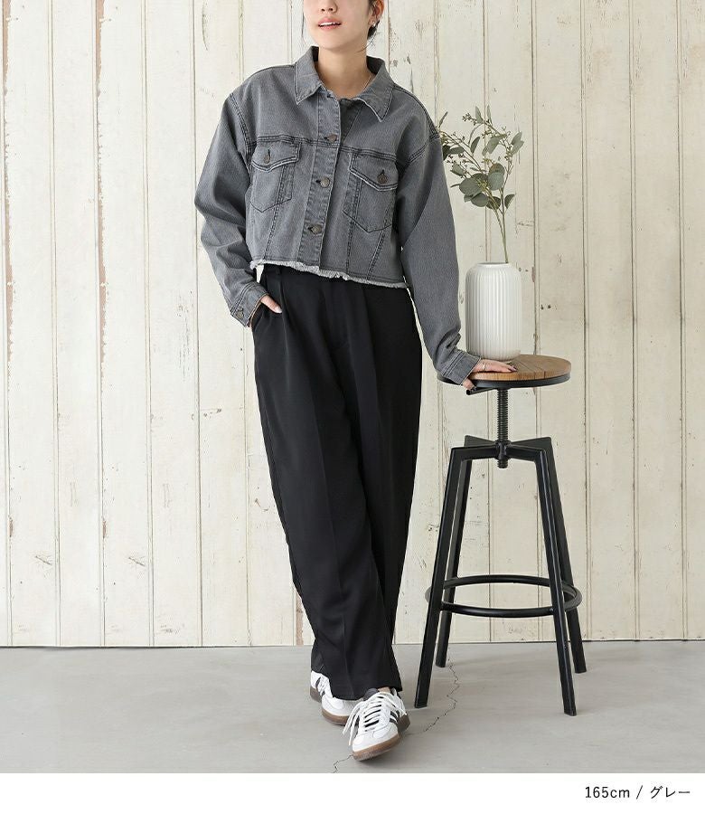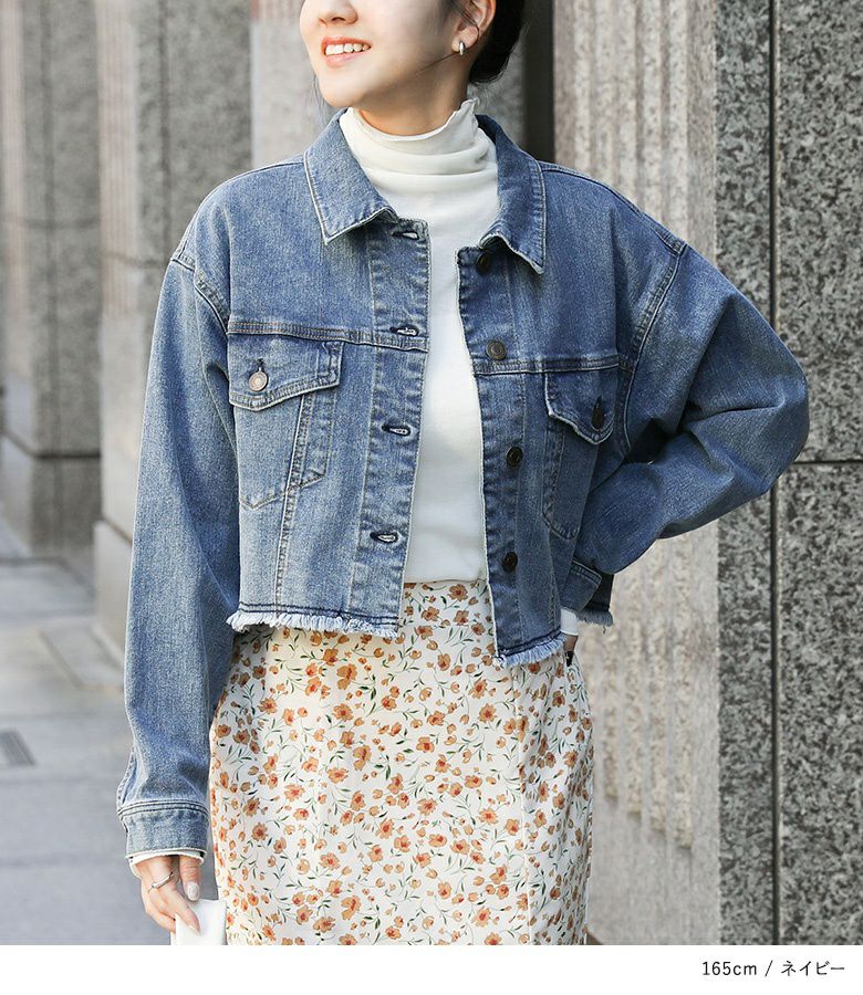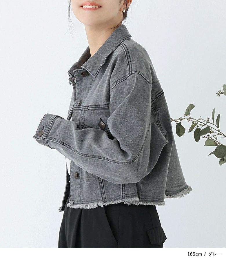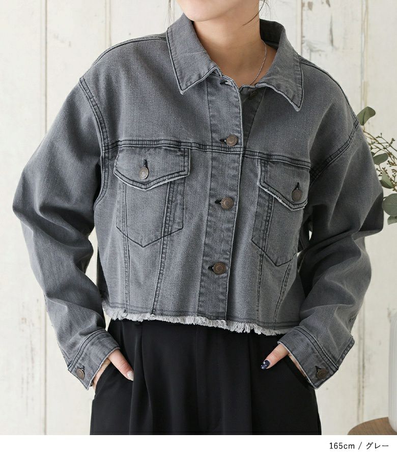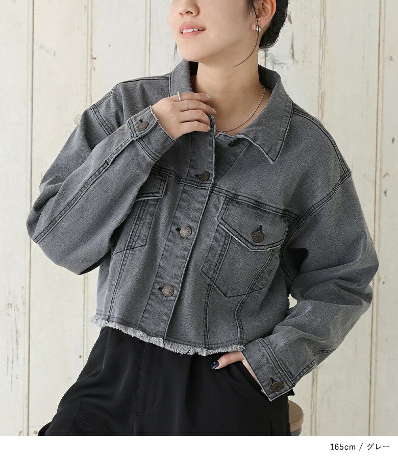 裾のカットオフデザインがポイントのショート丈デニムジャケット。自然と目線の上がるショート丈で、スタイルアップ効果も期待できる一枚です。