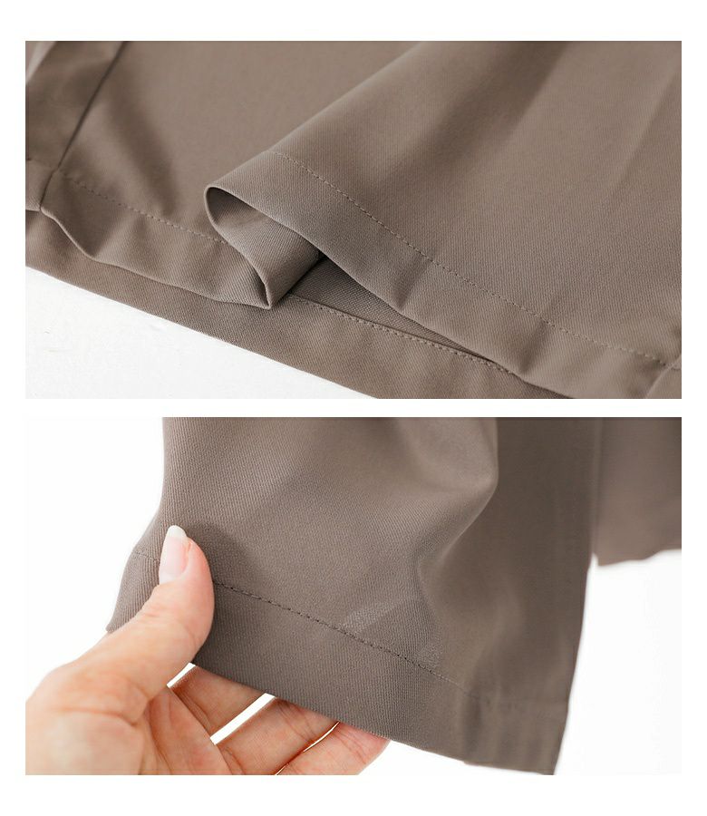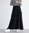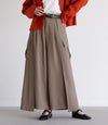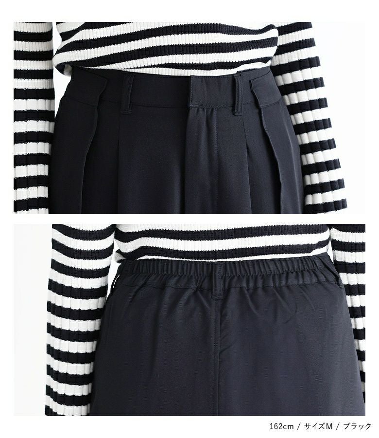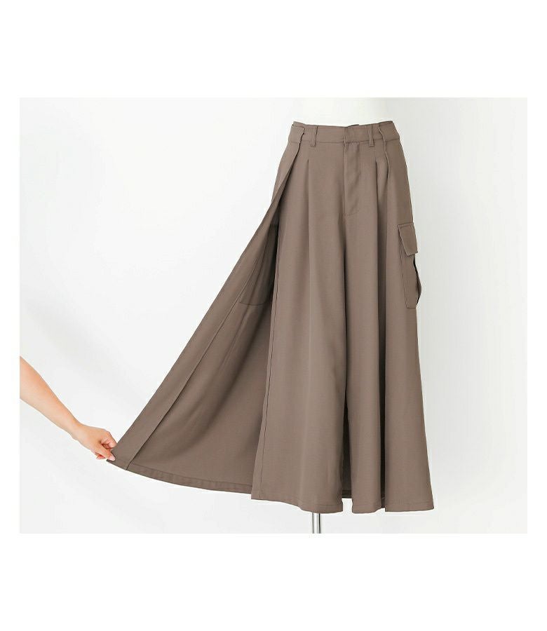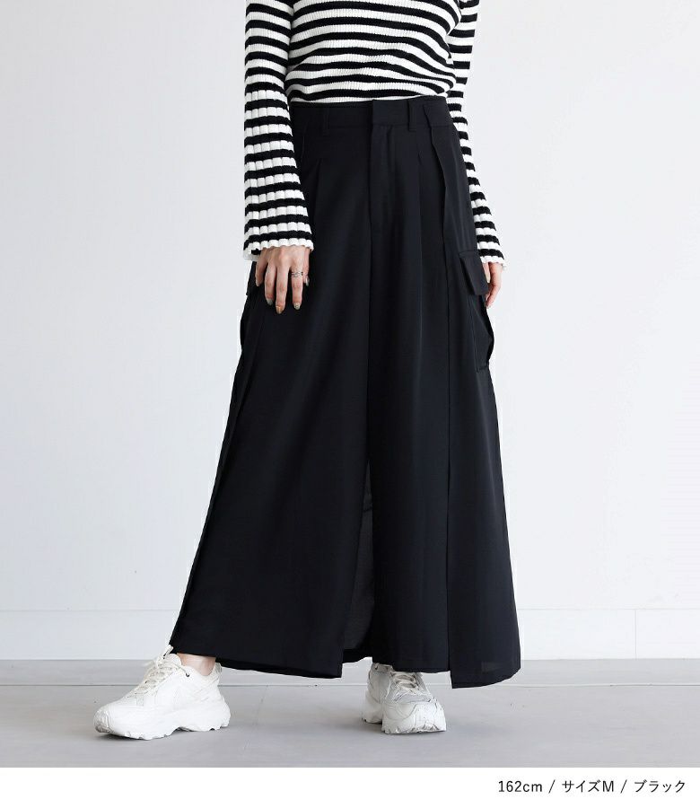 フロントスタイルはパンツ、バックスタイルはスカートに見える変形パンツ。脇から後ろにかけてスカートを重ね、見る角度で表情が変わるデザインです。脚のラインを拾いにくいワイド丈と、お尻が目立ちにくいデザインで体型カバーも叶います。左右のポケットでカジュアルさもプラスします。