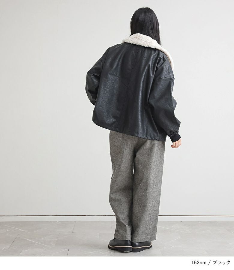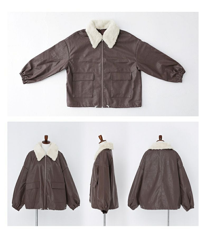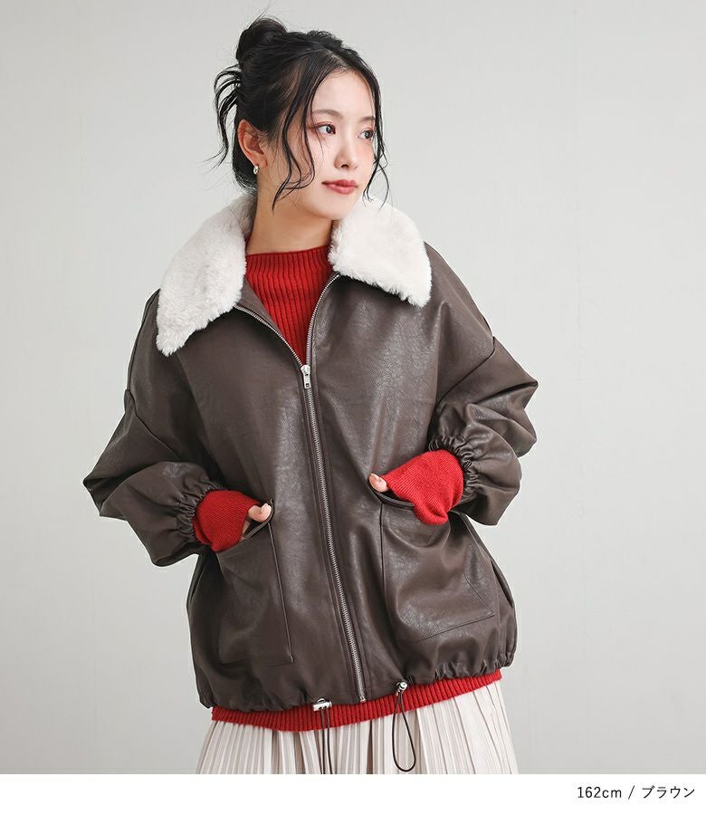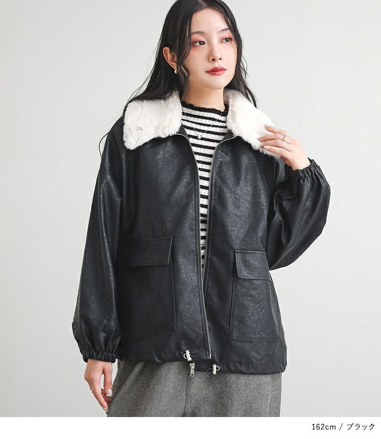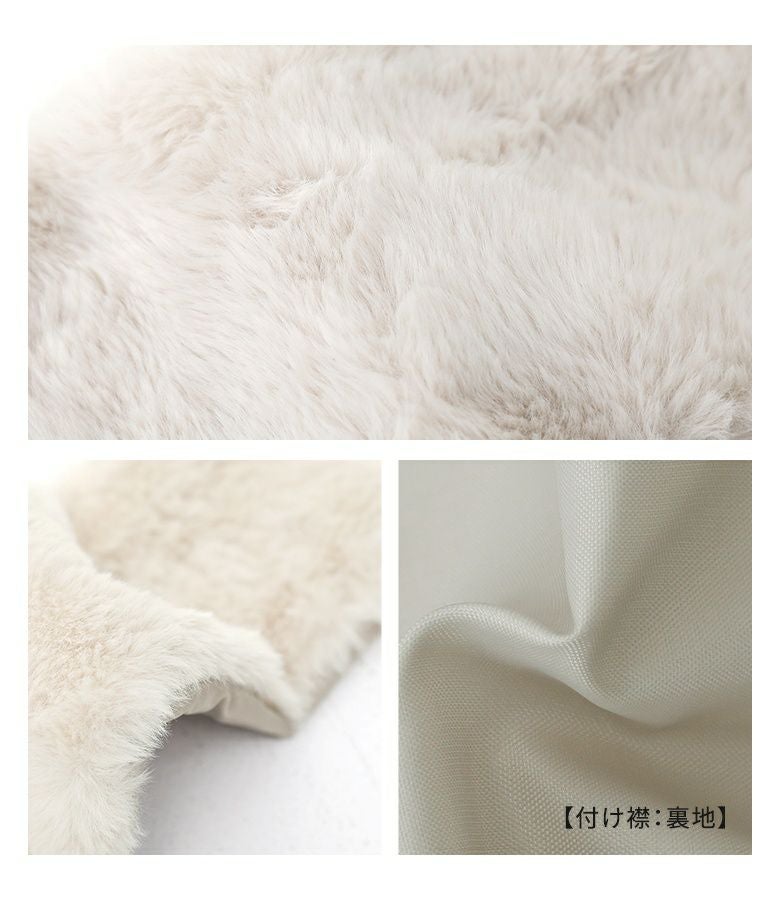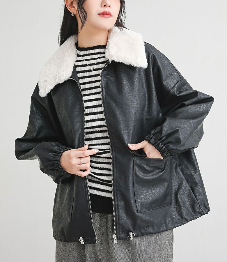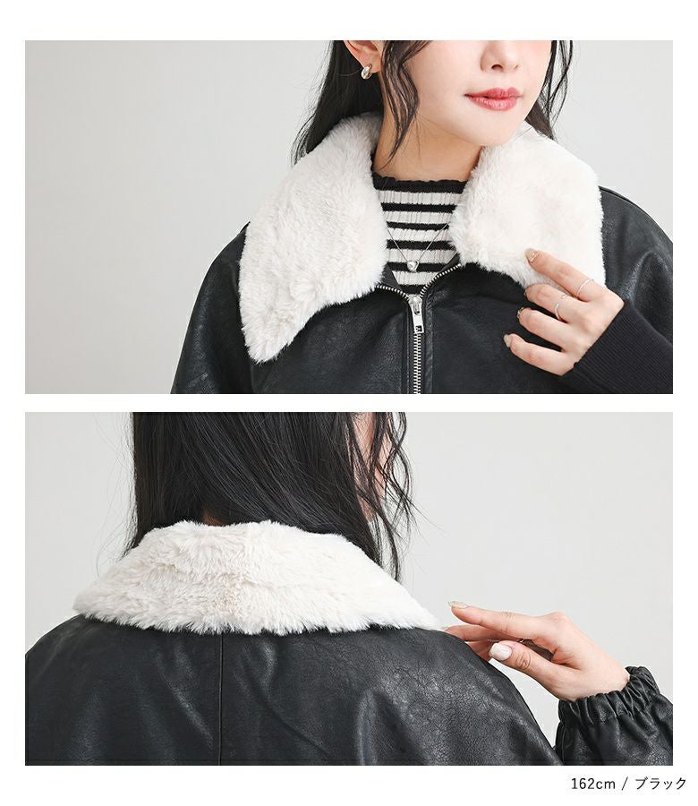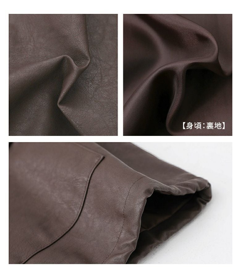 フェイクレザーは程よいハリと柔らかさを兼ね備え、立体感のある美しいシルエットをキープ。裏地はさらりとした肌滑りの良さで着心地快適です。フェイクファーはなめらかでふわふわとした触り心地。裏面にも裏地を施し、着脱時にごわつきません。