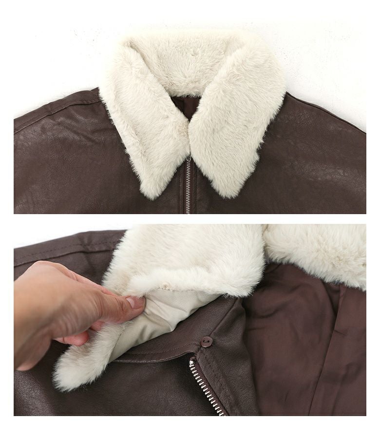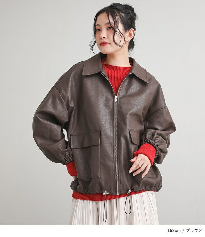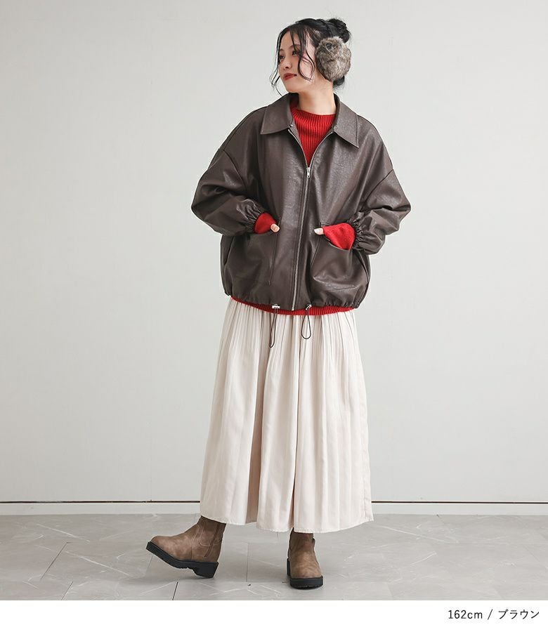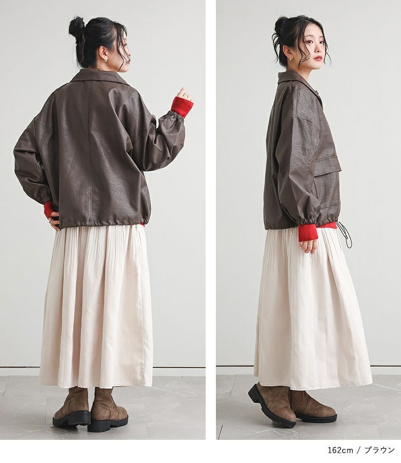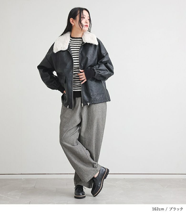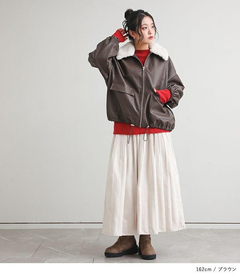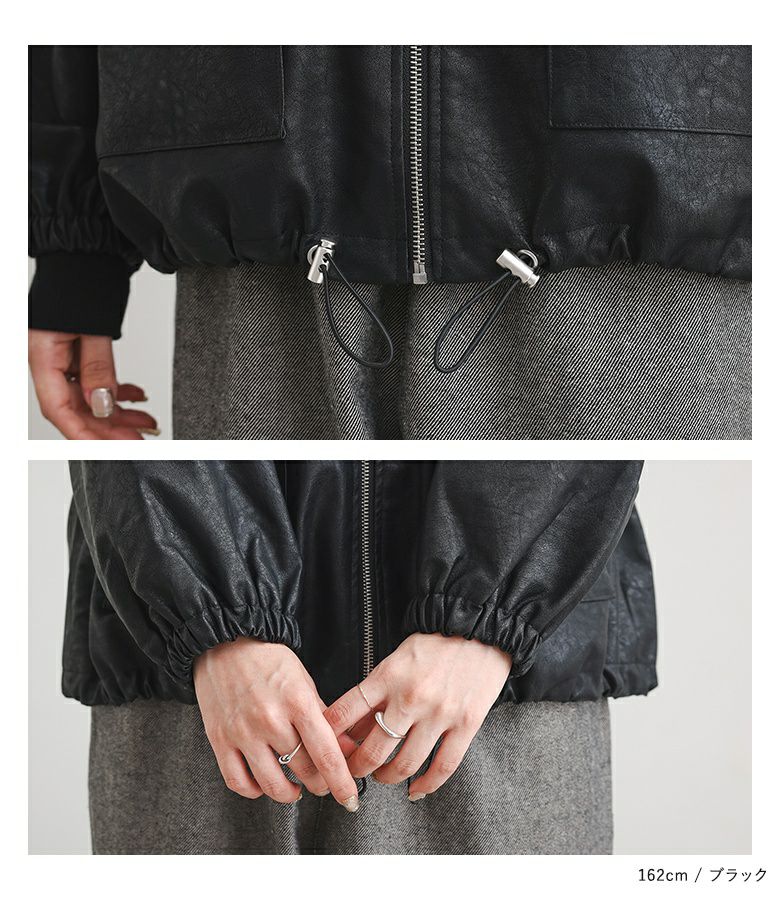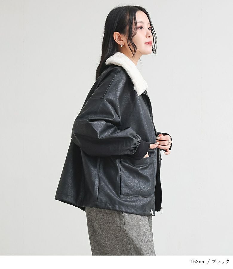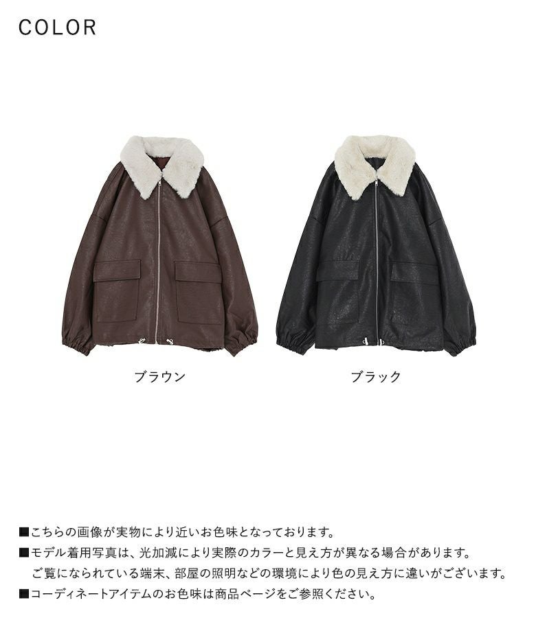 フェイクレザーは程よいハリと柔らかさを兼ね備え、立体感のある美しいシルエットをキープ。裏地はさらりとした肌滑りの良さで着心地快適です。フェイクファーはなめらかでふわふわとした触り心地。裏面にも裏地を施し、着脱時にごわつきません。