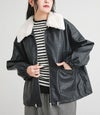 取り外し可能なフェイクファー付きのフェイクレザーブルゾン。