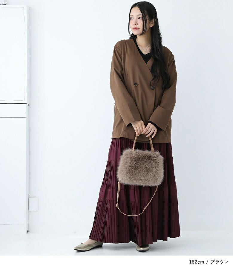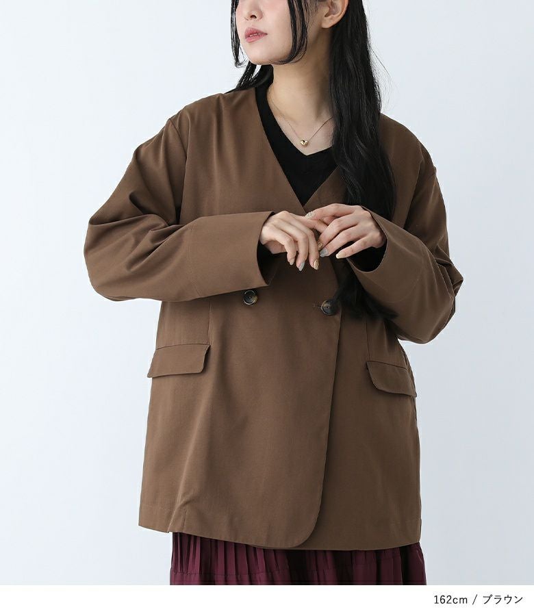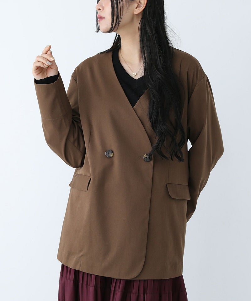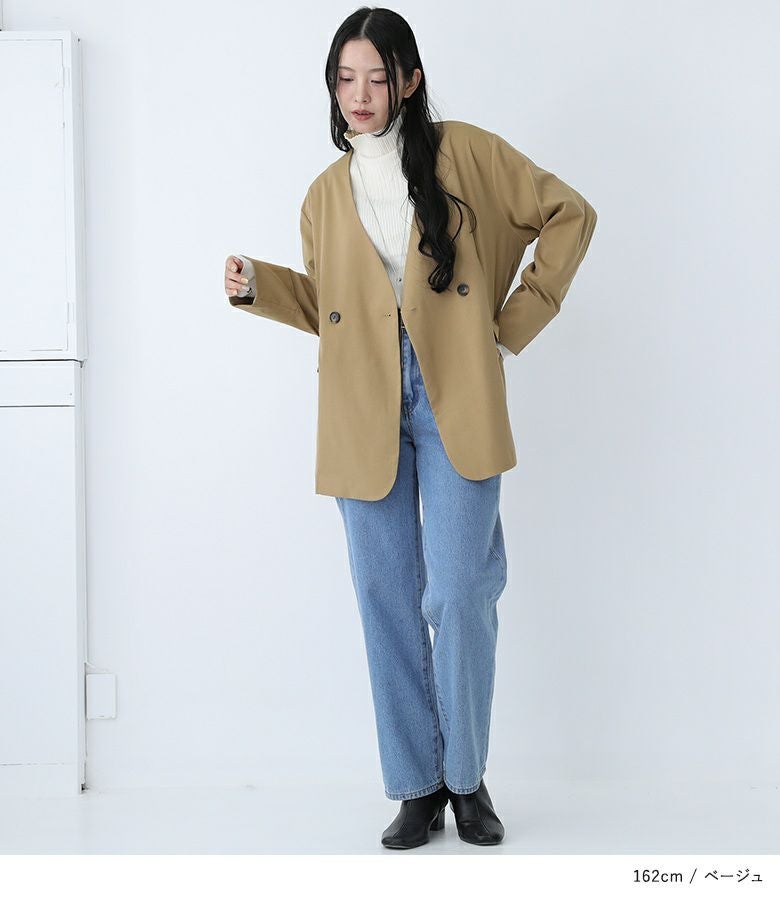 ノーカラーですっきりとした印象のジャケット。ダブルボタンがアクセントになり、今っぽいスタイルを演出してくれます。