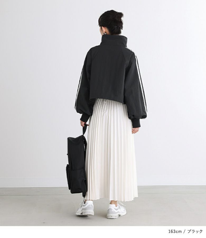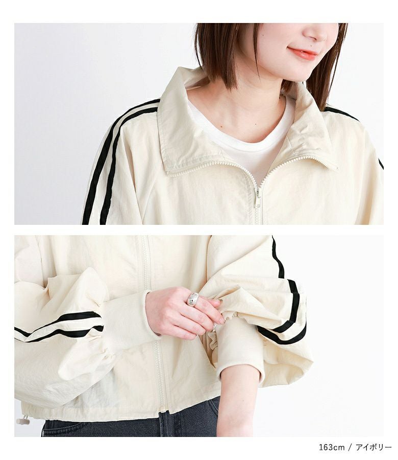 袖のラインデザインでスポーツMIXのお洒落が楽しめるブルゾン。ボリュームのある袖のシルエットでカジュアルになりすぎず、ショート丈でスッキリと女性らしく着られます。ファスナーを閉じるとスタンド襟になり、裾紐を絞るとシルエットアレンジもできて気分やコーデによって着方を変えられるのも嬉しいポイント。