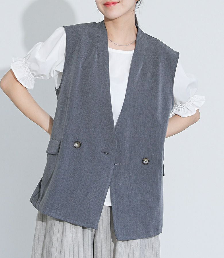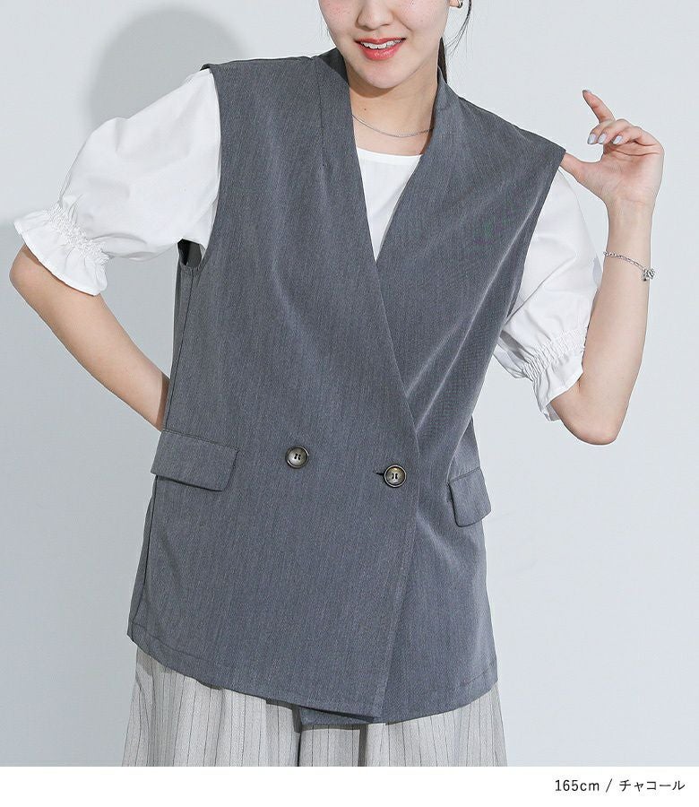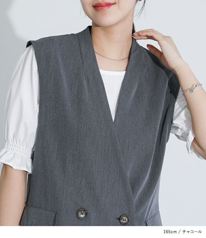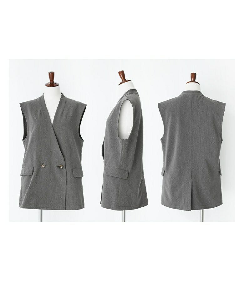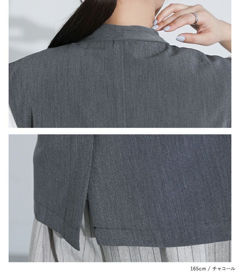 普段のコーデに合わせるだけでこなれ感が高まるノーカラージレ。ウエスト位置がシェイプされたシルエットなので着痩せ効果があるのも嬉しいポイントです。
