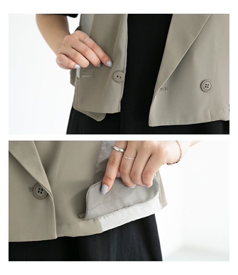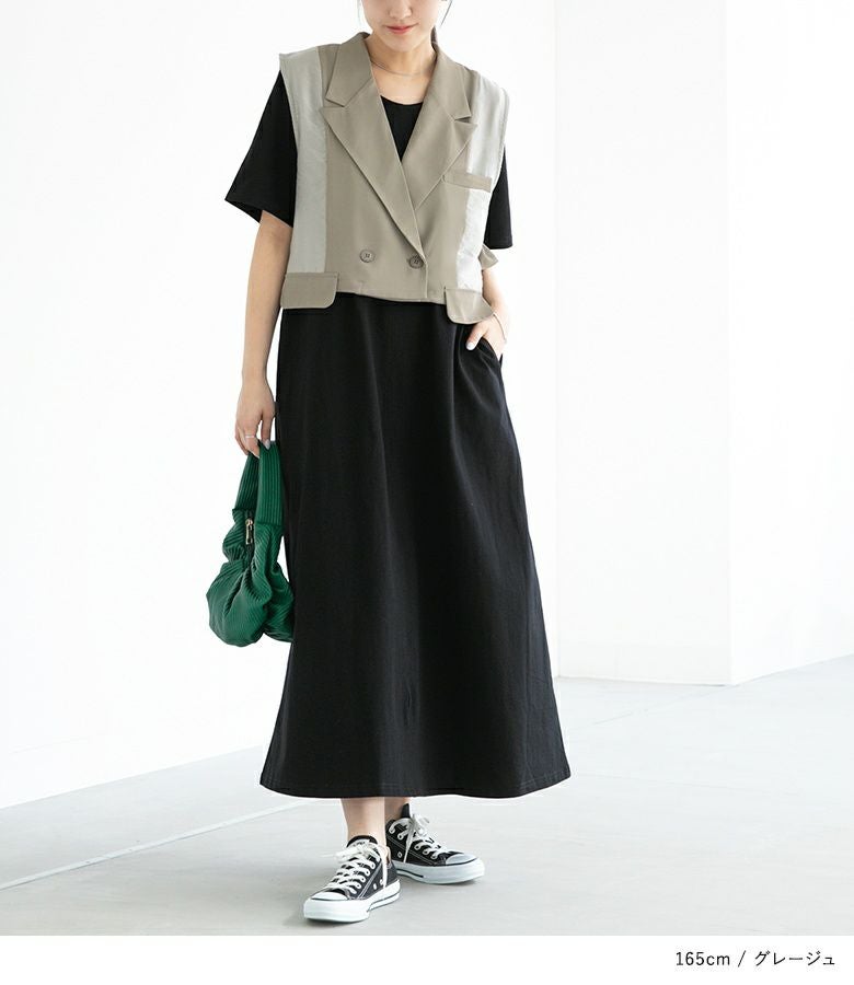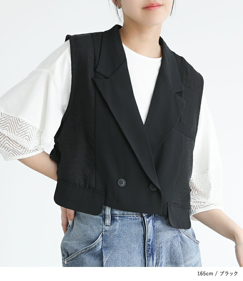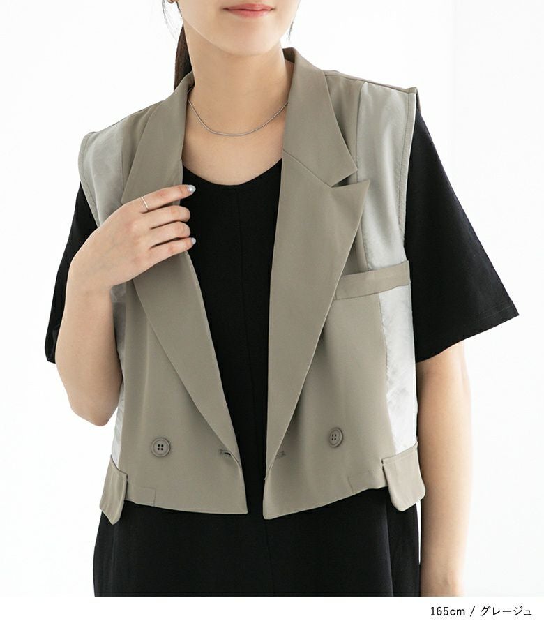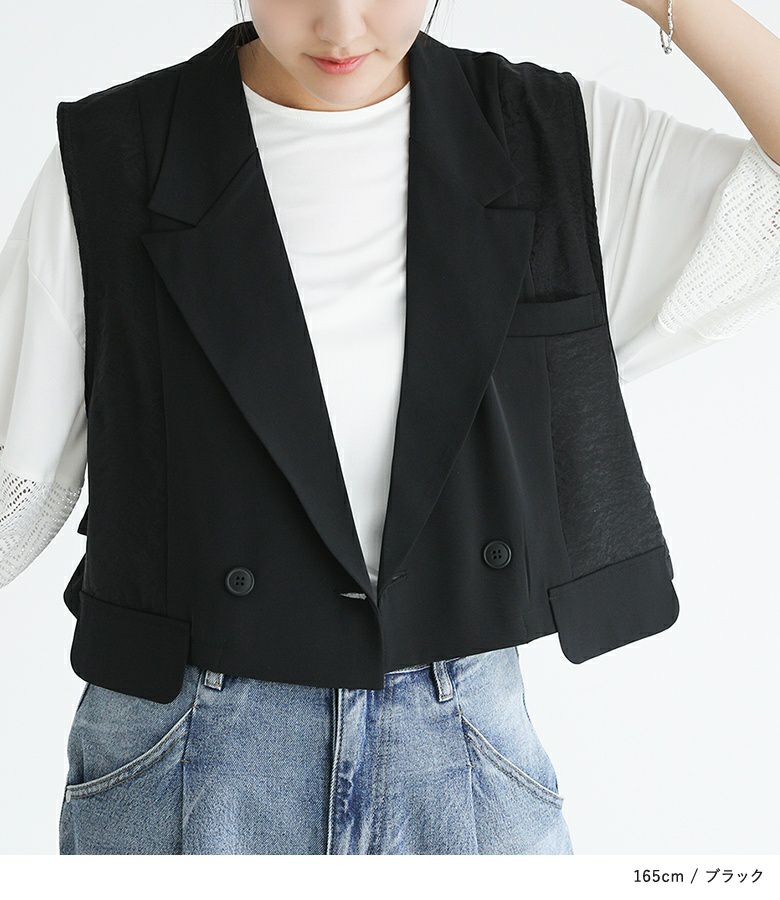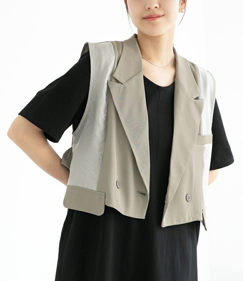 異素材の組み合わせがワンランク上のお洒落を演出し羽織るだけでガラッと印象が変わるベスト。ショート丈だからスタイルアップも叶えてくれます。
