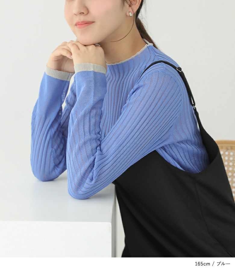 透け感でこなれ印象を惹き立てるシアーリブニット。首元と袖に施された配色ラインがアクセントとなり、さりげないおしゃれを演出します。インナーを合わせてトップスとしてはもちろん、ワンピースのインナーとしても活躍する万能アイテム。一枚でコーディネートを軽やかに彩ります。