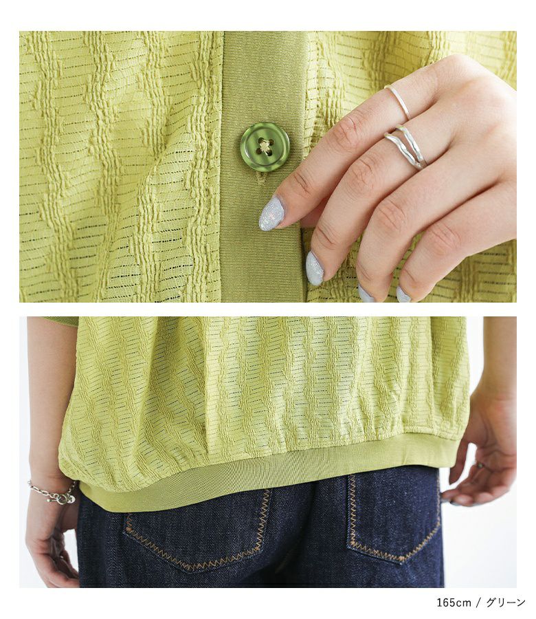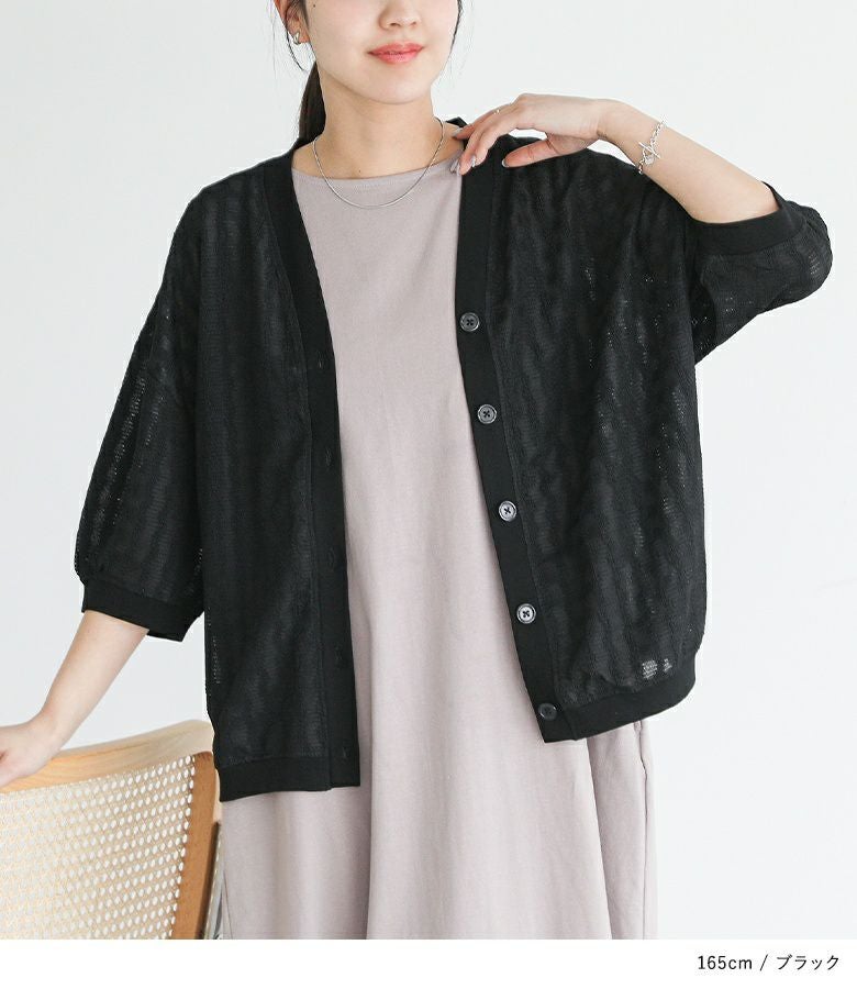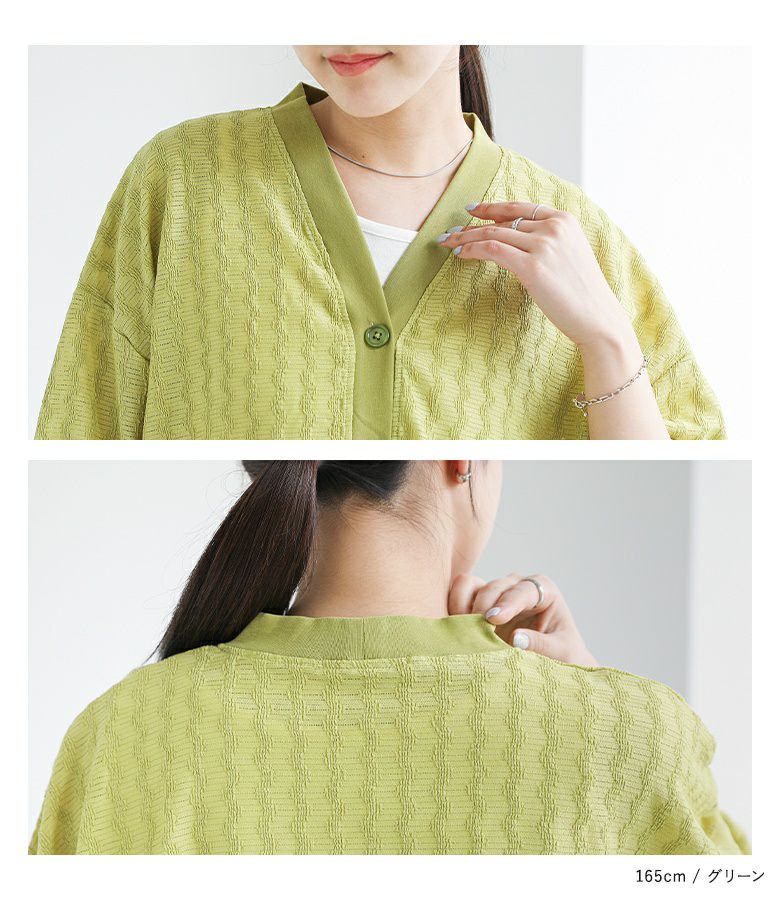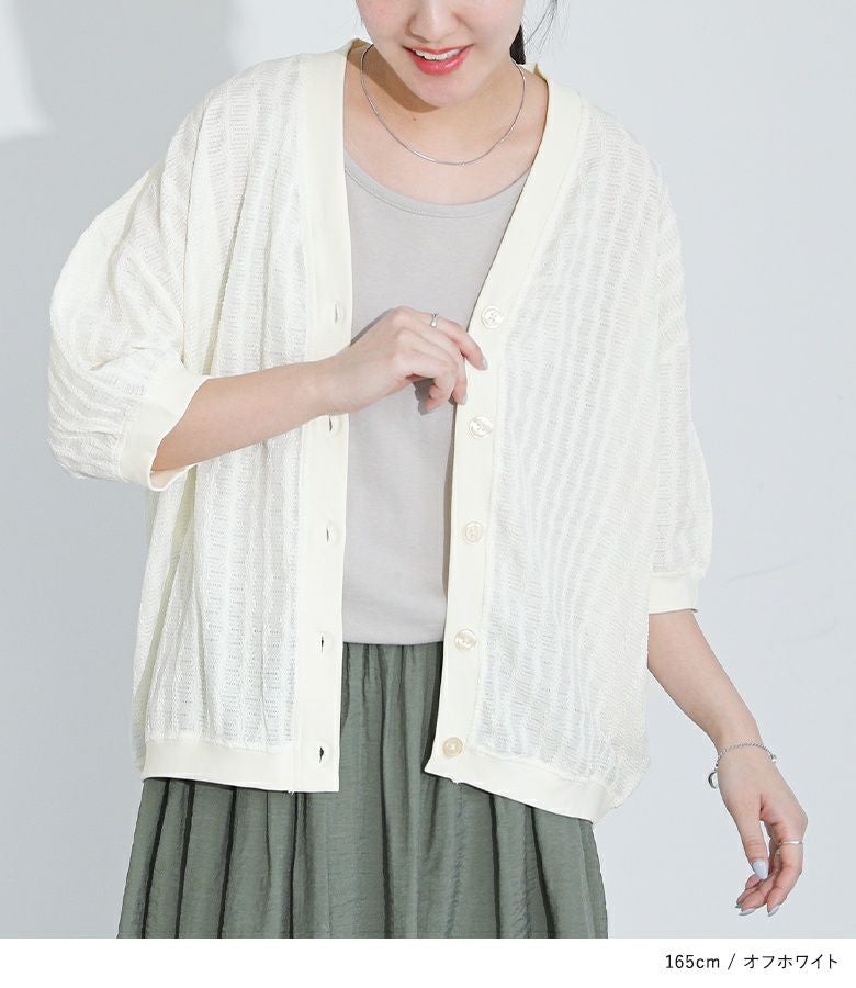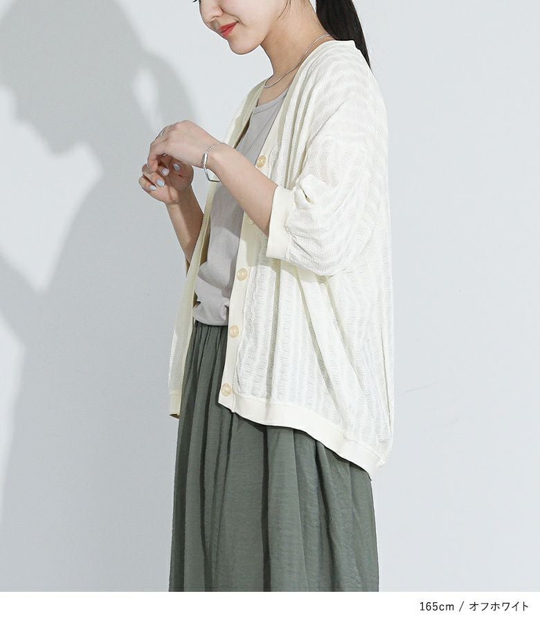 羽織りとしてはもちろん、トップスとしても着回せる万能カーディガン。きちんとキレイめな印象ながらも軽くてシワになりにくく、旅行やお出かけシーンの荷物にも取り入れやすいアイテム。凸凹とした表面感とシーズンムード高まるシアー素材がポイントです。