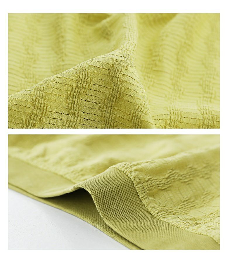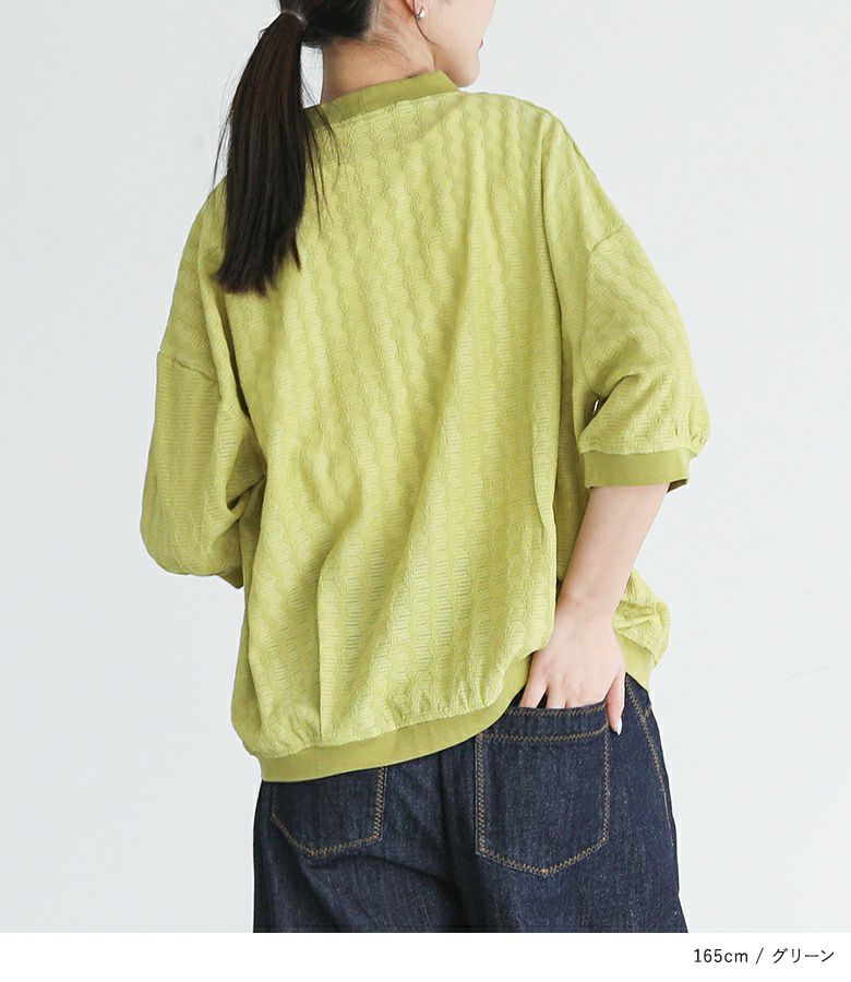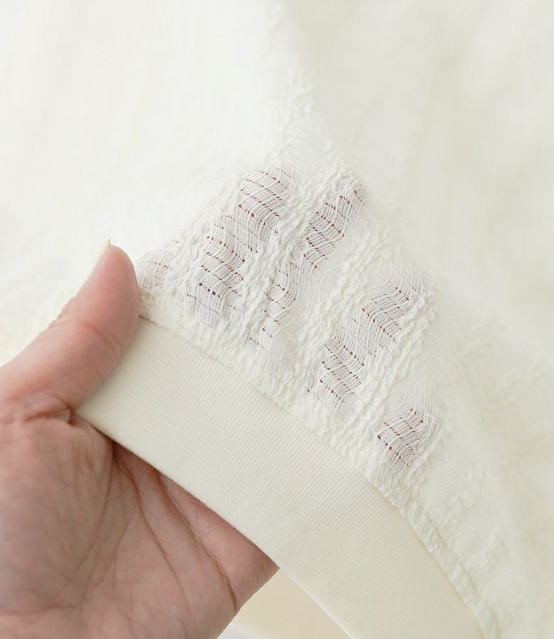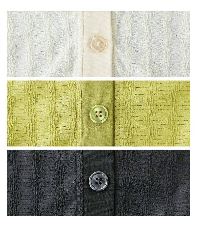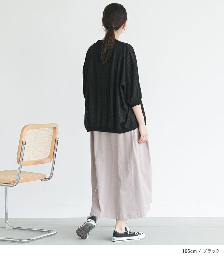 さらりとした着心地抜群のシアー素材。冷房対策としても活躍する程よい厚みです。やや伸縮性があり、シワになりにくくストレスフリーな素材感です。