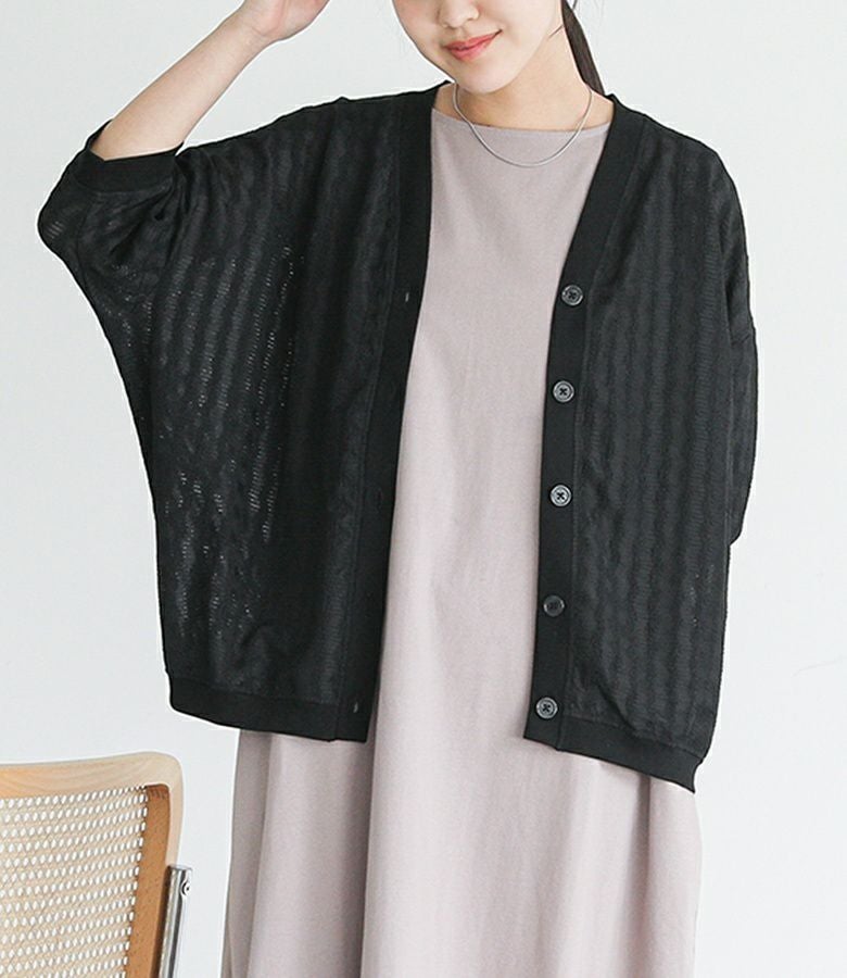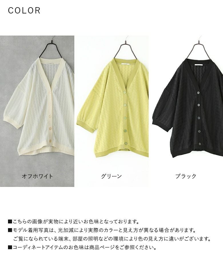 程よく肌を透かすシアー素材で大人見えするカーディガンなのでボトムを選ばずコーディネートが決まります。腕周りがゆったりシルエットで、ノースリーブやワンピーススタイルの軽めの羽織りとしても重宝します。