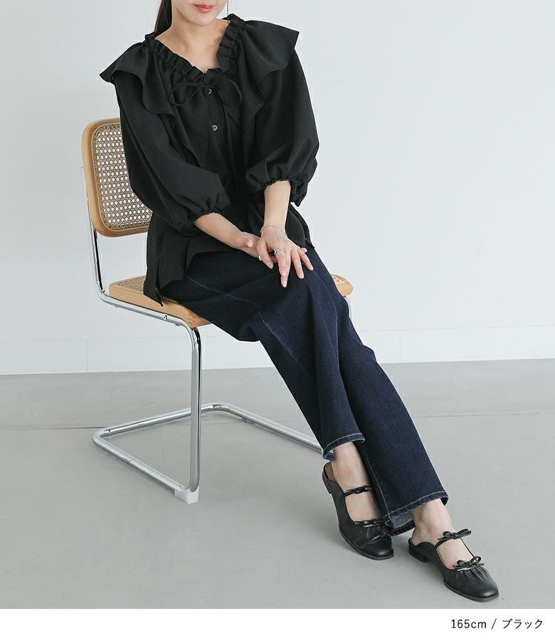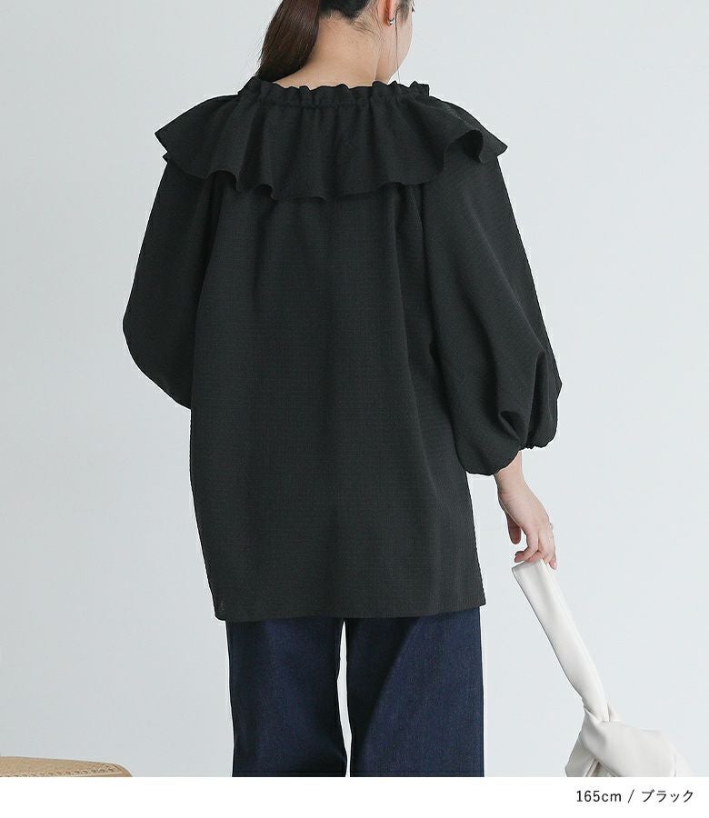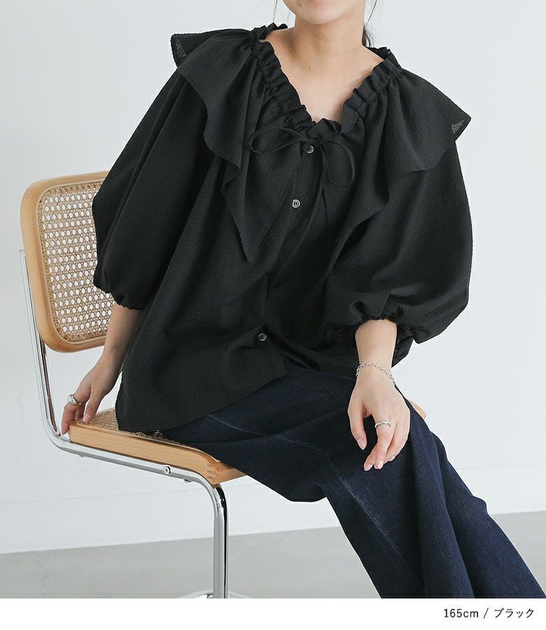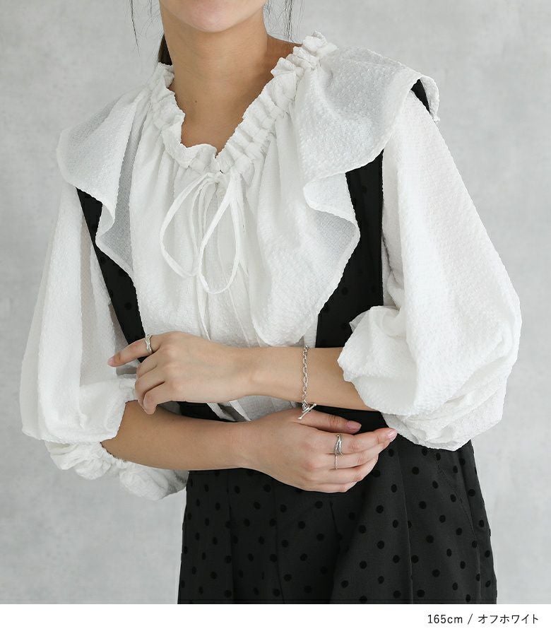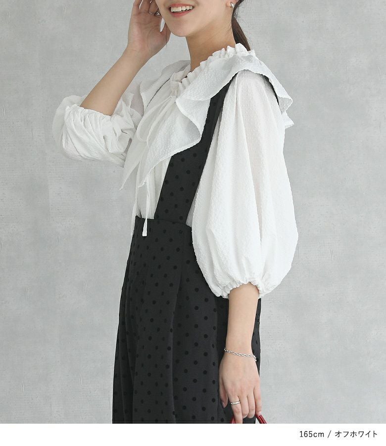 襟元の甘めなフリルがポイントになった、シアー感のあるブラウス。