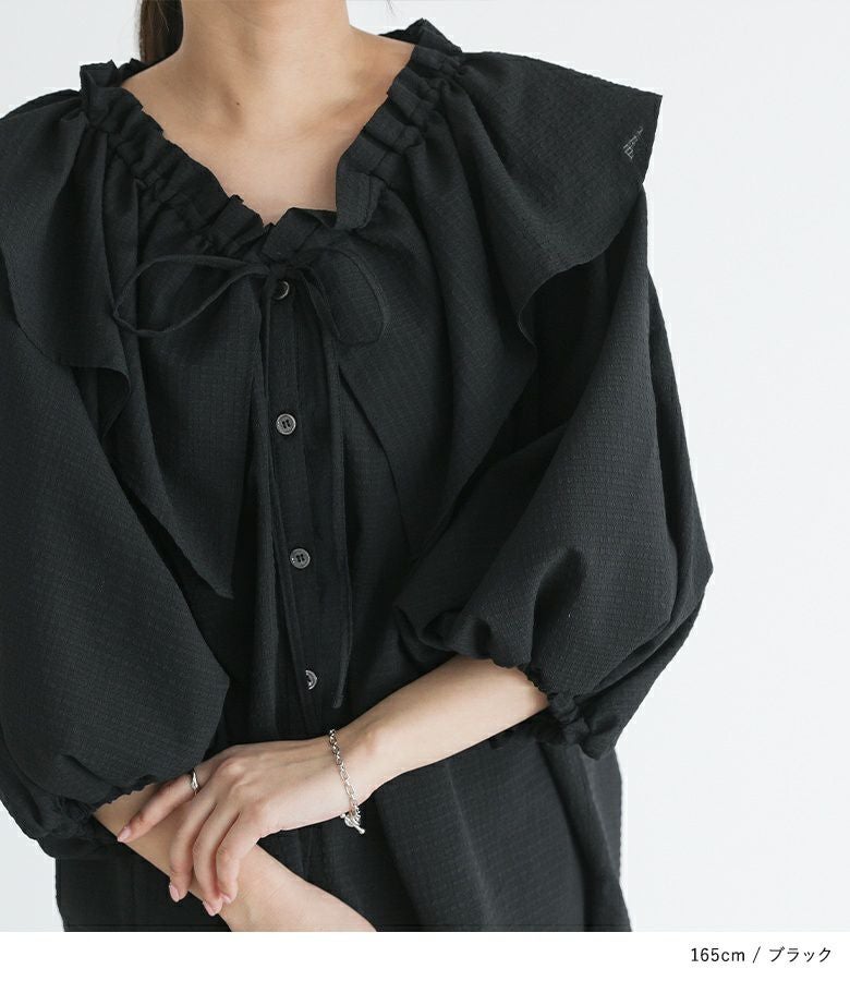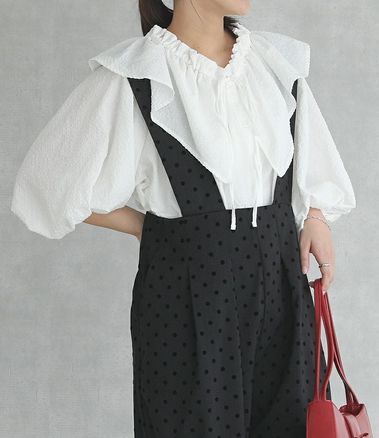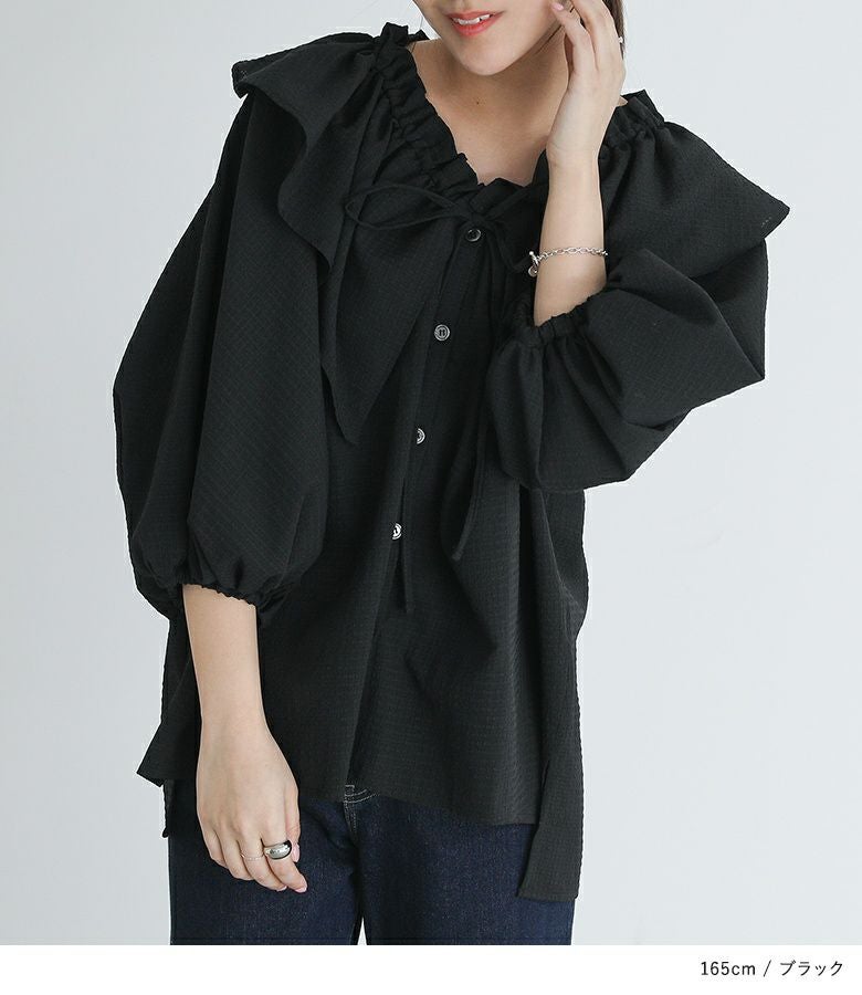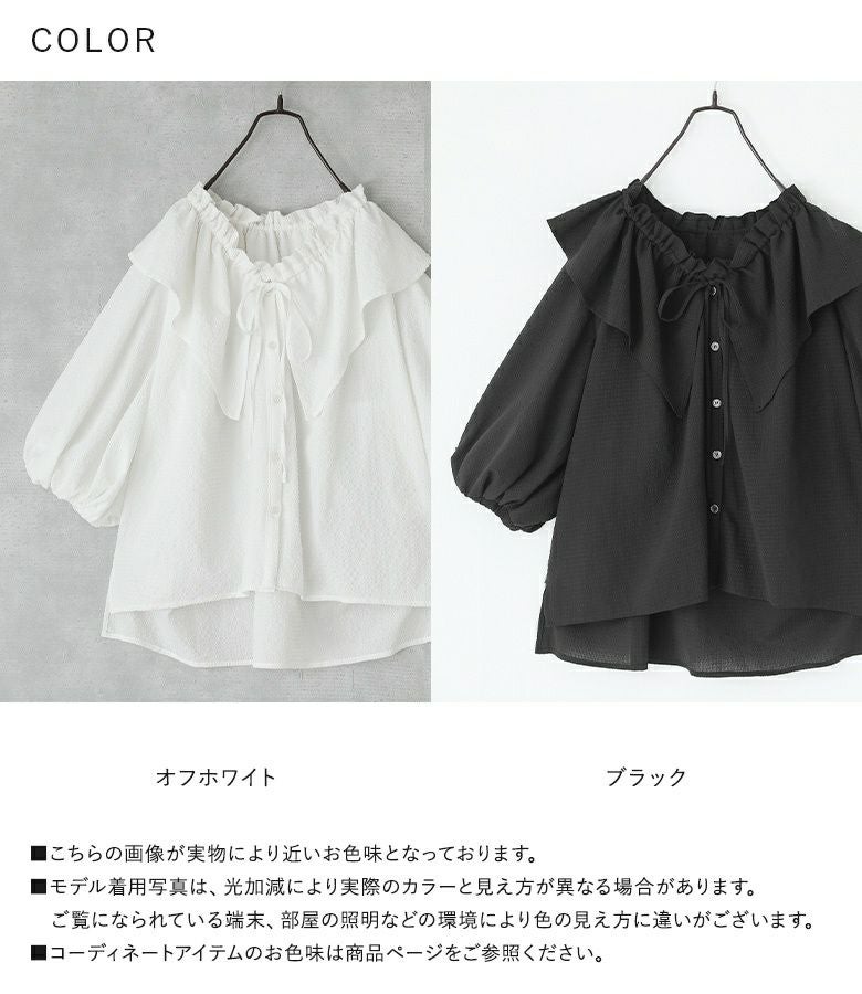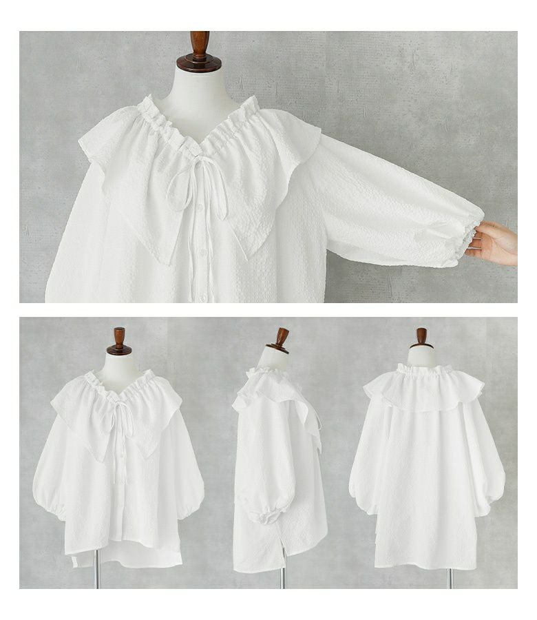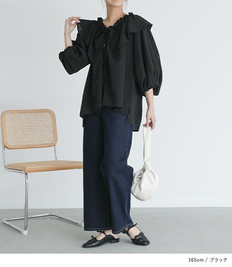 襟元の甘めなフリルがポイントになった、シアー感のあるブラウス。