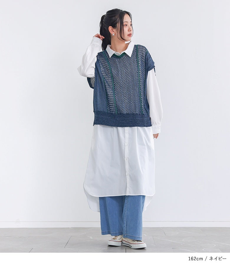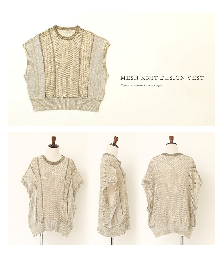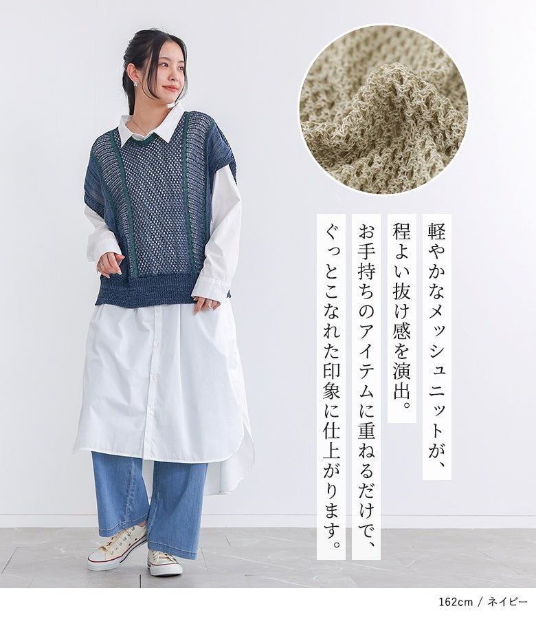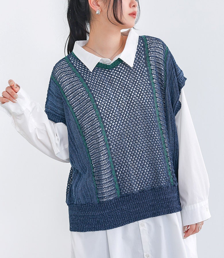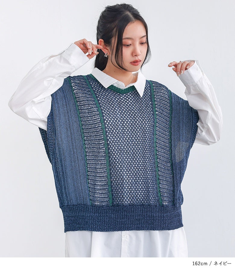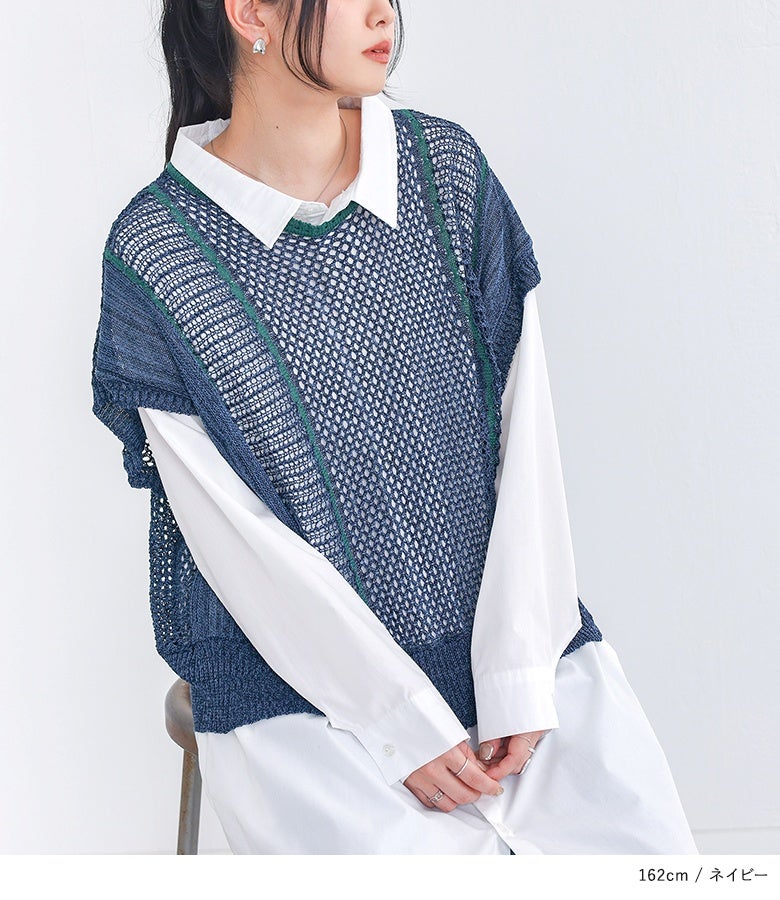 こなれた印象に仕上がる配色LINE入りメッシュ編みベスト。