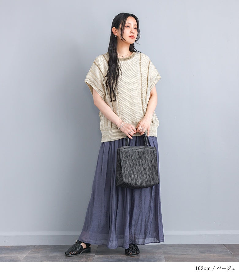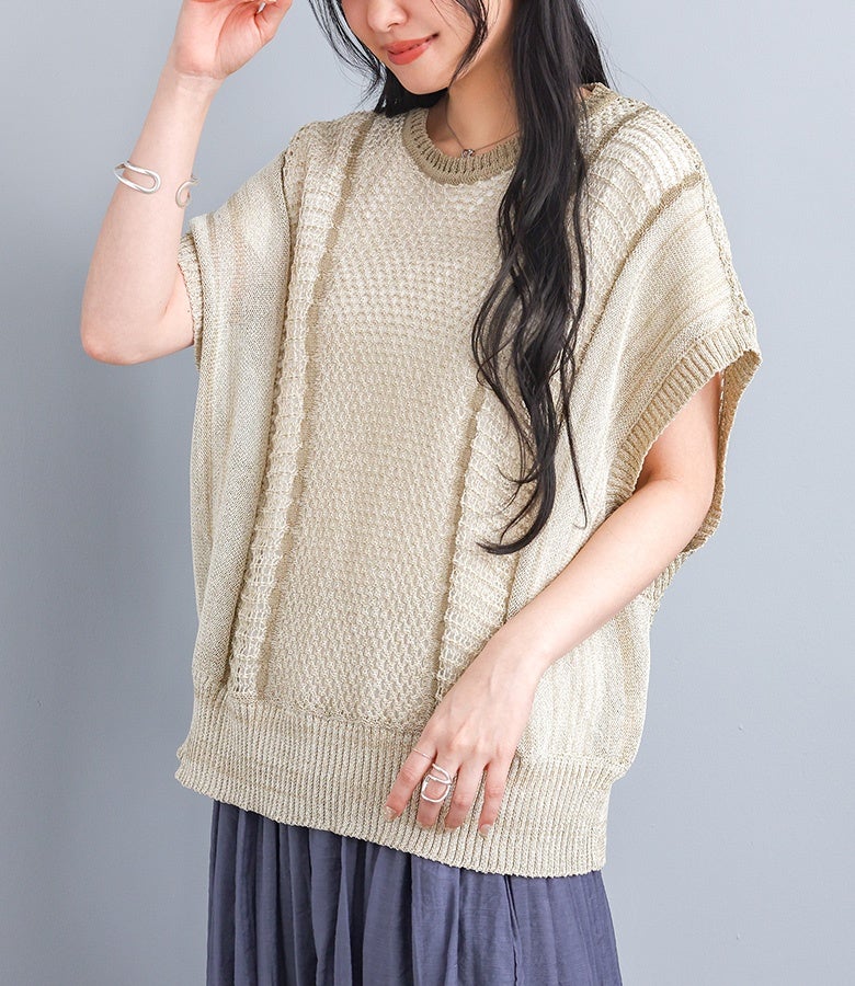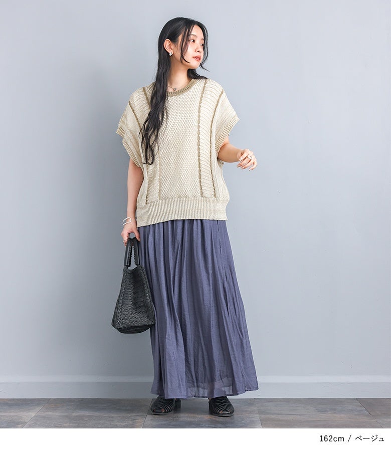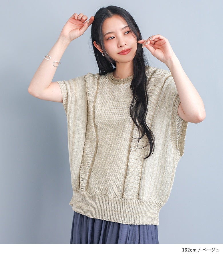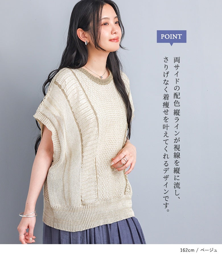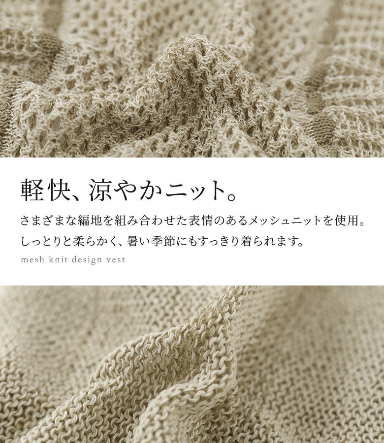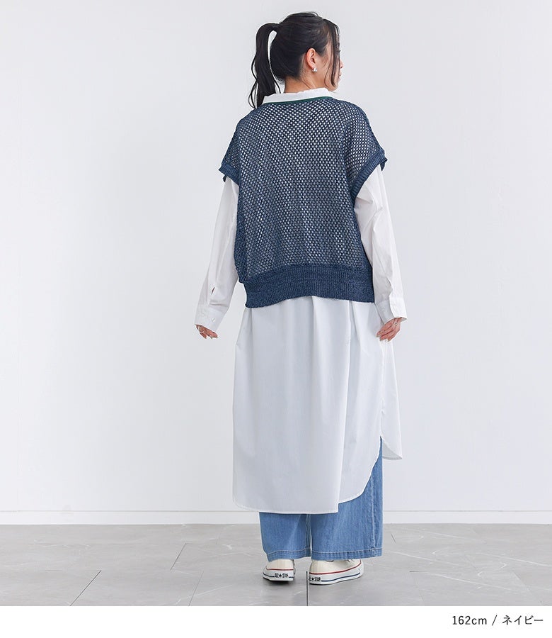 こなれた印象に仕上がる配色LINE入りメッシュ編みベスト。
