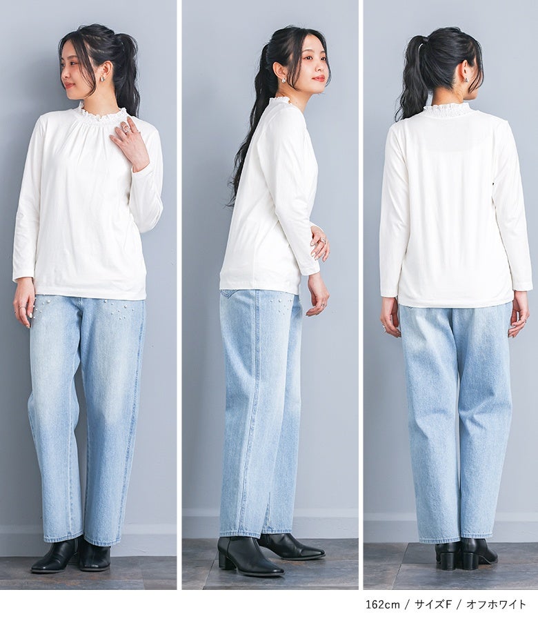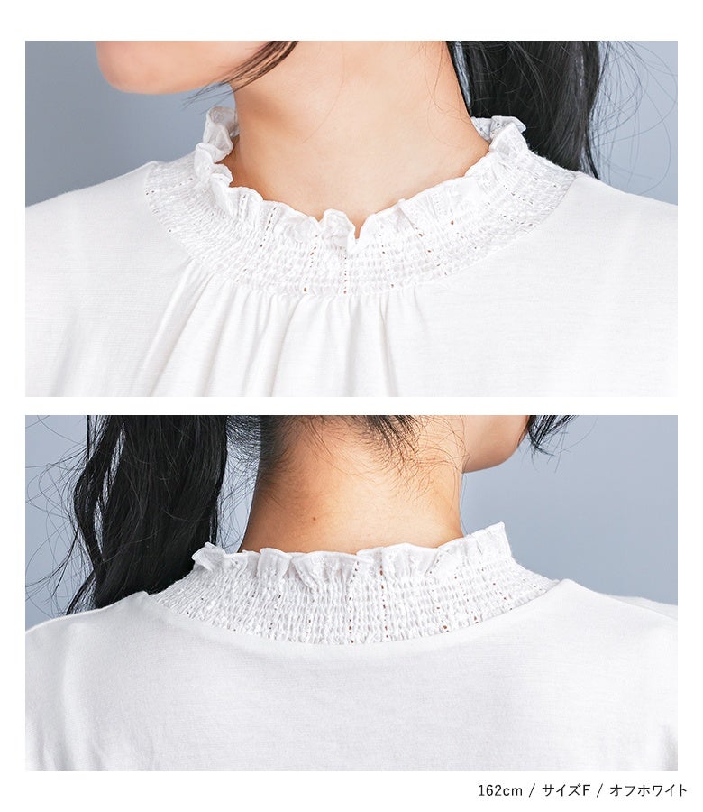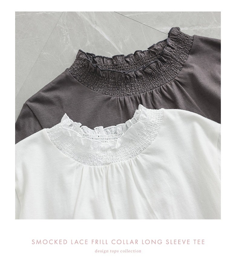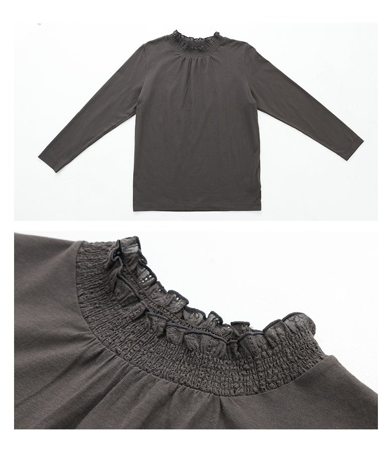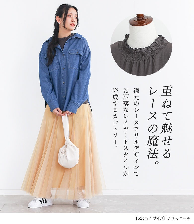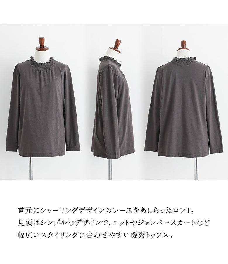選べる2サイズ展開!コーデが見違える襟シャーリングレースフリルロンT。