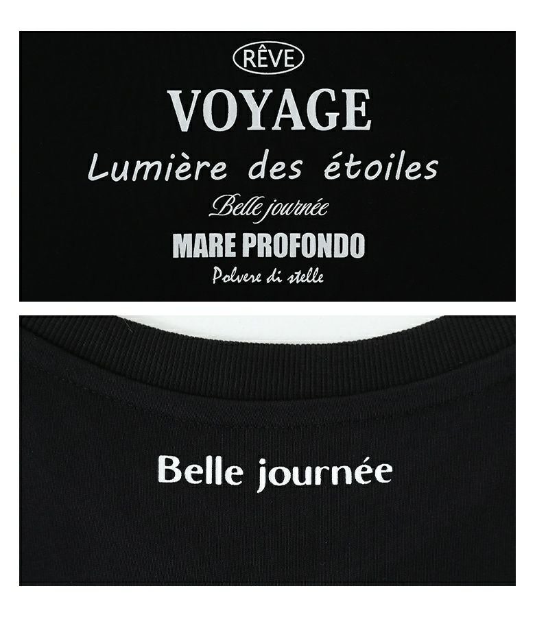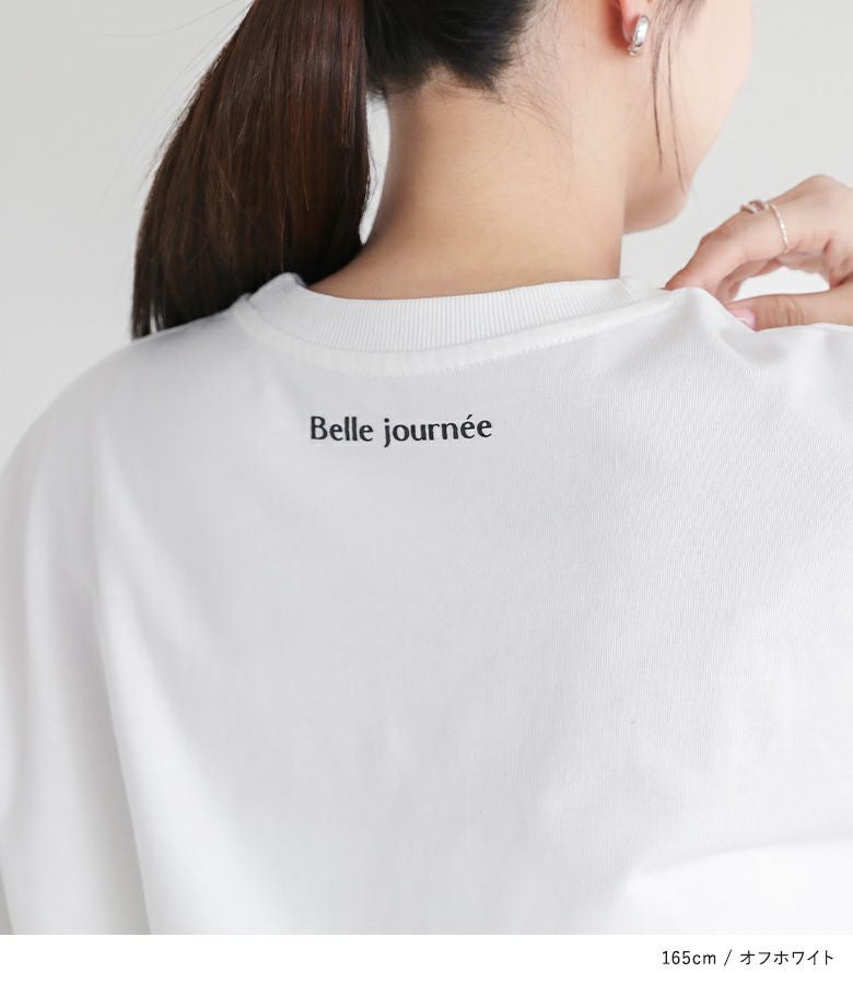 前身頃と後ろ襟元付近にあしらったロゴプリントがアクセントなデザインTシャツ。