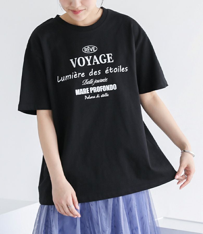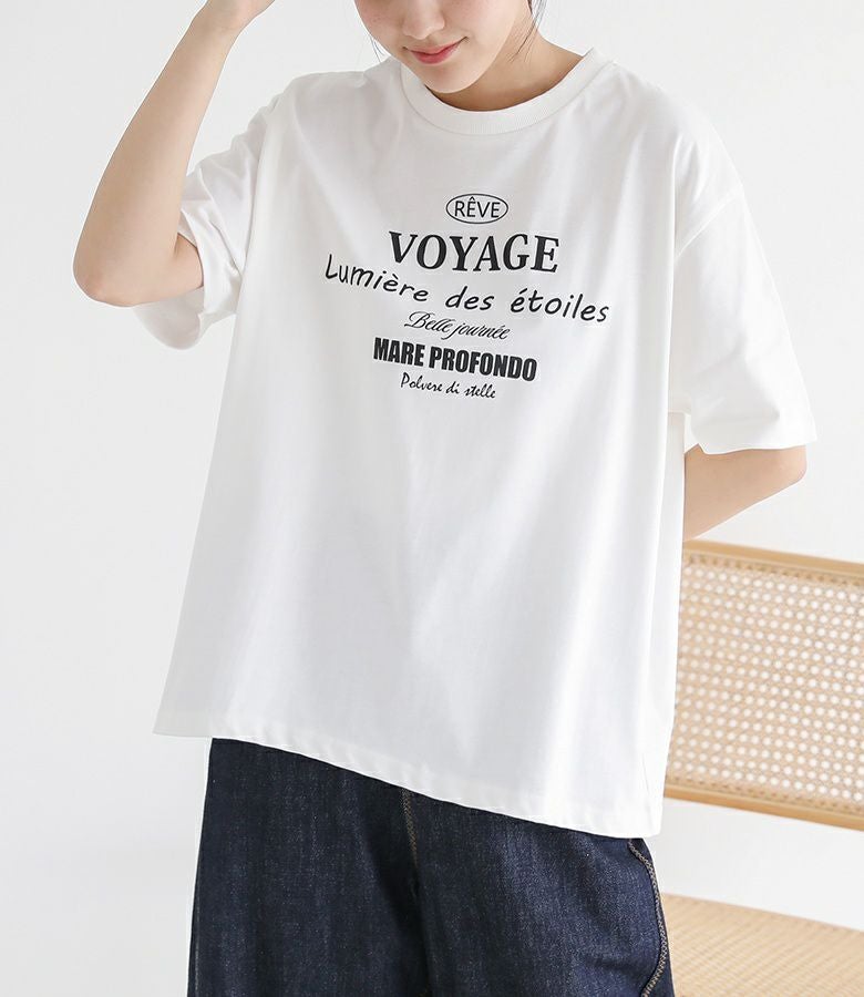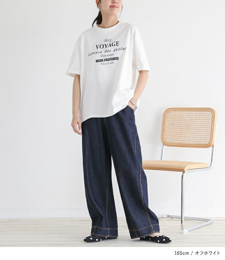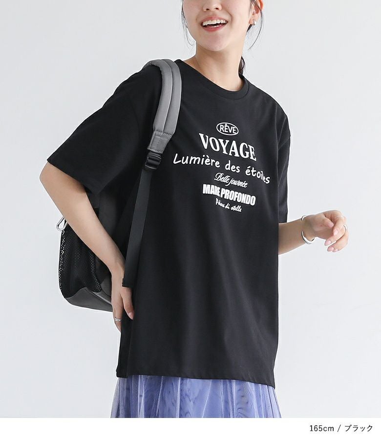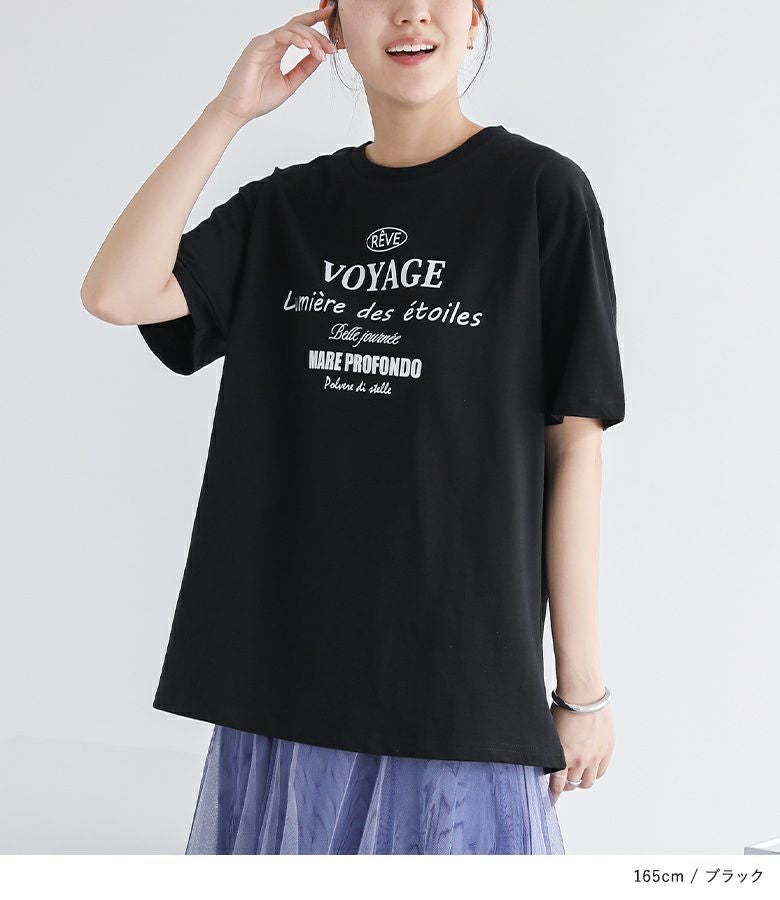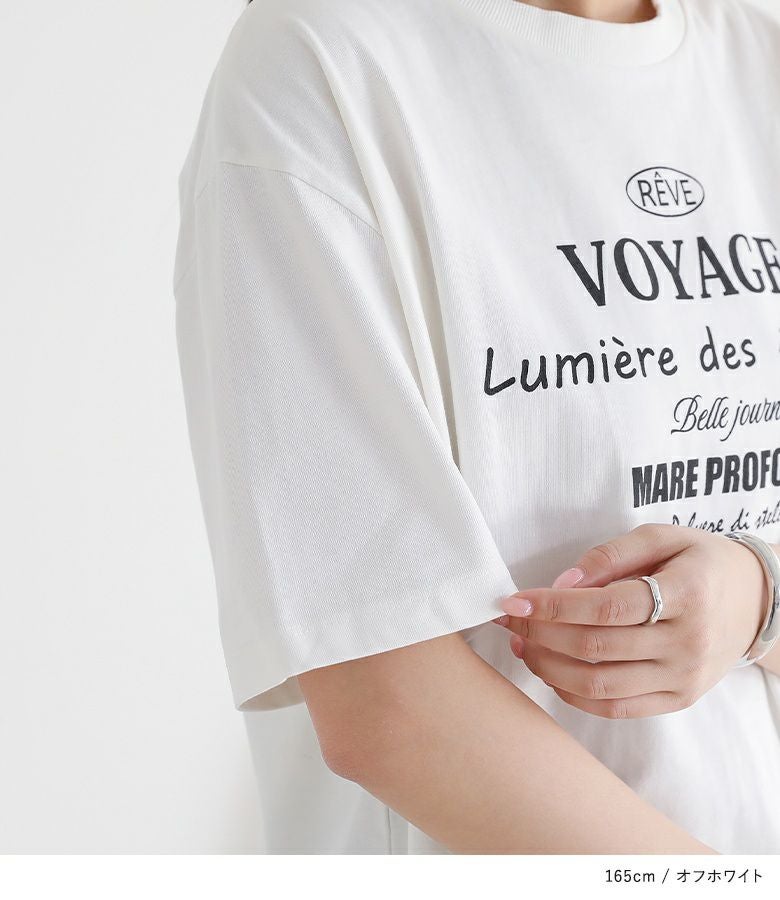前身頃と後ろ襟元付近にあしらったロゴプリントがアクセントになったデザインTシャツ。ゆるっとしたシルエットながらも、身幅は広がりすぎず、すっきりと着こなせるのが魅力です。袖丈長めのデザインで、二の腕カバーが叶うのも嬉しいポイント。